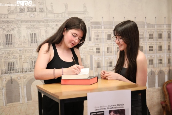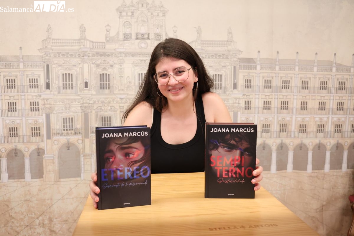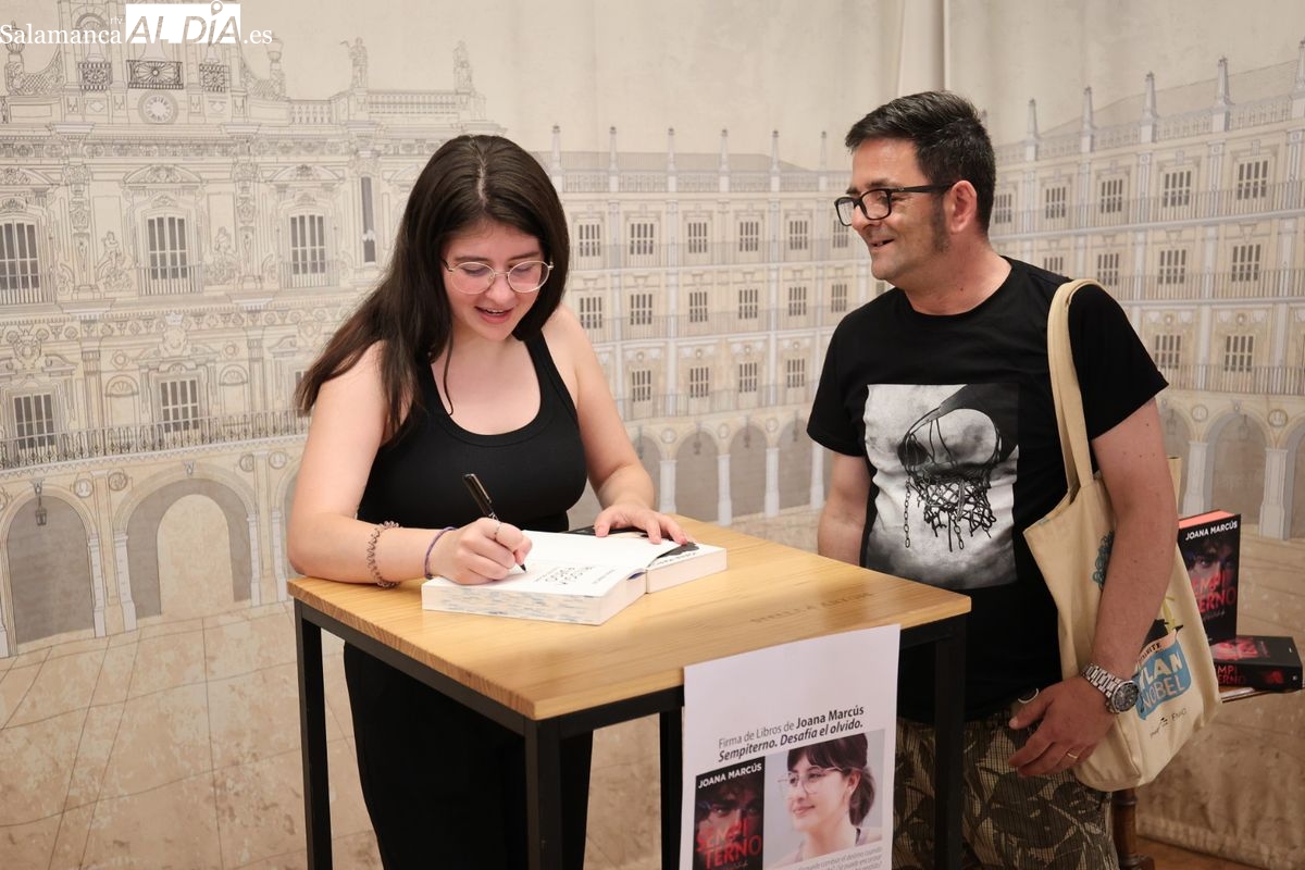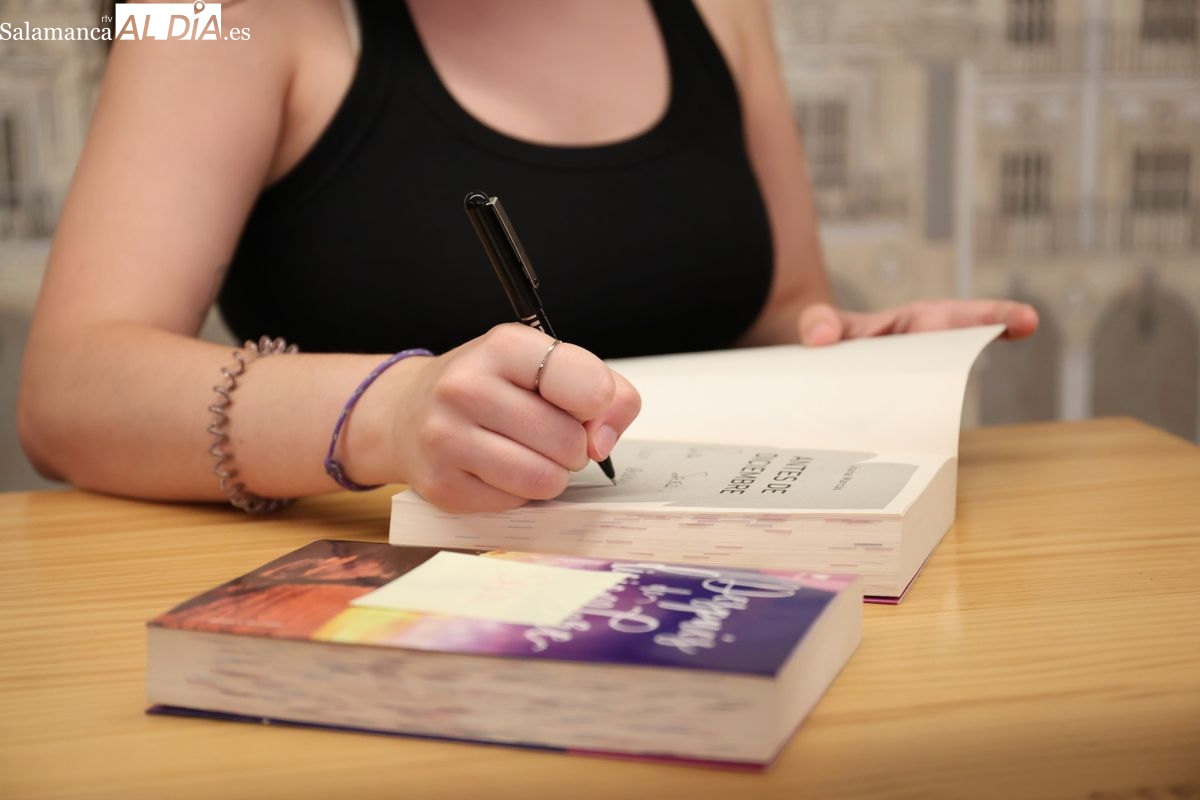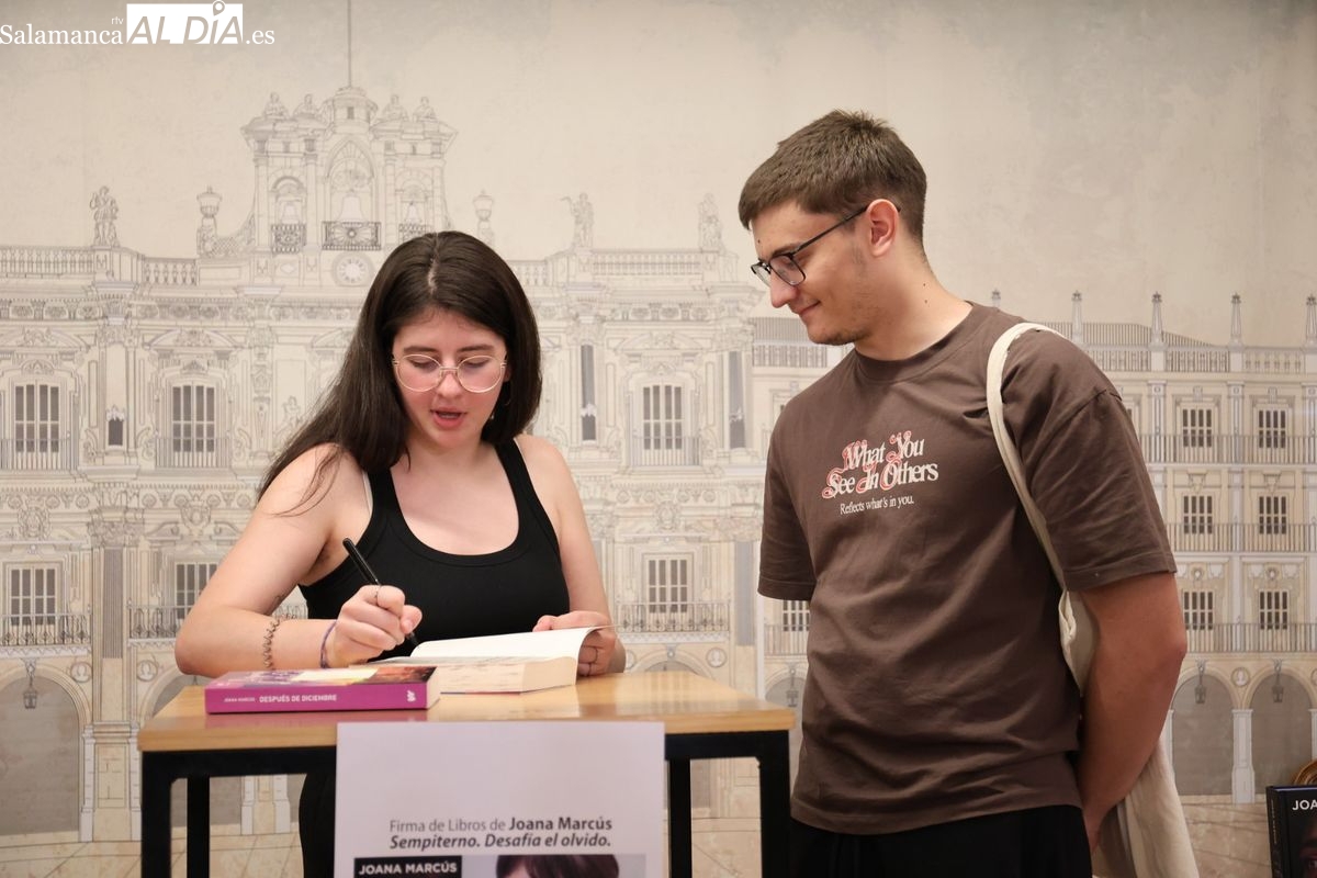 La Librería Santos Ochoa, ubicada en Gran Vía de Salamanca, ha sido el escenario donde este martes la joven y exitosa autora Joana Marcús ha firmado ejemplares de su más reciente novela, 'Sempiterno'. Numerosos lectores, principalmente jóvenes, se han dado cita para conocer a la escritora.