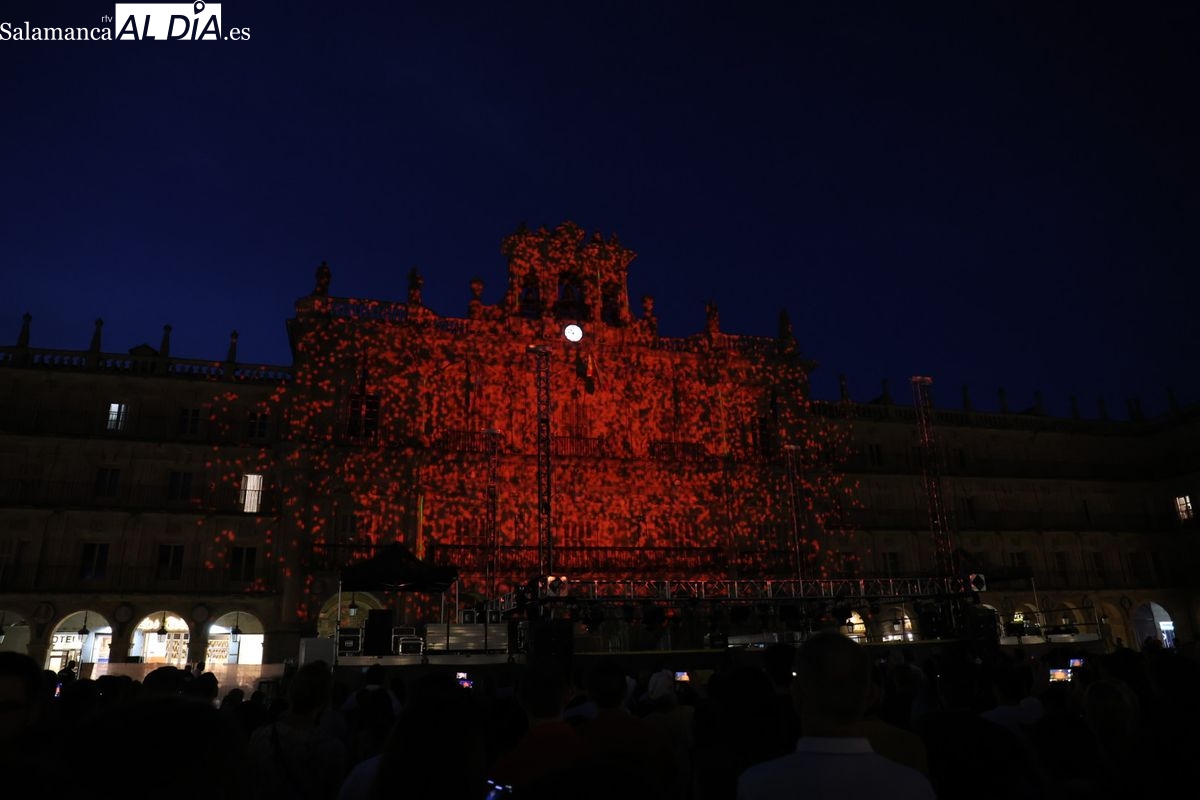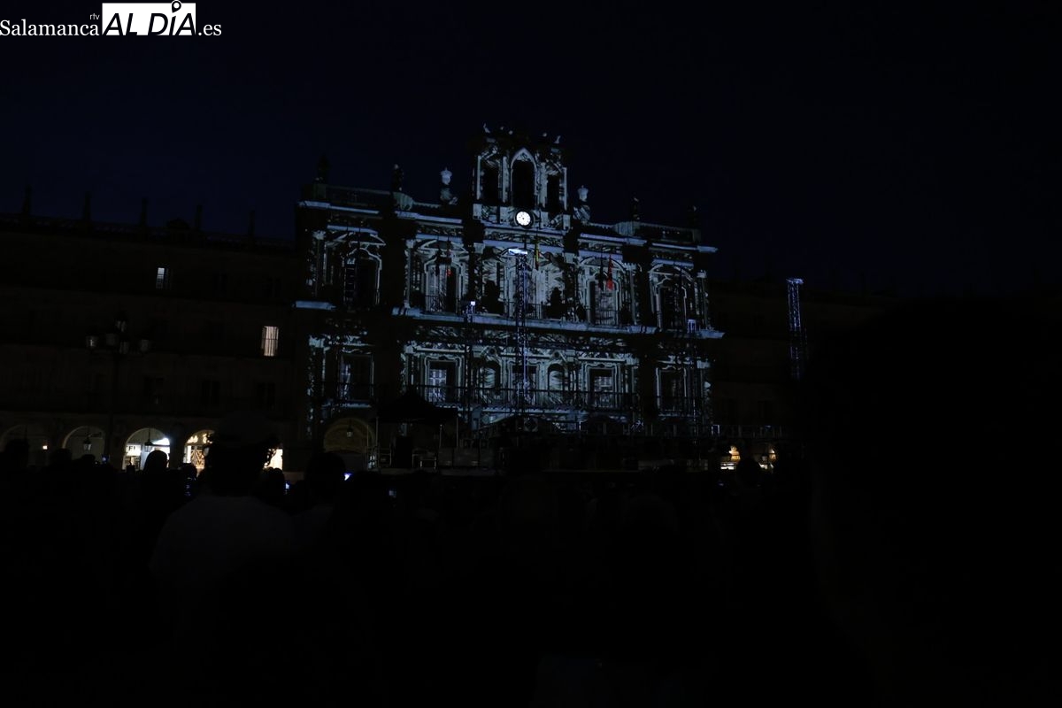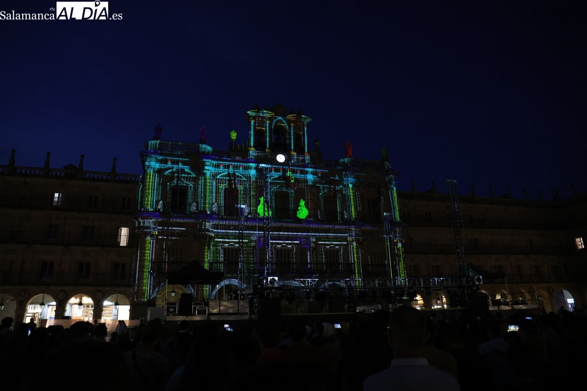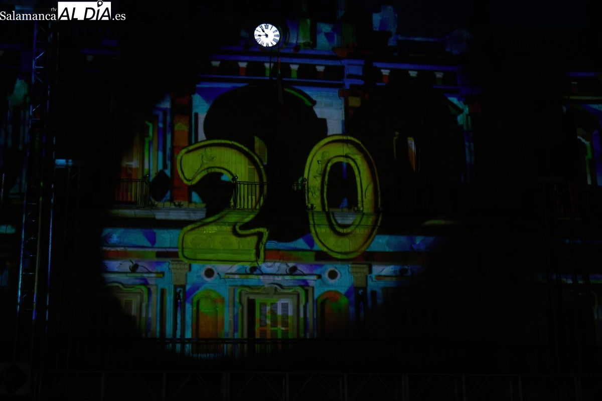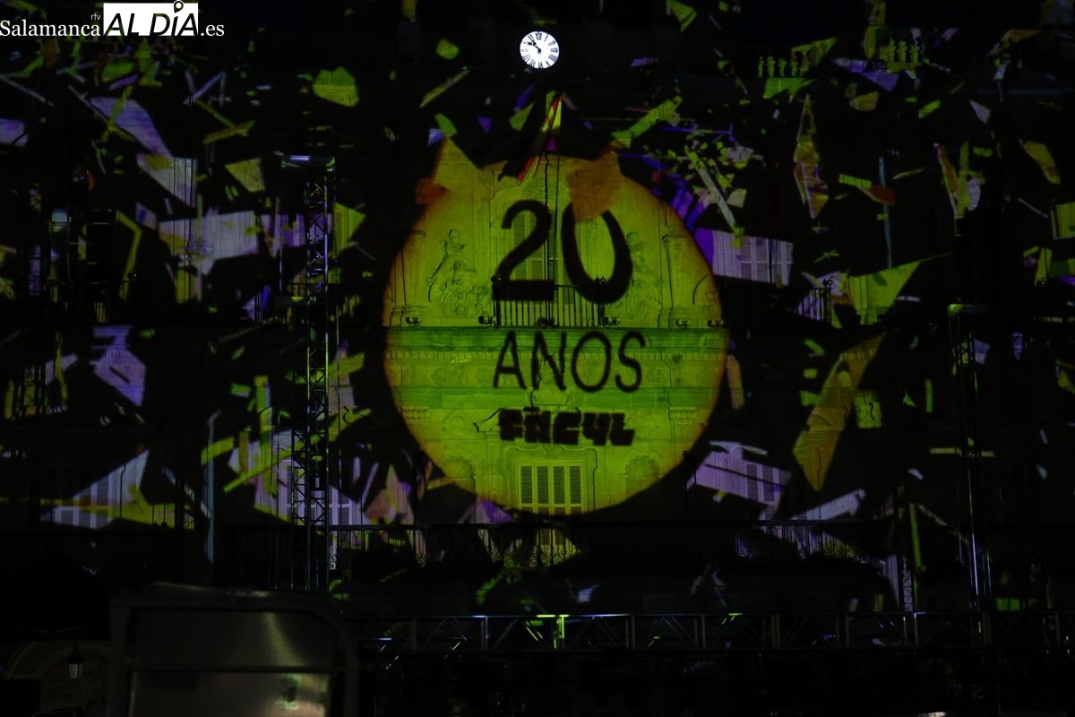 Intensa noche del miércoles en Salamanca con la magia del FÀCYL 2025, que incluyó una espectacular proyección que convirtió la histórica piedra del Ayuntamiento en un lienzo digital vibrante. El videomapping, obra de la empresa leonesa Más, Multimedia Álvaro y Sara, fue una auténtica celebración de los # 20 Aniversario del FÀCYL. Este colectivo, dedicado al mundo audiovisual con experiencia en cortometrajes, publicidad, videoclips y, de forma destacada, al videoarte y videomapping, fue galardonado con el premio a la trayectoria audiovisual 2022, concedido por el festival de nuevas tecnologías aplicadas a las artes escénicas, MappingMe!
