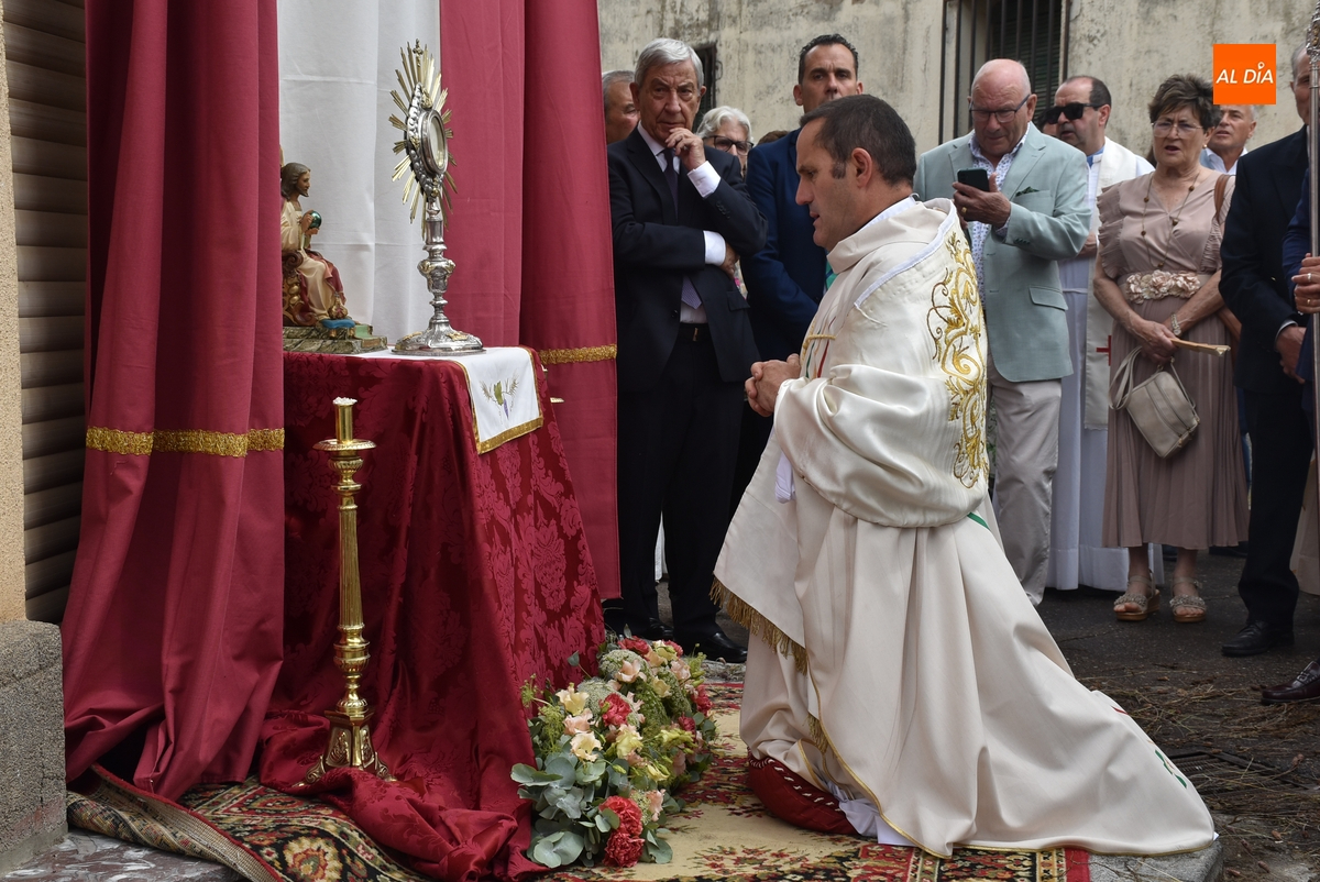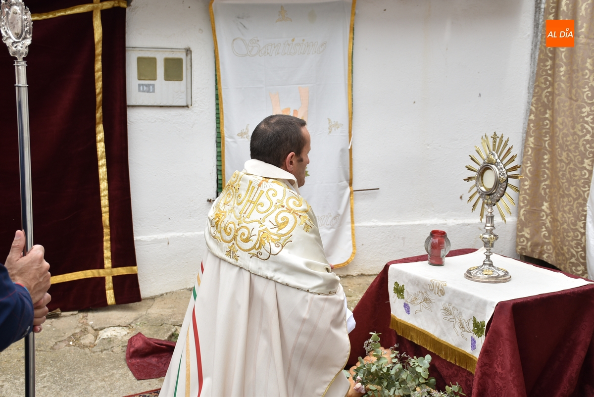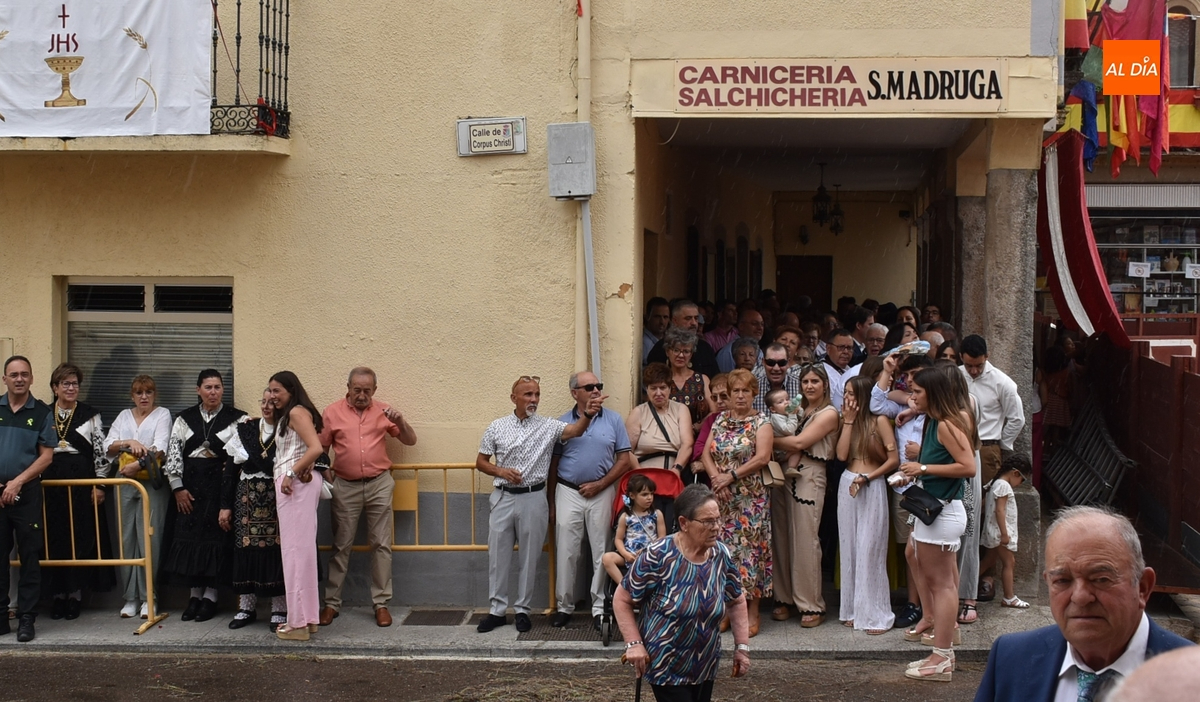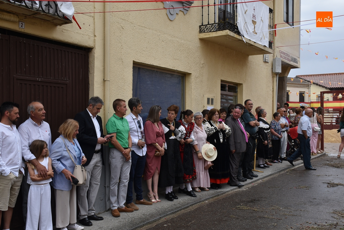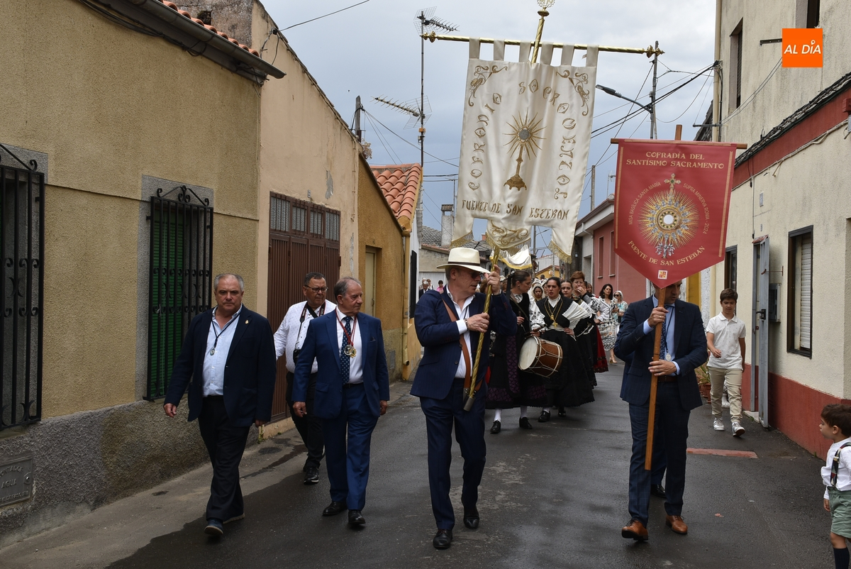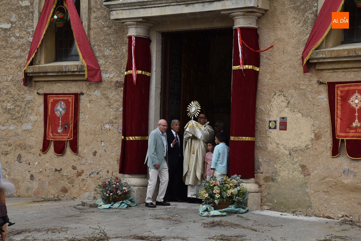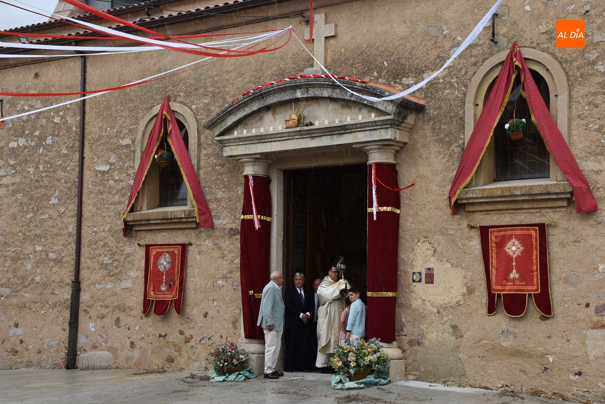 Eso hizo que las integrantes del Grupo de Baile Charro de La Fuente de San Esteban que ya estaban dispuestas para procesionar deshiciesen su formación, y que el Santísimo Sacramento únicamente se llegase a asomar a la puerta del templo en manos del párroco, Anselmo Matilla, quién volvió hacia el interior para llevar a cabo unas oraciones durante varios minutos confiando en que cesase la lluvia, lo que ocurrió.