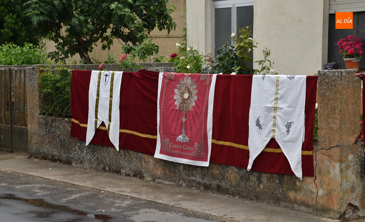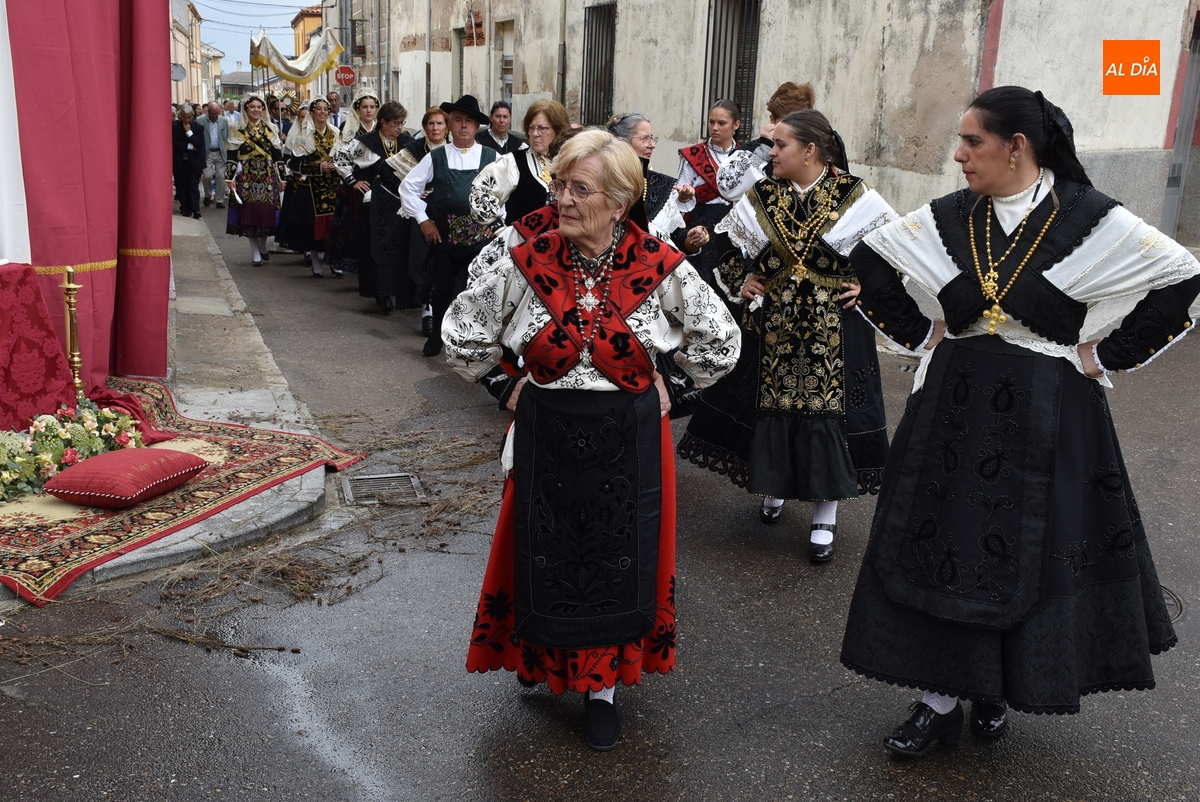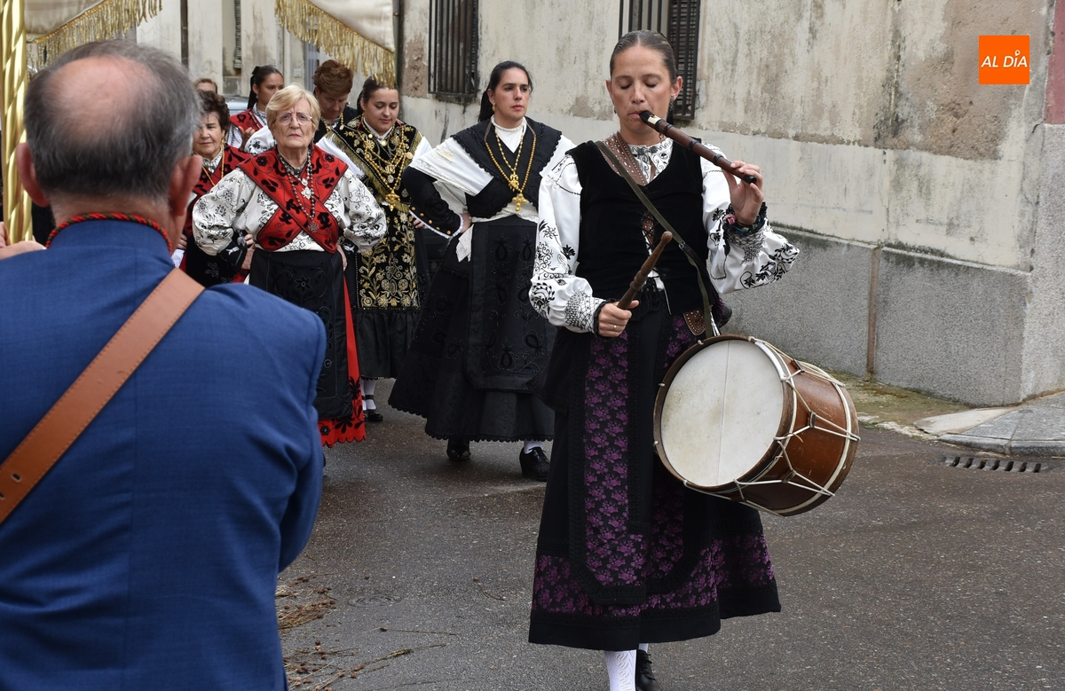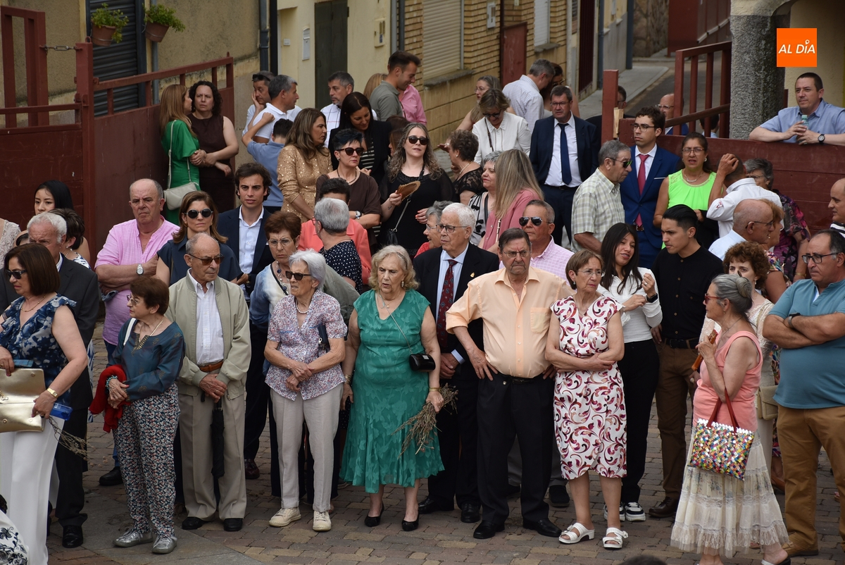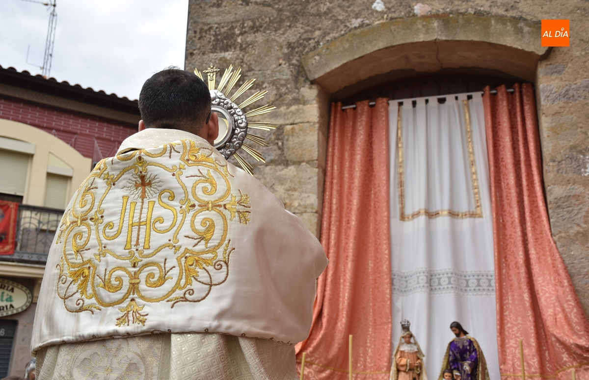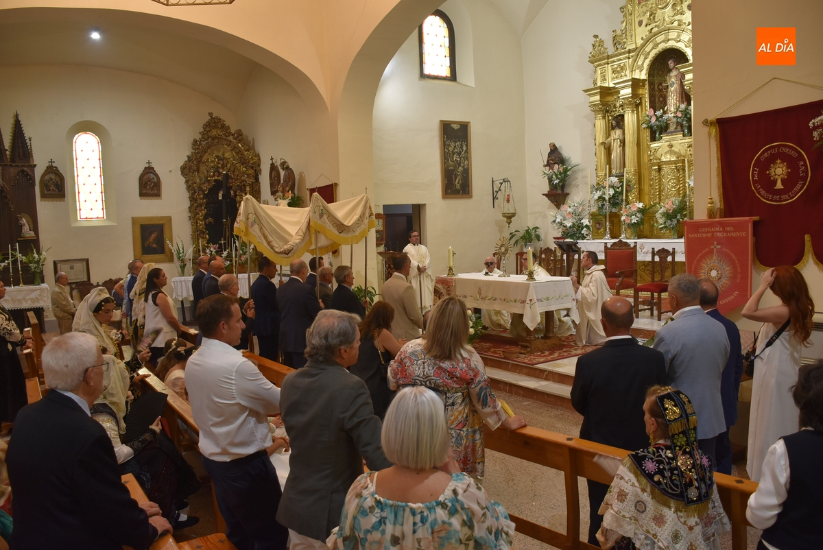 Eso hizo que las integrantes del Grupo de Baile Charro de La Fuente de San Esteban que ya estaban dispuestas para procesionar deshiciesen su formación, y que el Santísimo Sacramento únicamente se llegase a asomar a la puerta del templo en manos del párroco, Anselmo Matilla, quién volvió hacia el interior para llevar a cabo unas oraciones durante varios minutos confiando en que cesase la lluvia, lo que ocurrió.