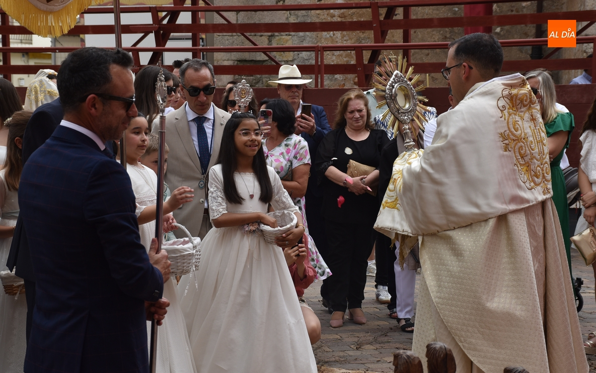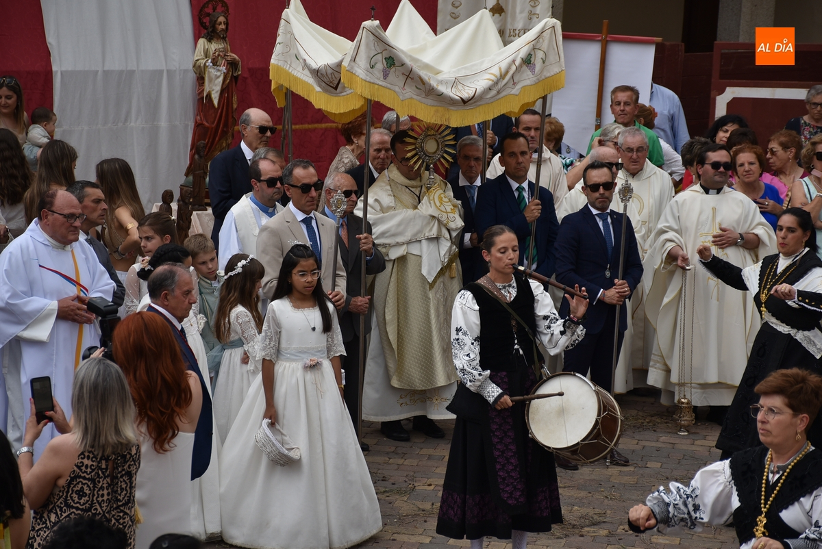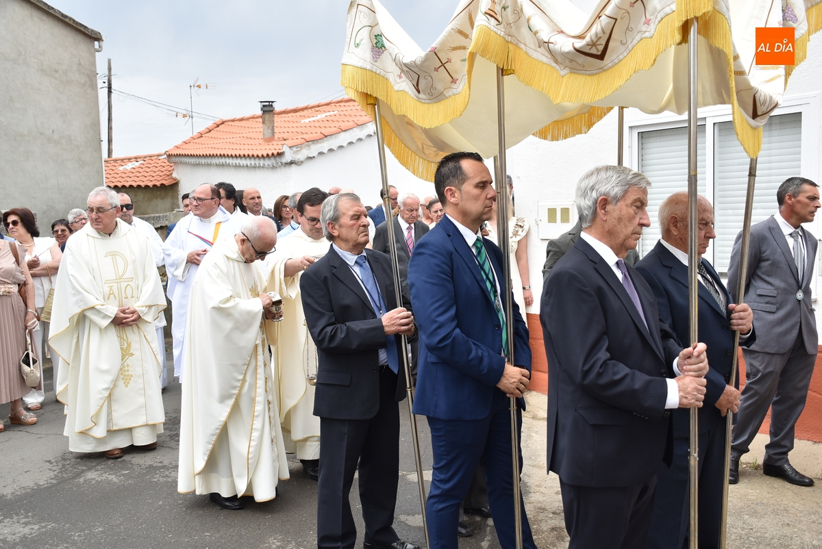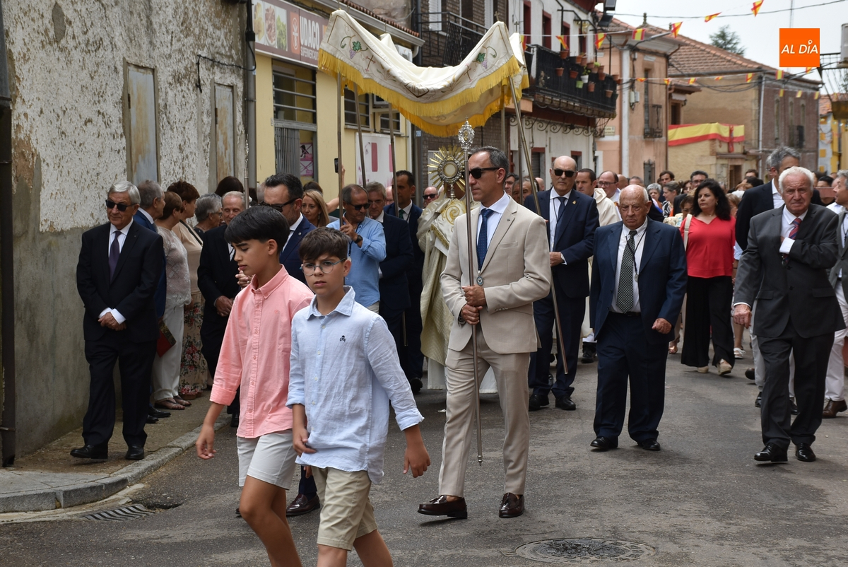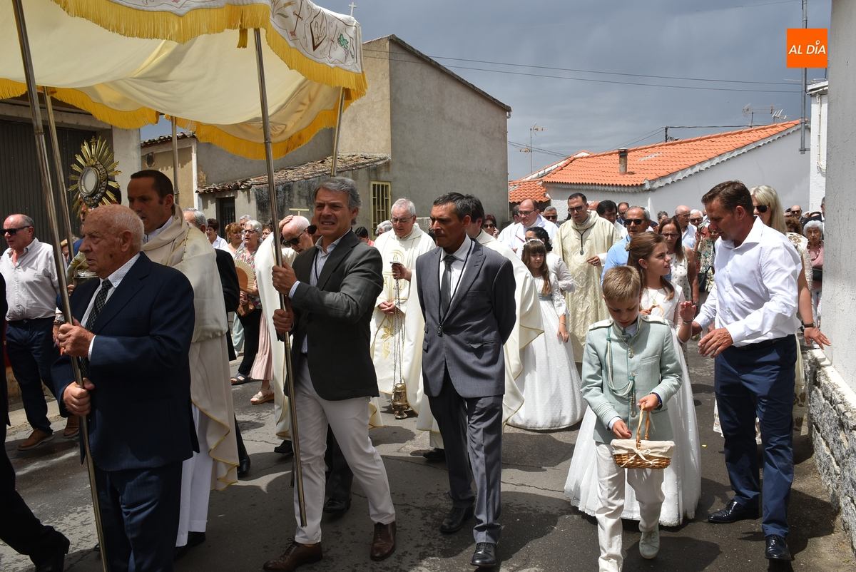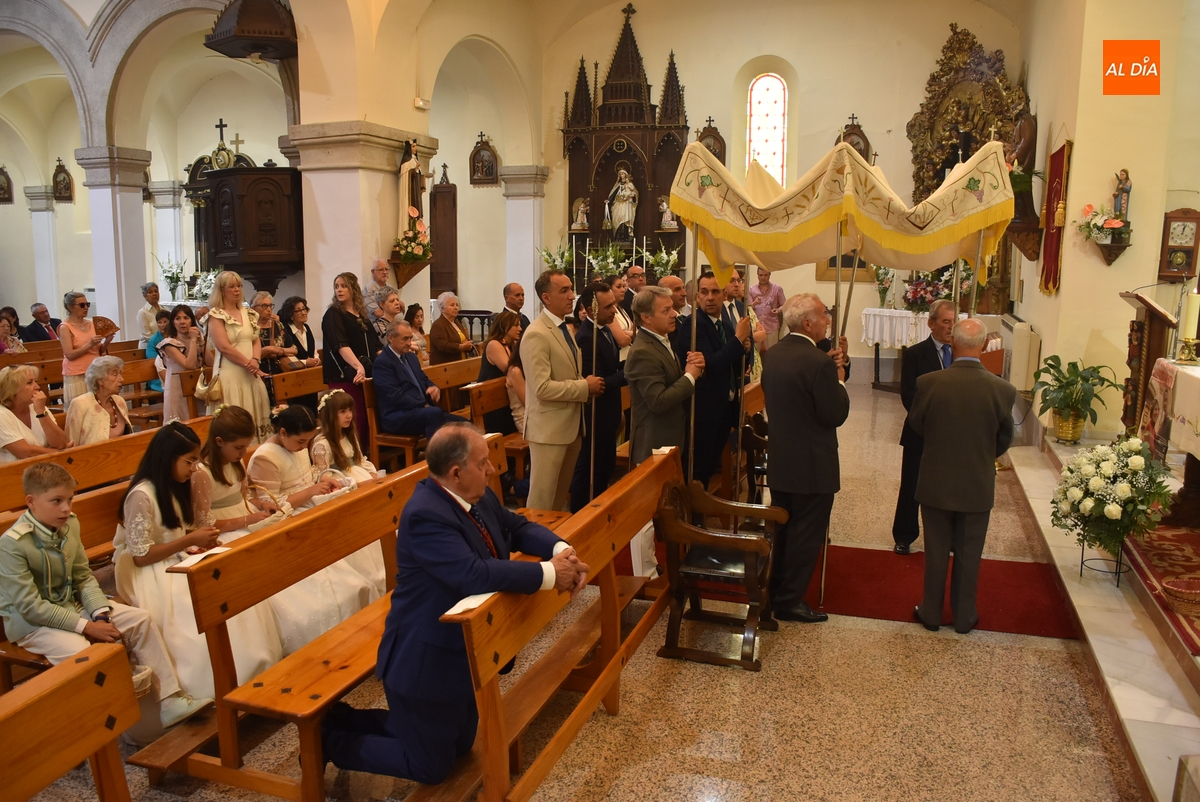Así, la procesión pudo ponerse en marcha, encabezada por los estandartes distintivos del Corpus, a quiénes seguían las integrantes del Grupo de Baile Charro, cinco niños (4 niñas y un niño) que han tomado la Primera Comunión esta primavera en La Fuente de San Esteban, y los mayordomos de la celebración, Juan Ignacio García Rodríguez y Manuel Gallego Díez, quienes iban portando las varas. Tras ellos iba bajo palio el Santísimo Sacramento, arropado por unos cuantos sacerdotes encabezados por Anselmo Matilla.