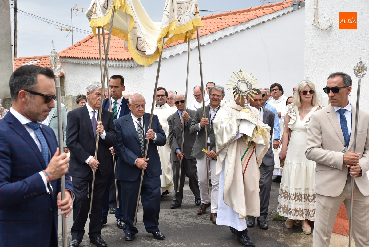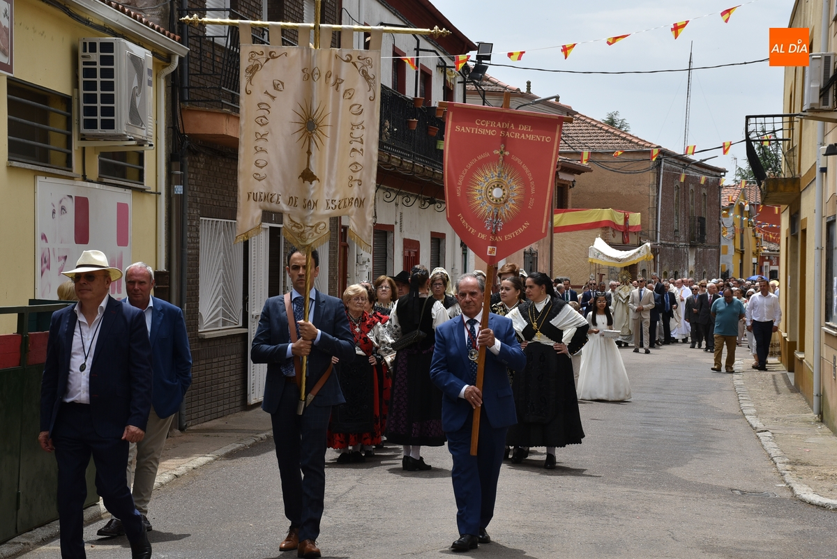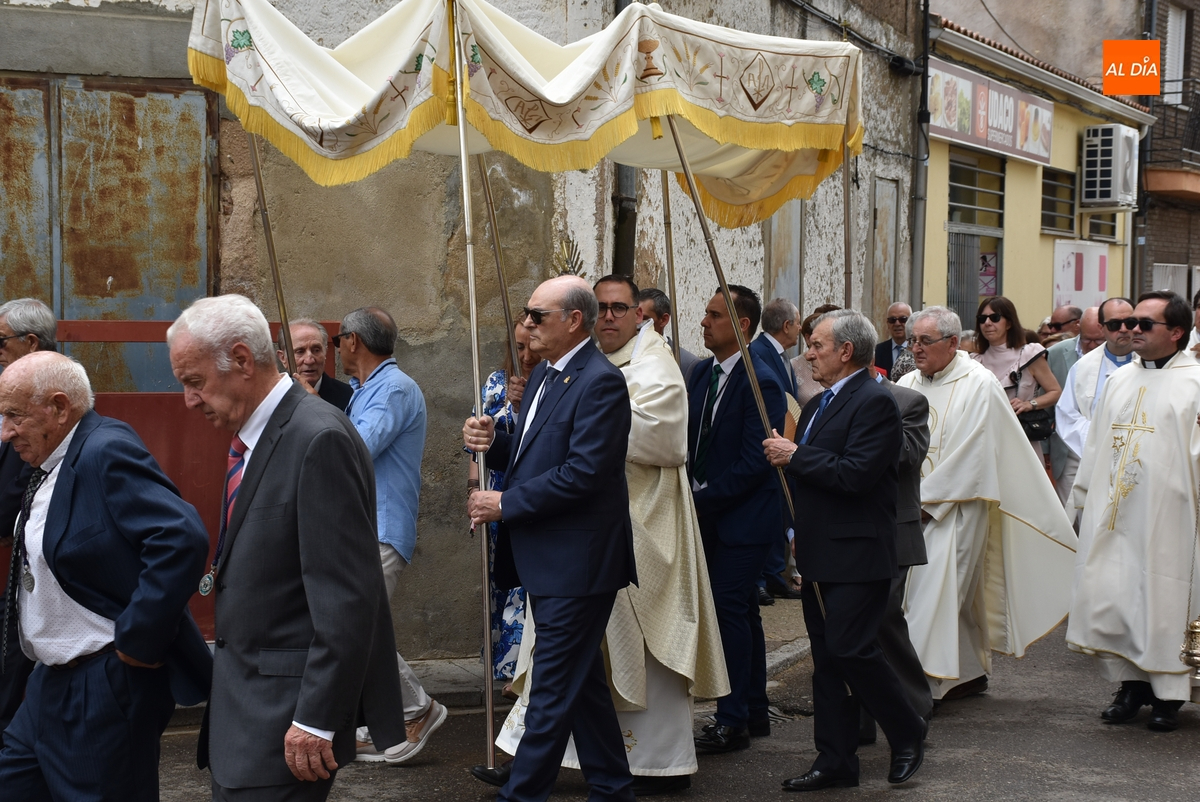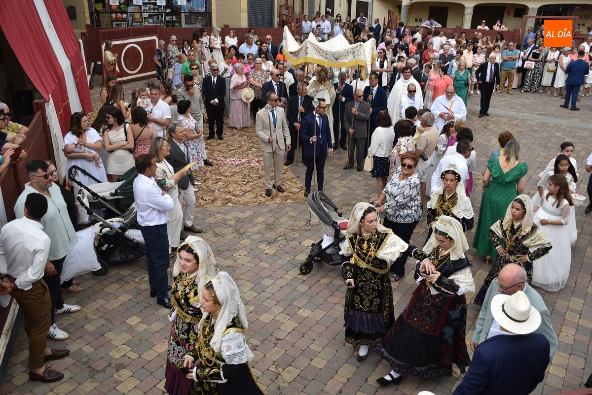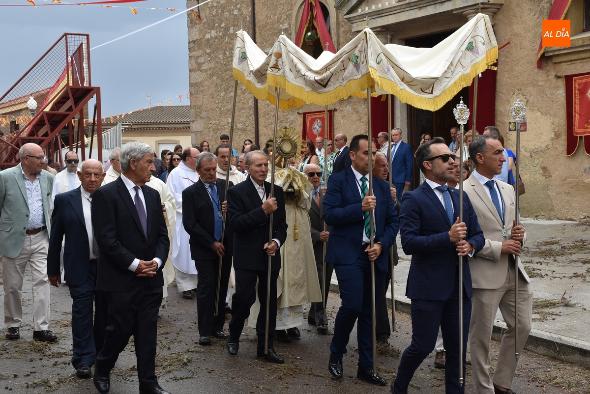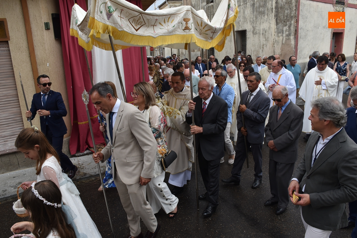 Así, la procesión pudo ponerse en marcha, encabezada por los estandartes distintivos del Corpus, a quiénes seguían las integrantes del Grupo de Baile Charro, cinco niños (4 niñas y un niño) que han tomado la Primera Comunión esta primavera en La Fuente de San Esteban, y los mayordomos de la celebración, Juan Ignacio García Rodríguez y Manuel Gallego Díez, quienes iban portando las varas. Tras ellos iba bajo palio el Santísimo Sacramento, arropado por unos cuantos sacerdotes encabezados por Anselmo Matilla.