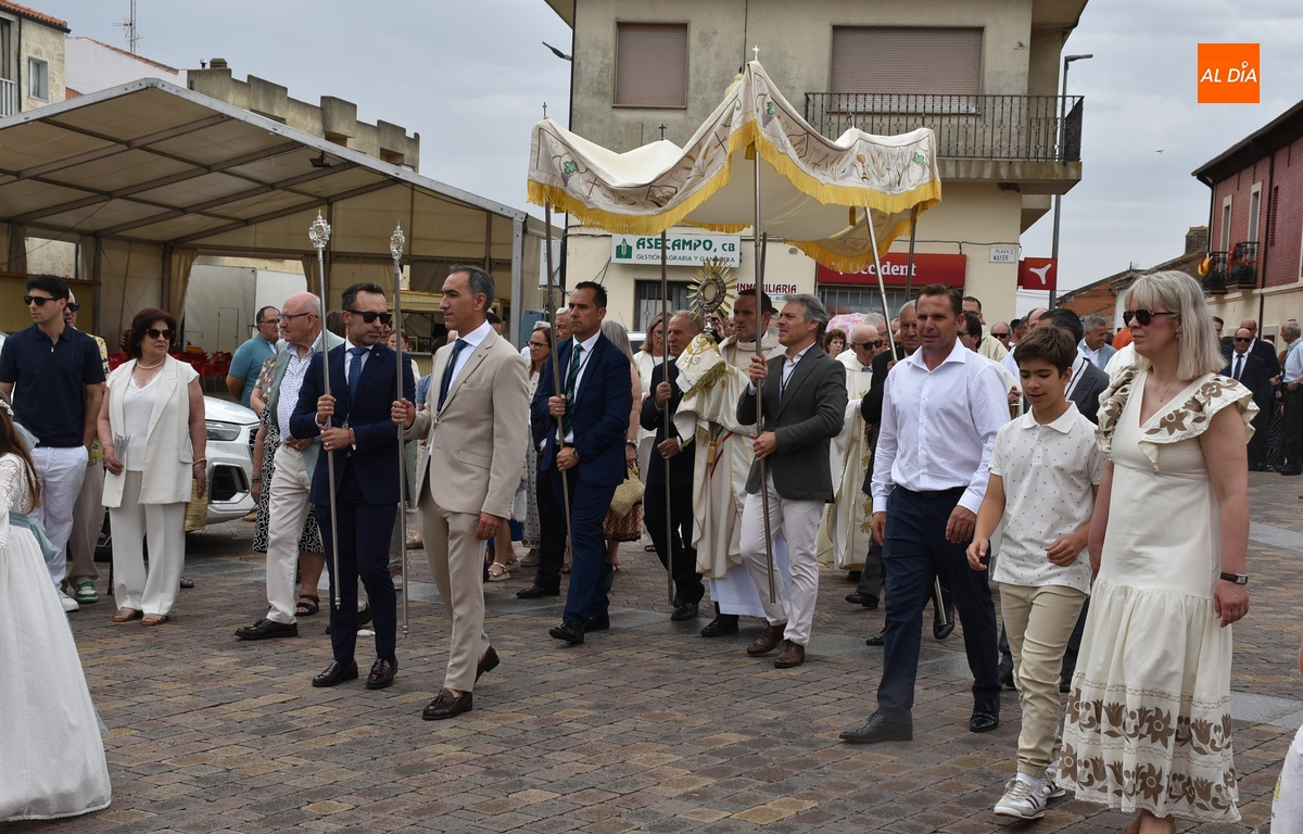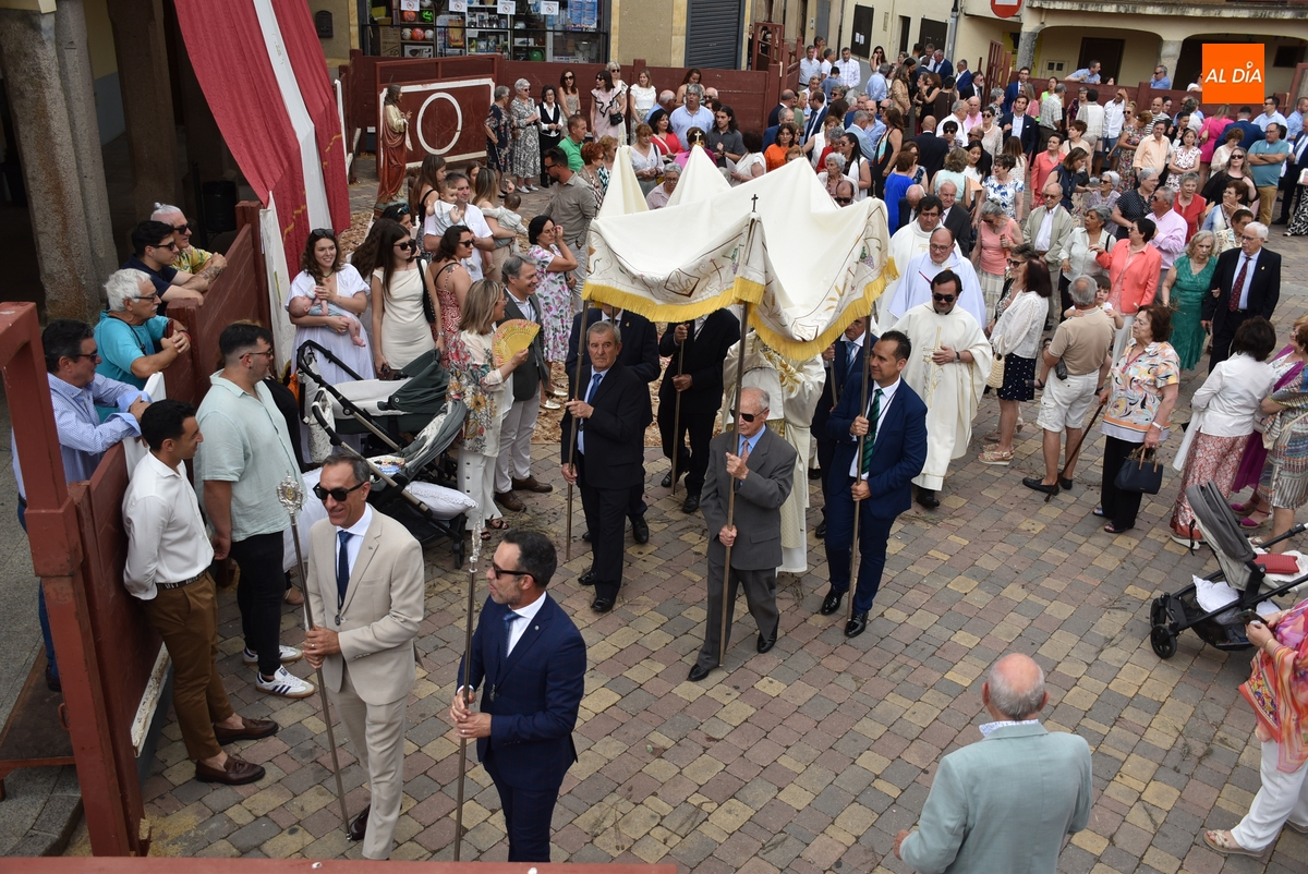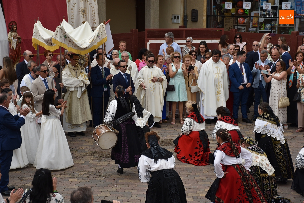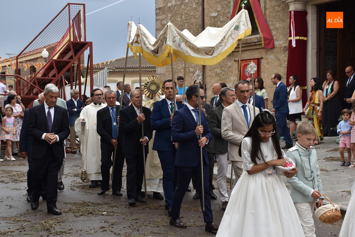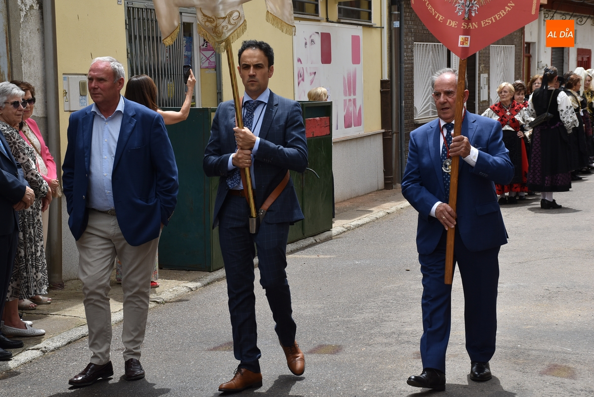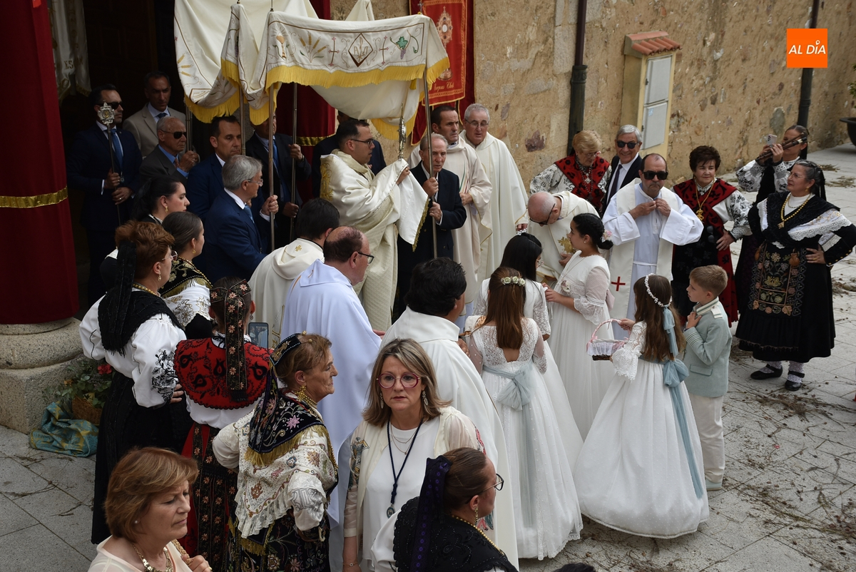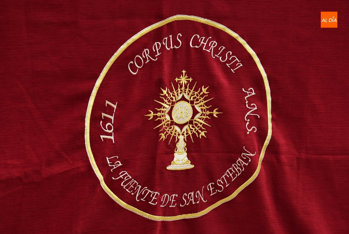 Así, la procesión pudo ponerse en marcha, encabezada por los estandartes distintivos del Corpus, a quiénes seguían las integrantes del Grupo de Baile Charro, cinco niños (4 niñas y un niño) que han tomado la Primera Comunión esta primavera en La Fuente de San Esteban, y los mayordomos de la celebración, Juan Ignacio García Rodríguez y Manuel Gallego Díez, quienes iban portando las varas. Tras ellos iba bajo palio el Santísimo Sacramento, arropado por unos cuantos sacerdotes encabezados por Anselmo Matilla.