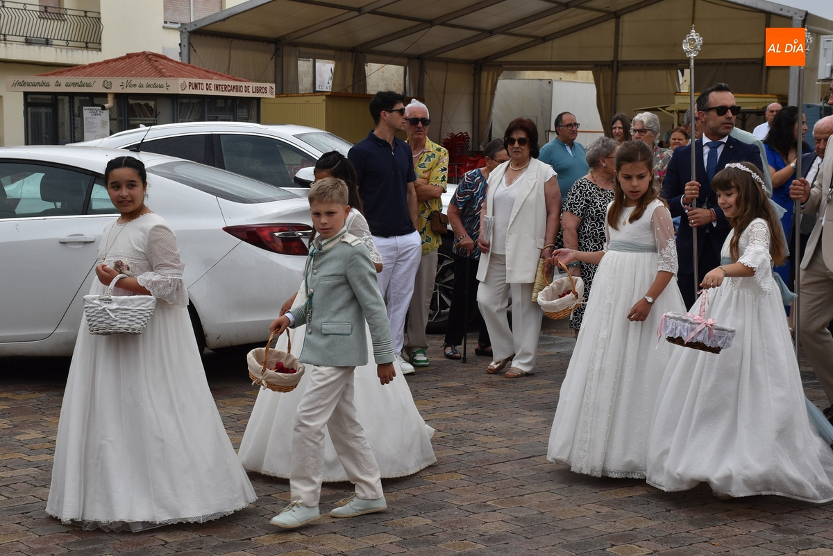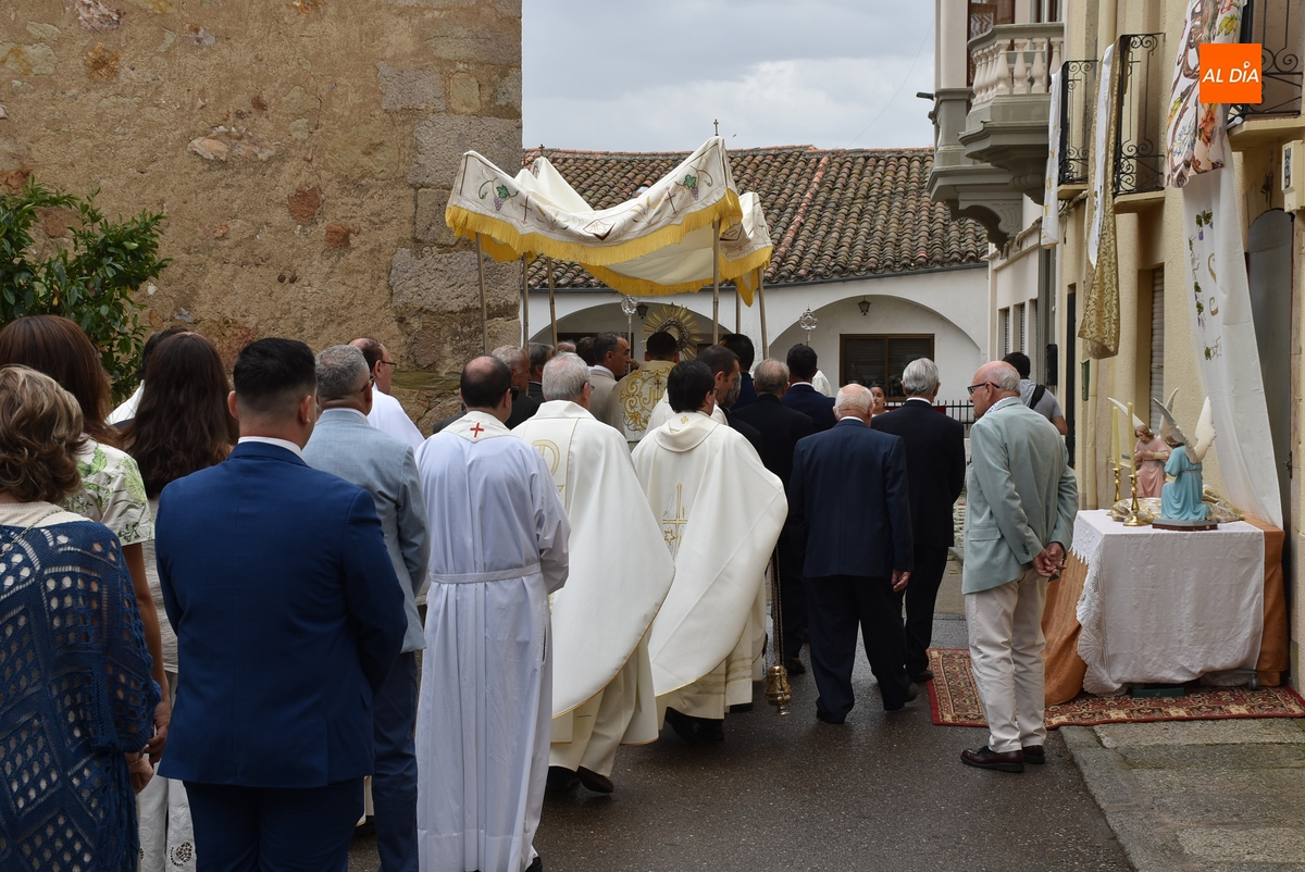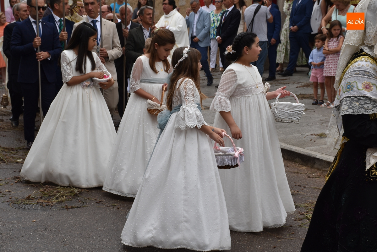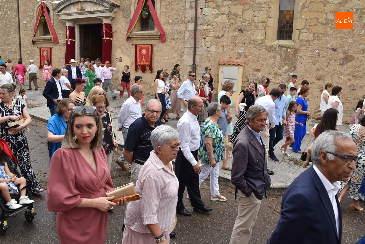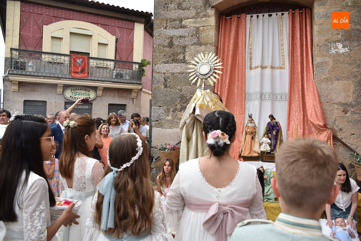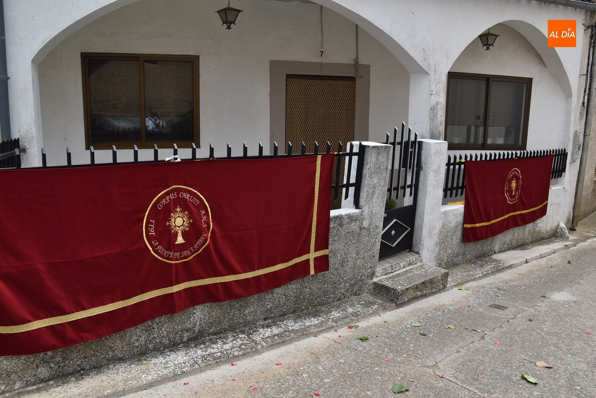 Así, la procesión pudo ponerse en marcha, encabezada por los estandartes distintivos del Corpus, a quiénes seguían las integrantes del Grupo de Baile Charro, cinco niños (4 niñas y un niño) que han tomado la Primera Comunión esta primavera en La Fuente de San Esteban, y los mayordomos de la celebración, Juan Ignacio García Rodríguez y Manuel Gallego Díez, quienes iban portando las varas. Tras ellos iba bajo palio el Santísimo Sacramento, arropado por unos cuantos sacerdotes encabezados por Anselmo Matilla.