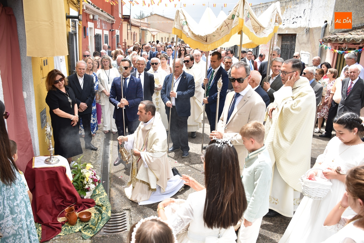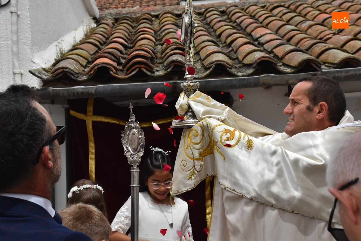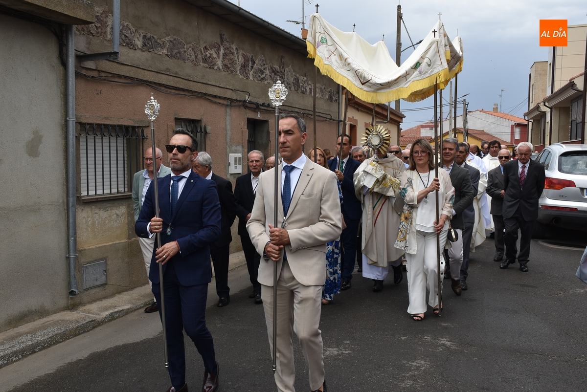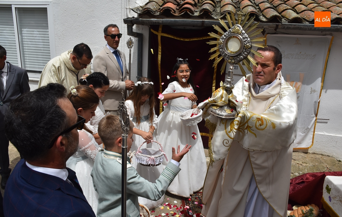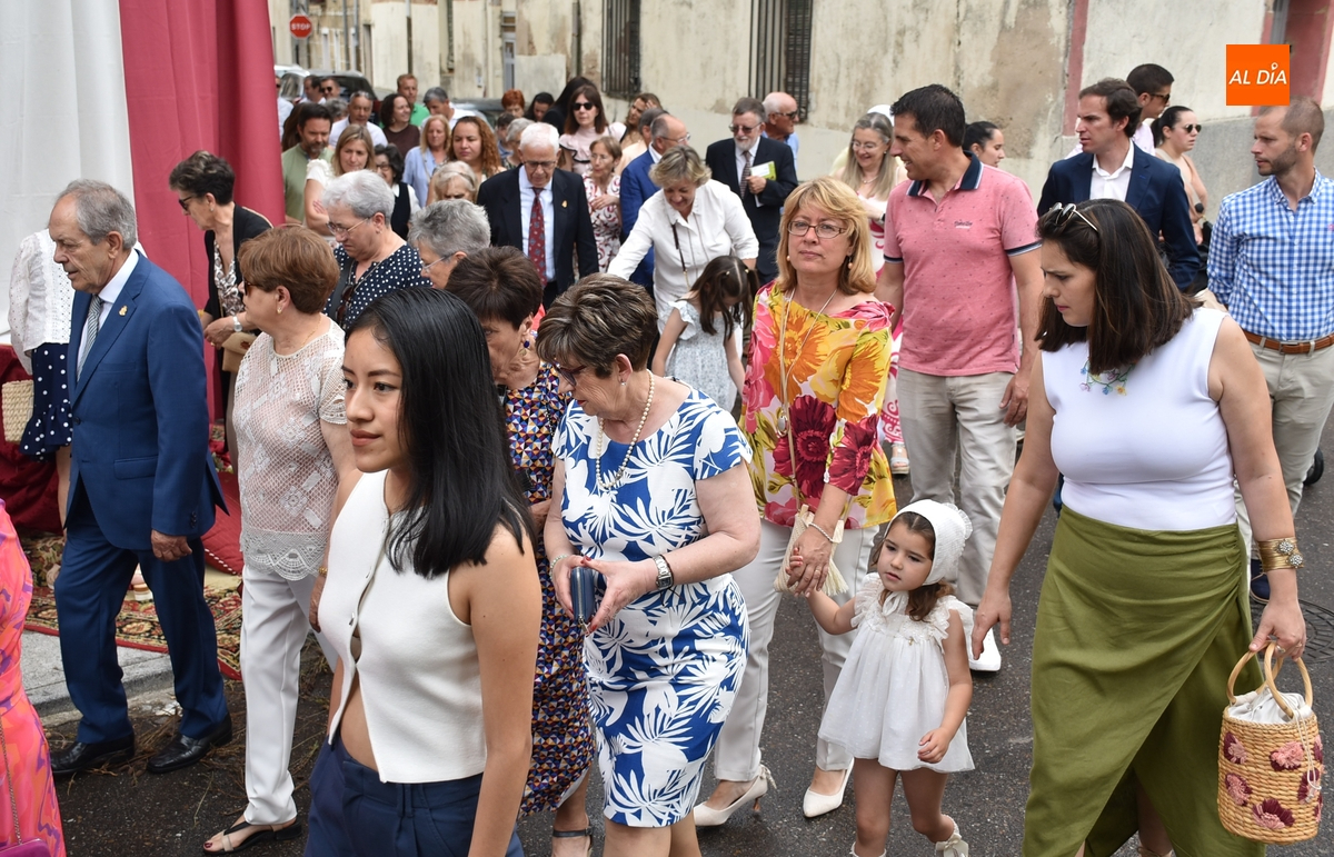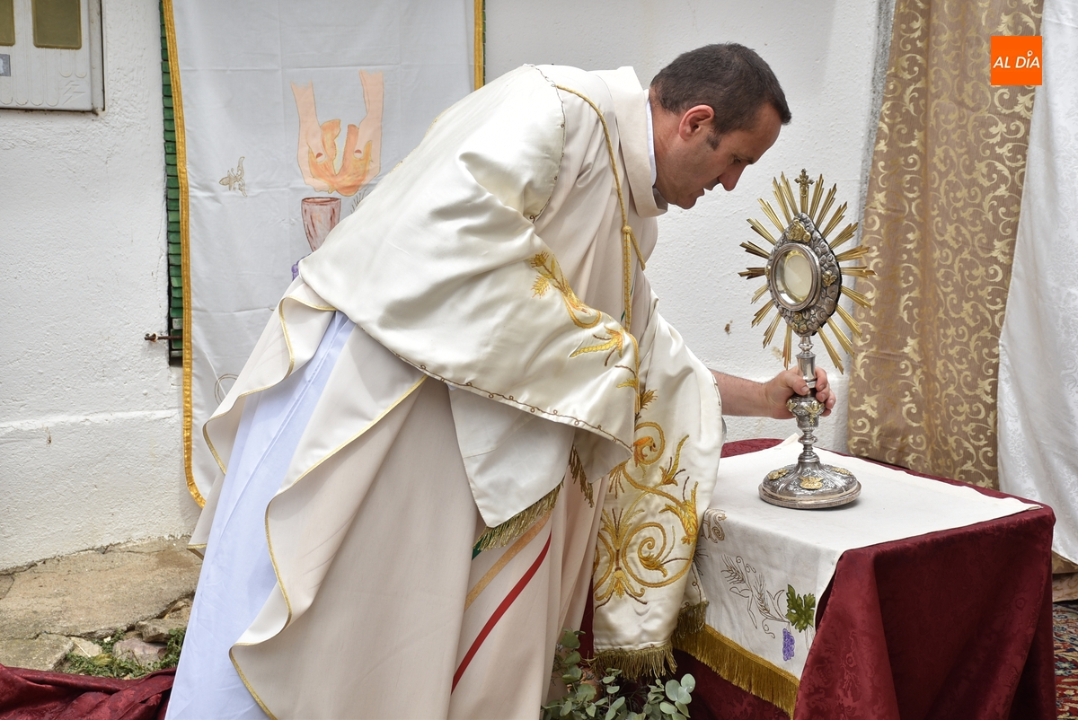 Así, la procesión pudo ponerse en marcha, encabezada por los estandartes distintivos del Corpus, a quiénes seguían las integrantes del Grupo de Baile Charro, cinco niños (4 niñas y un niño) que han tomado la Primera Comunión esta primavera en La Fuente de San Esteban, y los mayordomos de la celebración, Juan Ignacio García Rodríguez y Manuel Gallego Díez, quienes iban portando las varas. Tras ellos iba bajo palio el Santísimo Sacramento, arropado por unos cuantos sacerdotes encabezados por Anselmo Matilla.