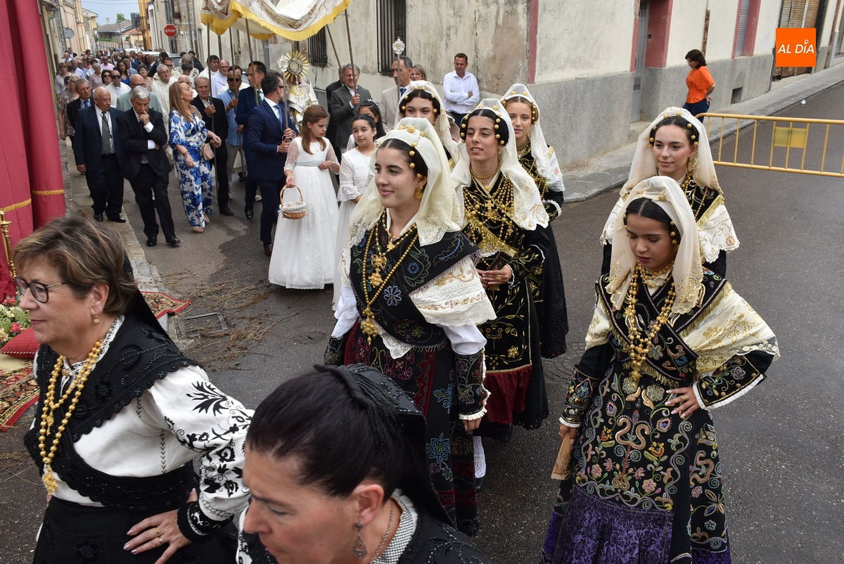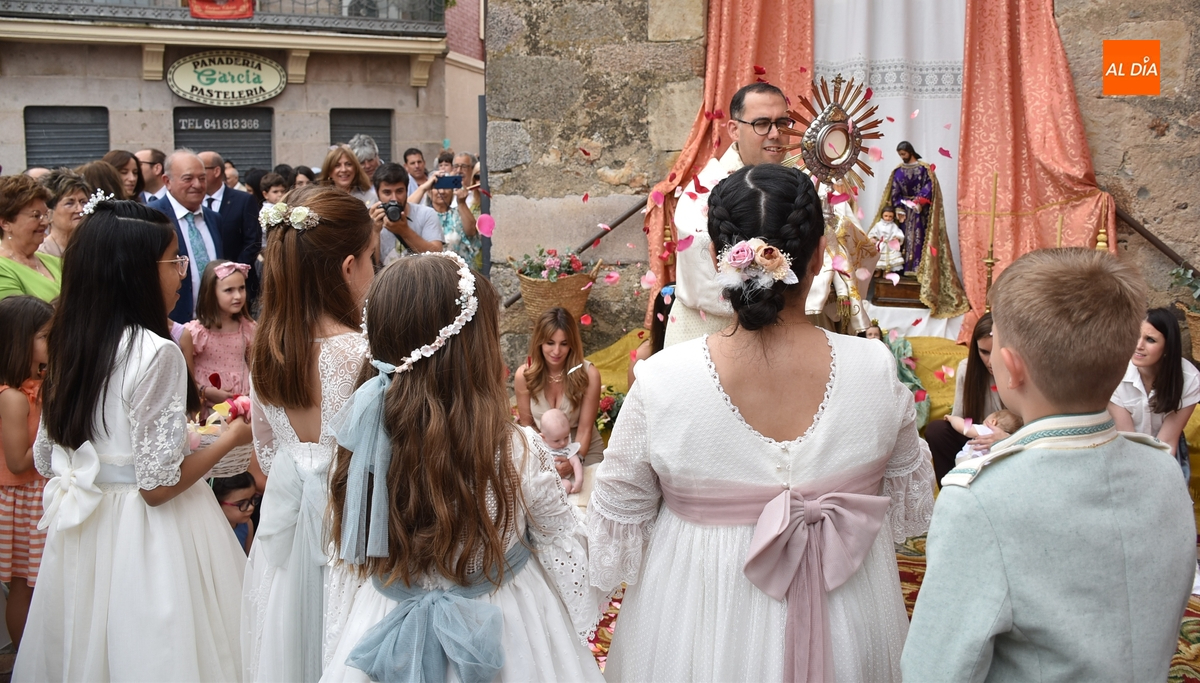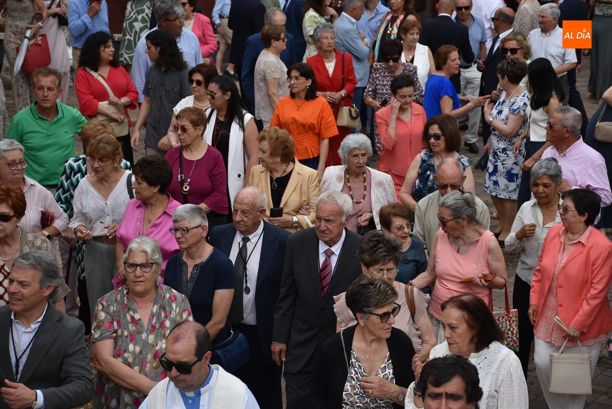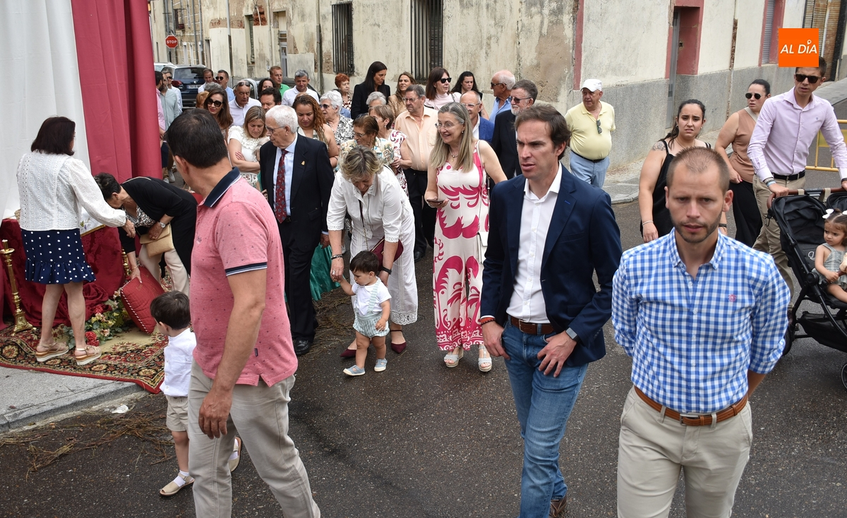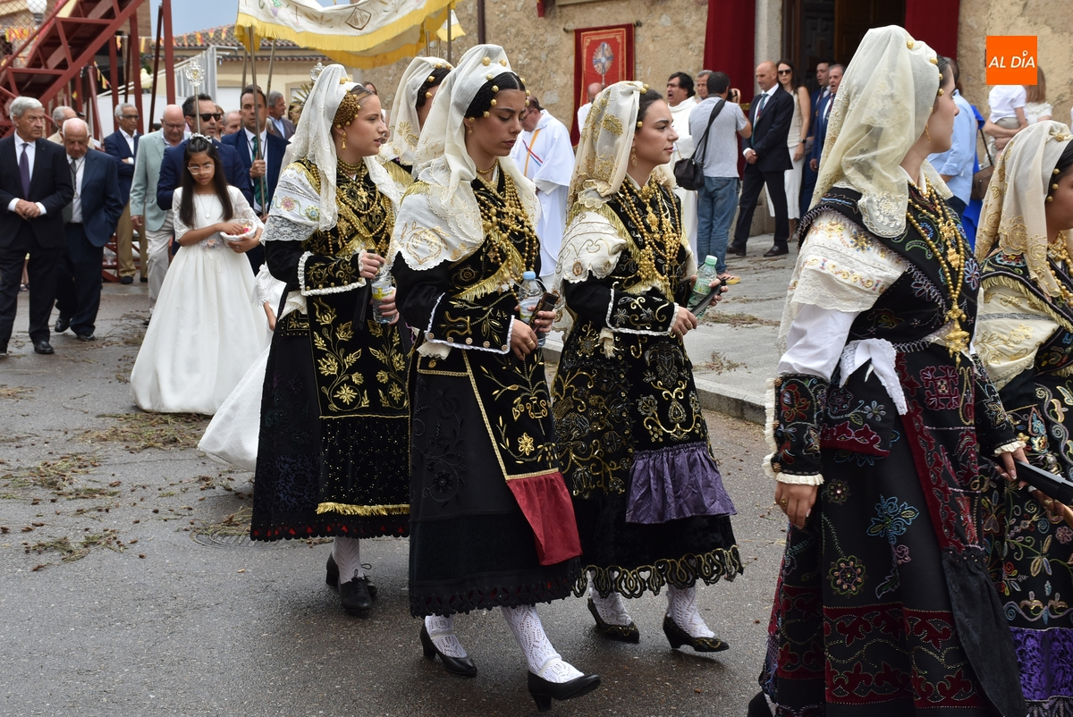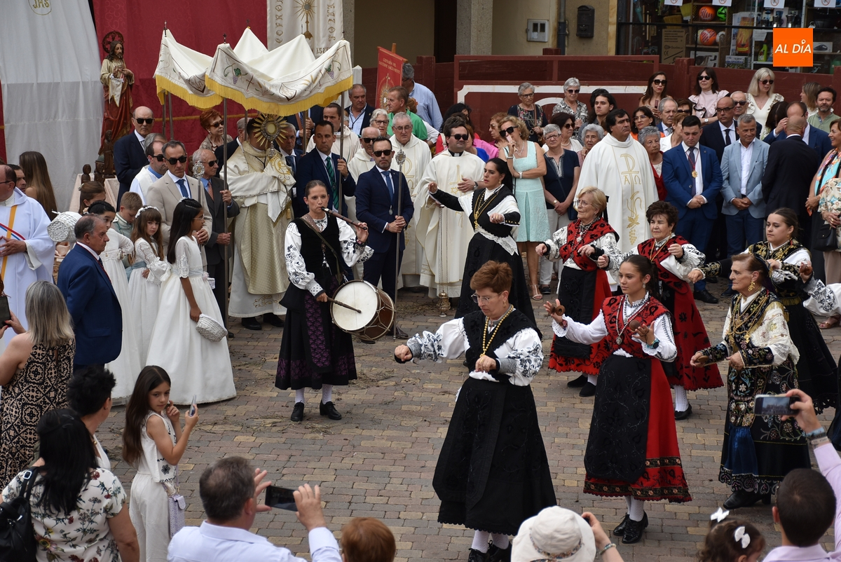 Así, la procesión pudo ponerse en marcha, encabezada por los estandartes distintivos del Corpus, a quiénes seguían las integrantes del Grupo de Baile Charro, cinco niños (4 niñas y un niño) que han tomado la Primera Comunión esta primavera en La Fuente de San Esteban, y los mayordomos de la celebración, Juan Ignacio García Rodríguez y Manuel Gallego Díez, quienes iban portando las varas. Tras ellos iba bajo palio el Santísimo Sacramento, arropado por unos cuantos sacerdotes encabezados por Anselmo Matilla.
