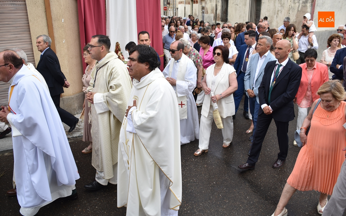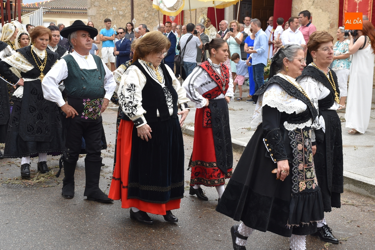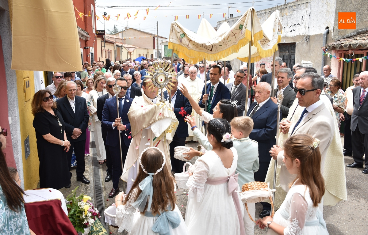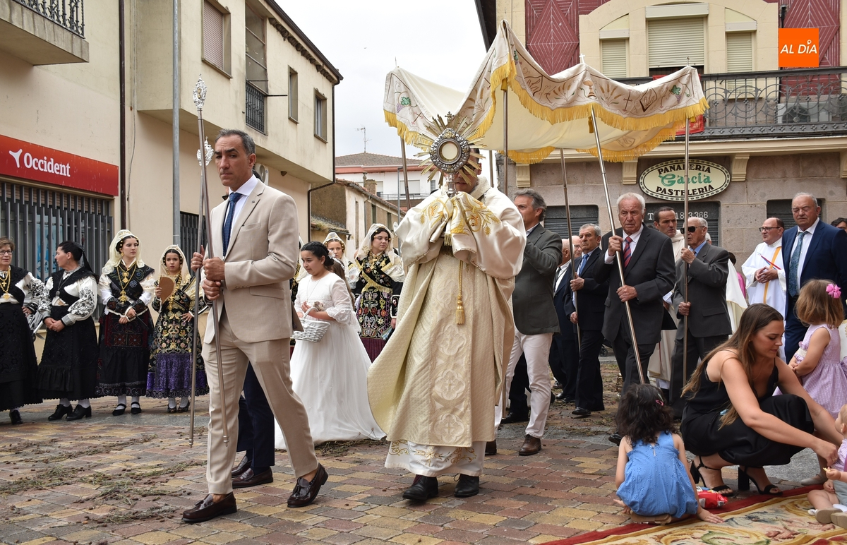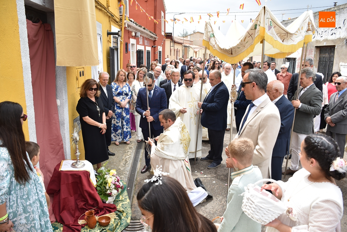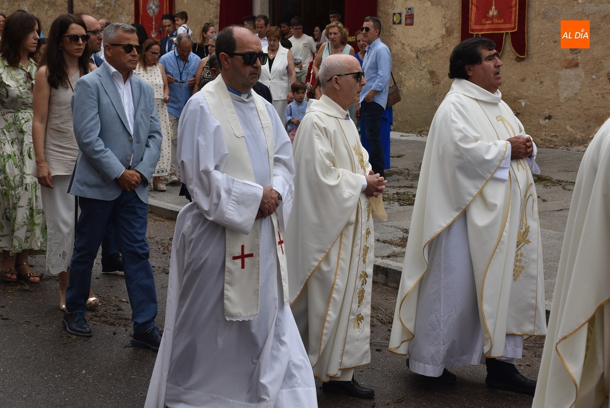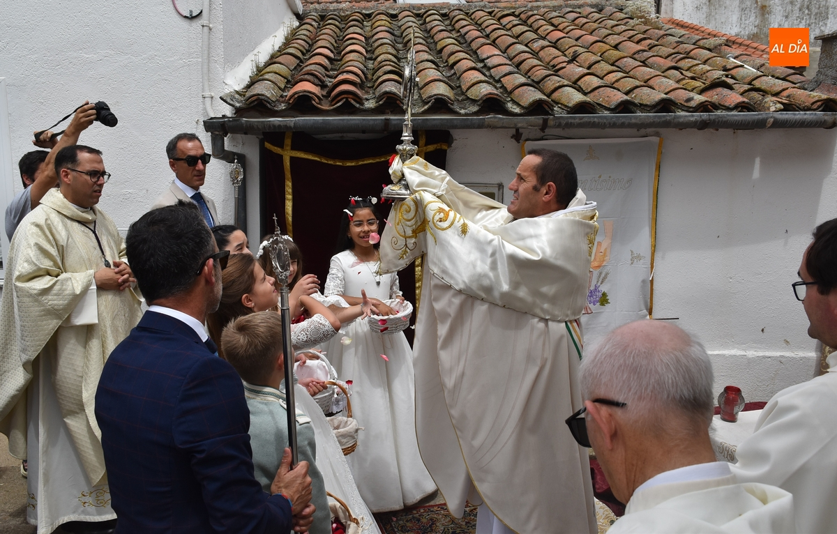 Así, la procesión pudo ponerse en marcha, encabezada por los estandartes distintivos del Corpus, a quiénes seguían las integrantes del Grupo de Baile Charro, cinco niños (4 niñas y un niño) que han tomado la Primera Comunión esta primavera en La Fuente de San Esteban, y los mayordomos de la celebración, Juan Ignacio García Rodríguez y Manuel Gallego Díez, quienes iban portando las varas. Tras ellos iba bajo palio el Santísimo Sacramento, arropado por unos cuantos sacerdotes encabezados por Anselmo Matilla.