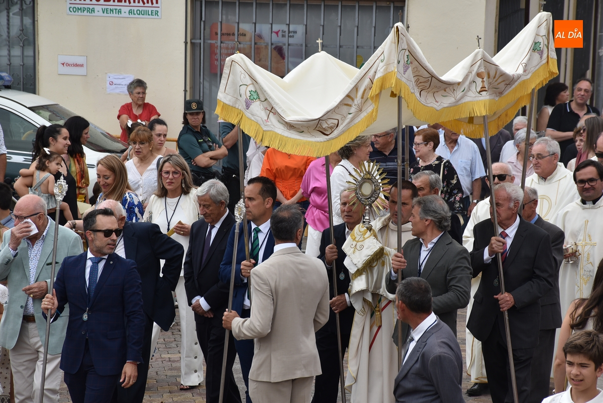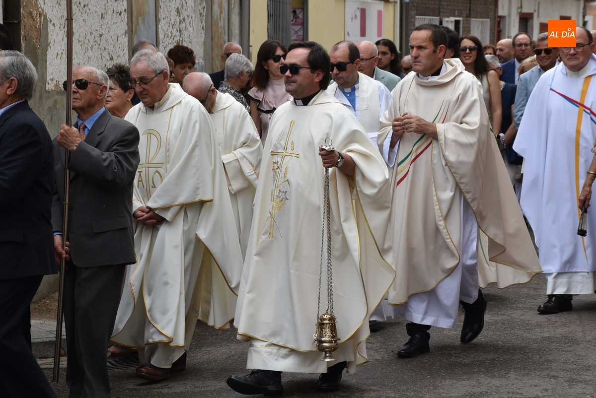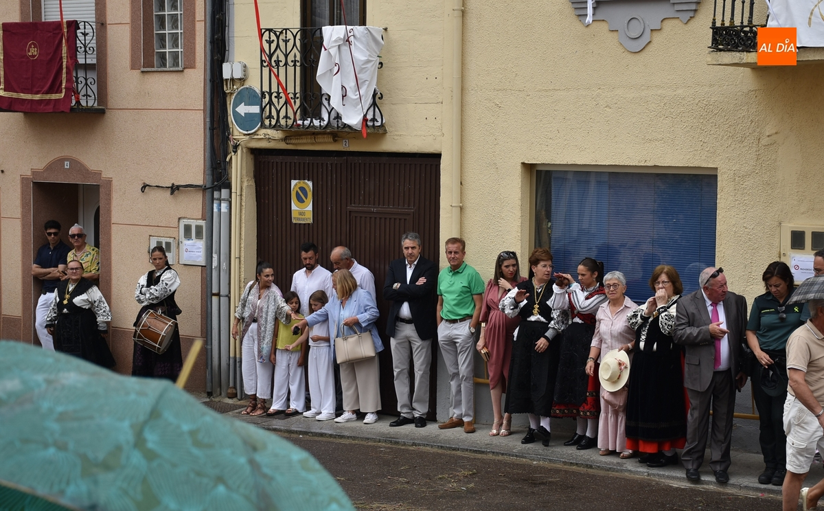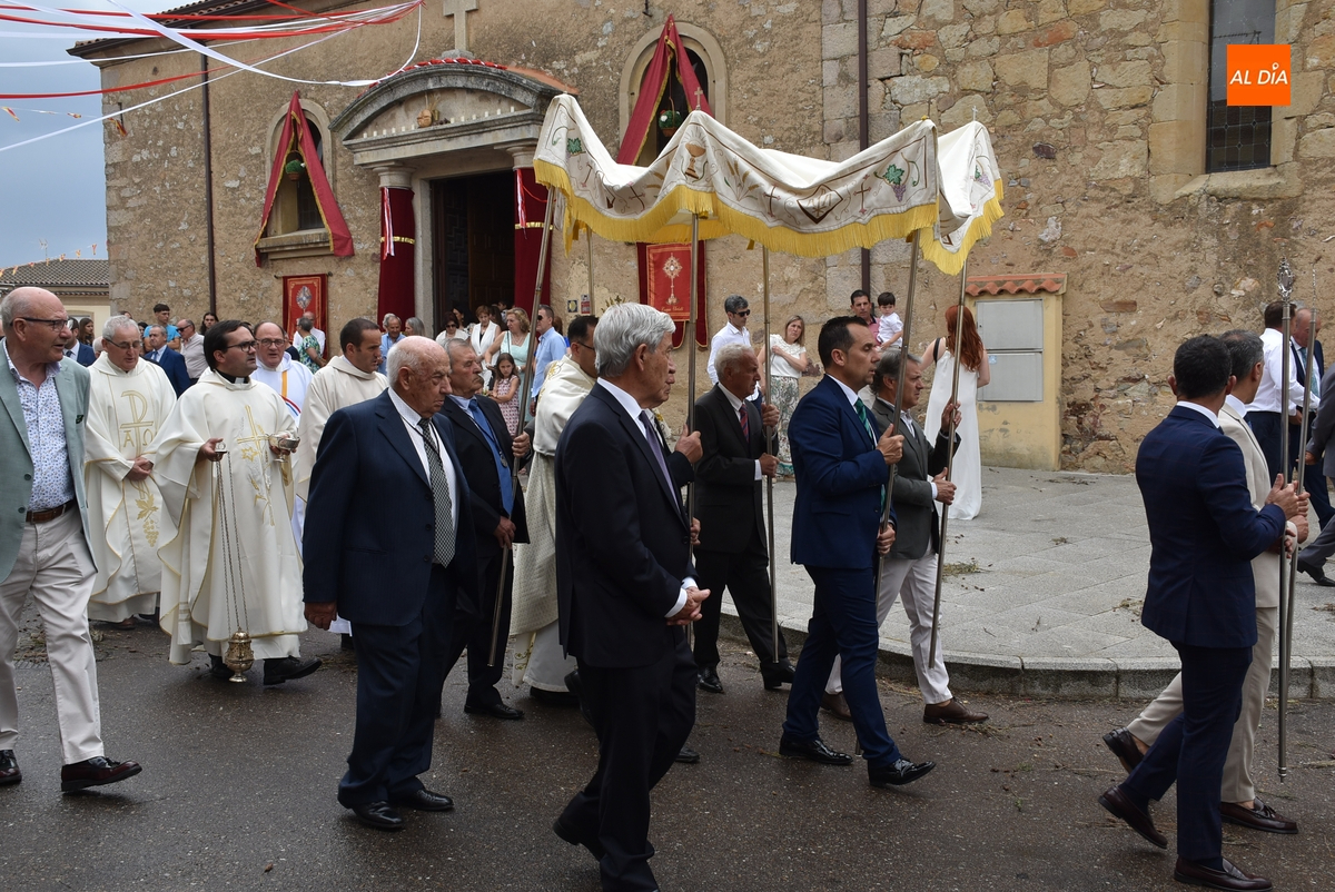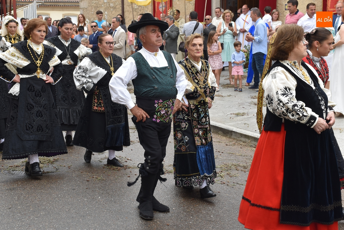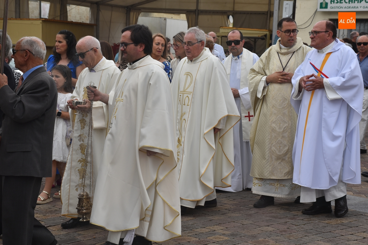 Así, la procesión pudo ponerse en marcha, encabezada por los estandartes distintivos del Corpus, a quiénes seguían las integrantes del Grupo de Baile Charro, cinco niños (4 niñas y un niño) que han tomado la Primera Comunión esta primavera en La Fuente de San Esteban, y los mayordomos de la celebración, Juan Ignacio García Rodríguez y Manuel Gallego Díez, quienes iban portando las varas. Tras ellos iba bajo palio el Santísimo Sacramento, arropado por unos cuantos sacerdotes encabezados por Anselmo Matilla.