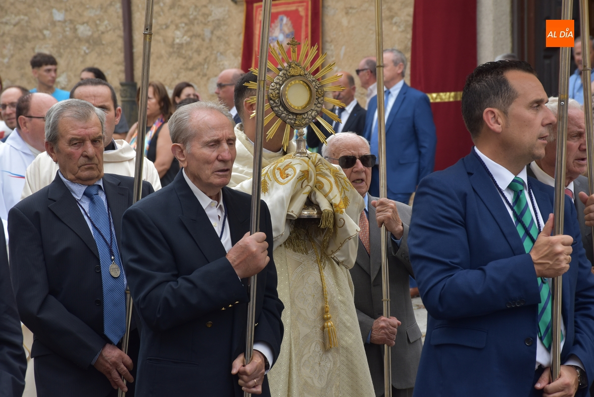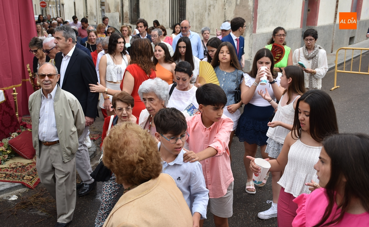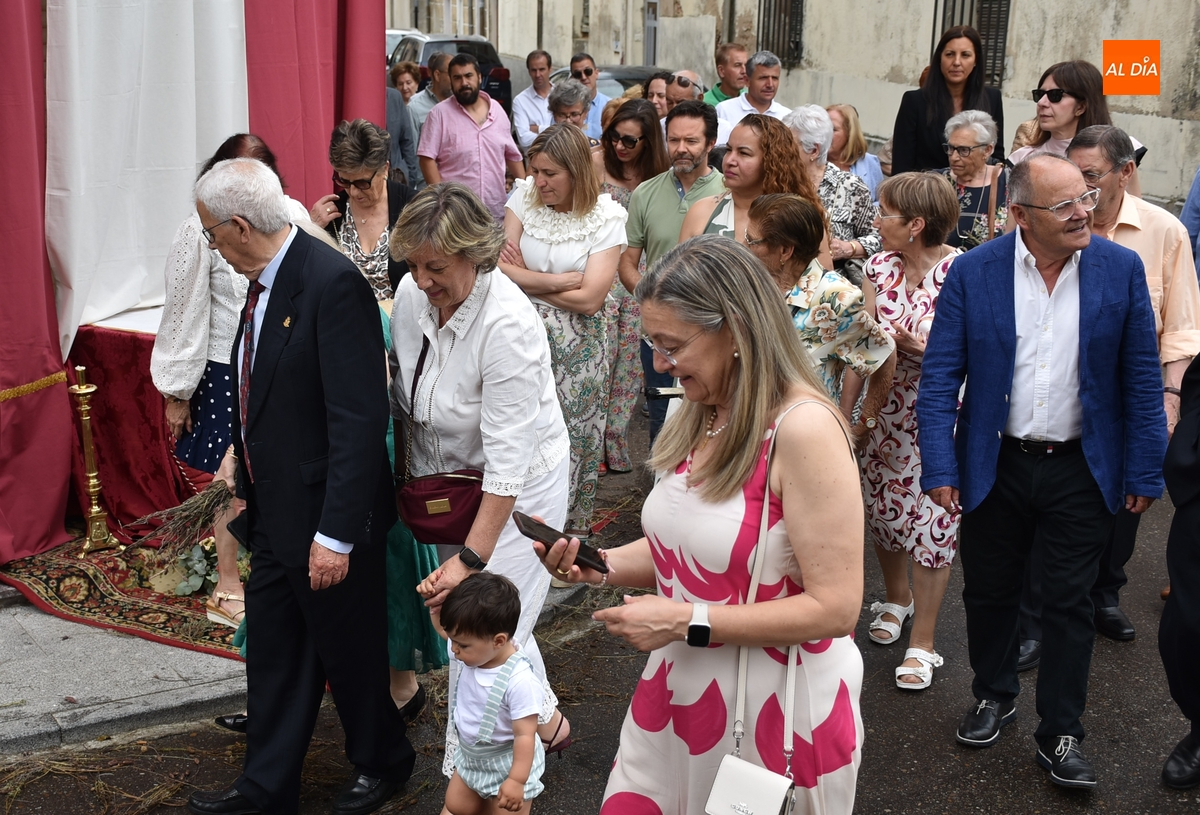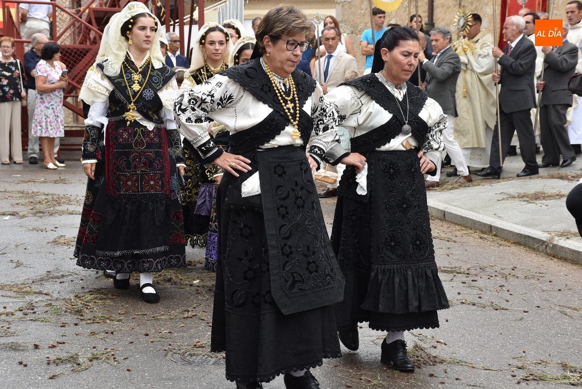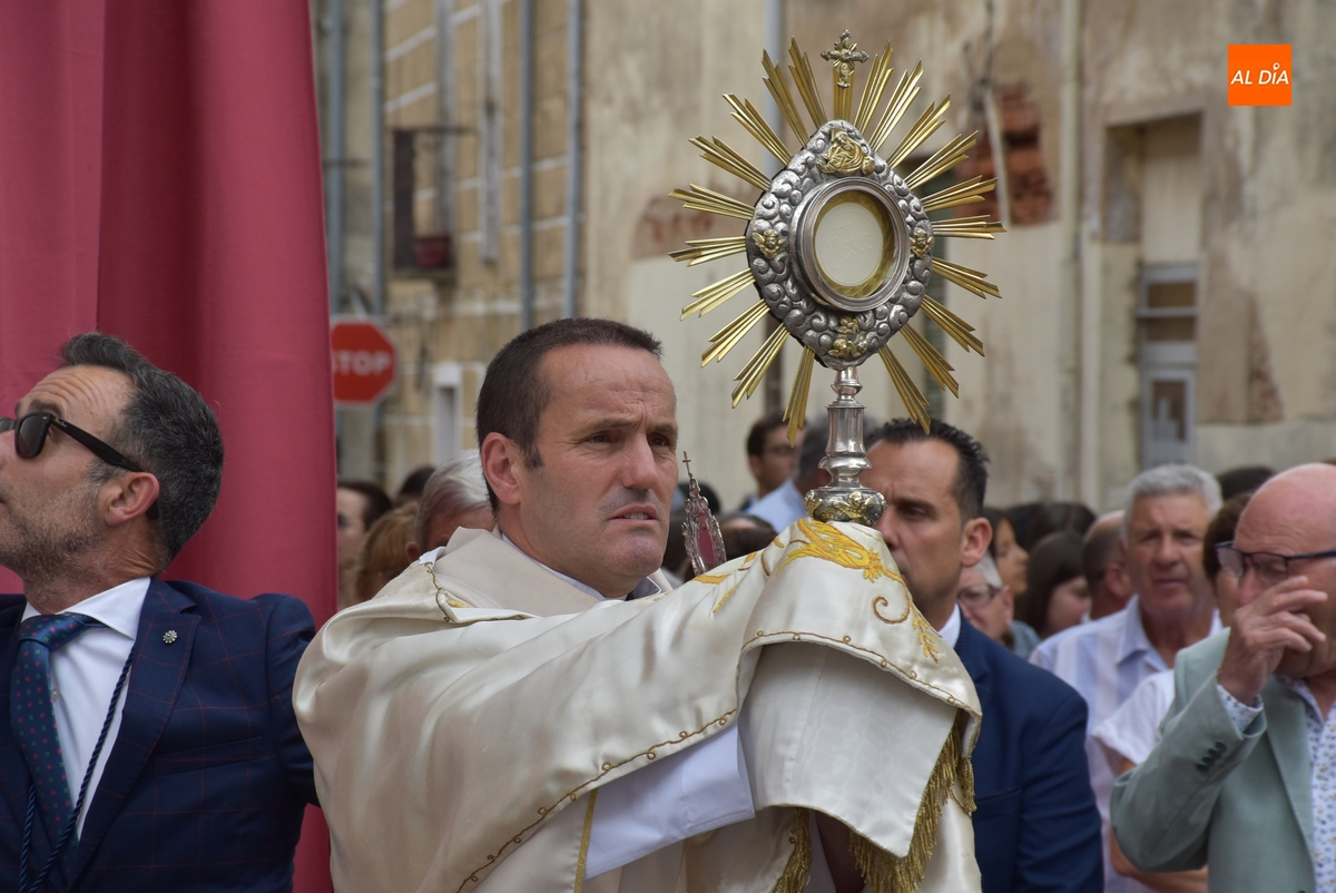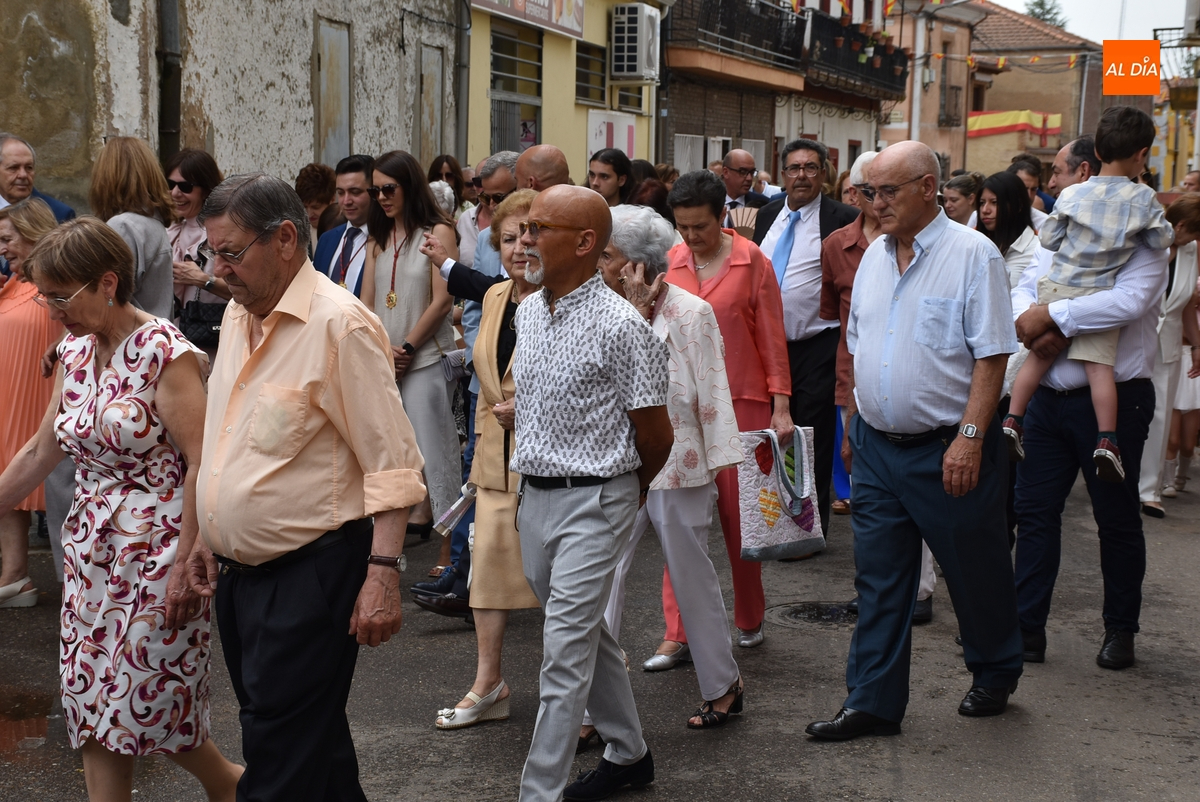 Así, la procesión pudo ponerse en marcha, encabezada por los estandartes distintivos del Corpus, a quiénes seguían las integrantes del Grupo de Baile Charro, cinco niños (4 niñas y un niño) que han tomado la Primera Comunión esta primavera en La Fuente de San Esteban, y los mayordomos de la celebración, Juan Ignacio García Rodríguez y Manuel Gallego Díez, quienes iban portando las varas. Tras ellos iba bajo palio el Santísimo Sacramento, arropado por unos cuantos sacerdotes encabezados por Anselmo Matilla.