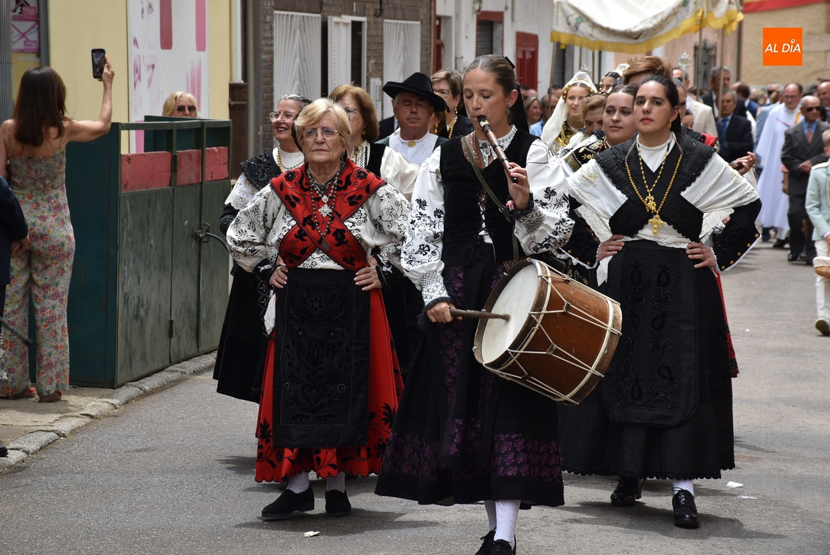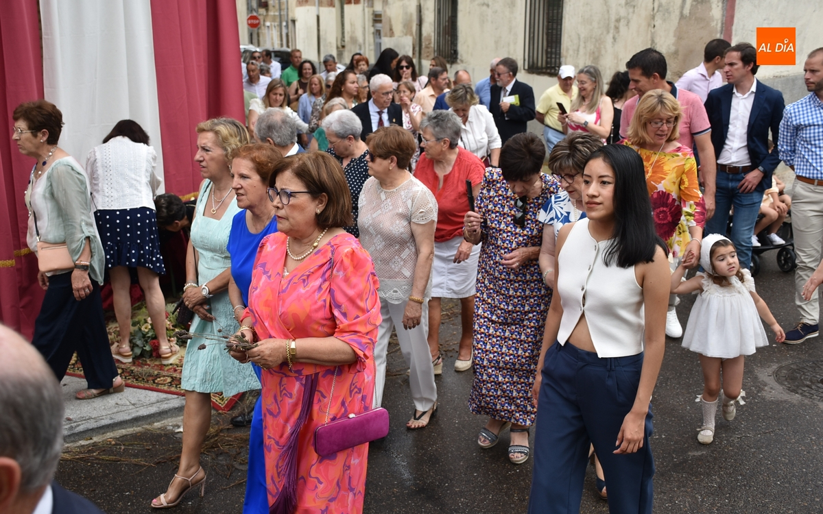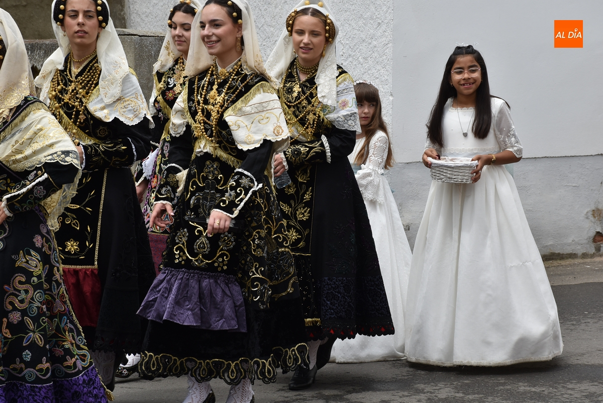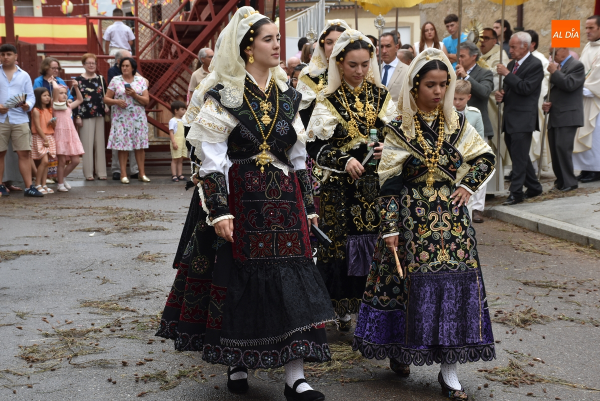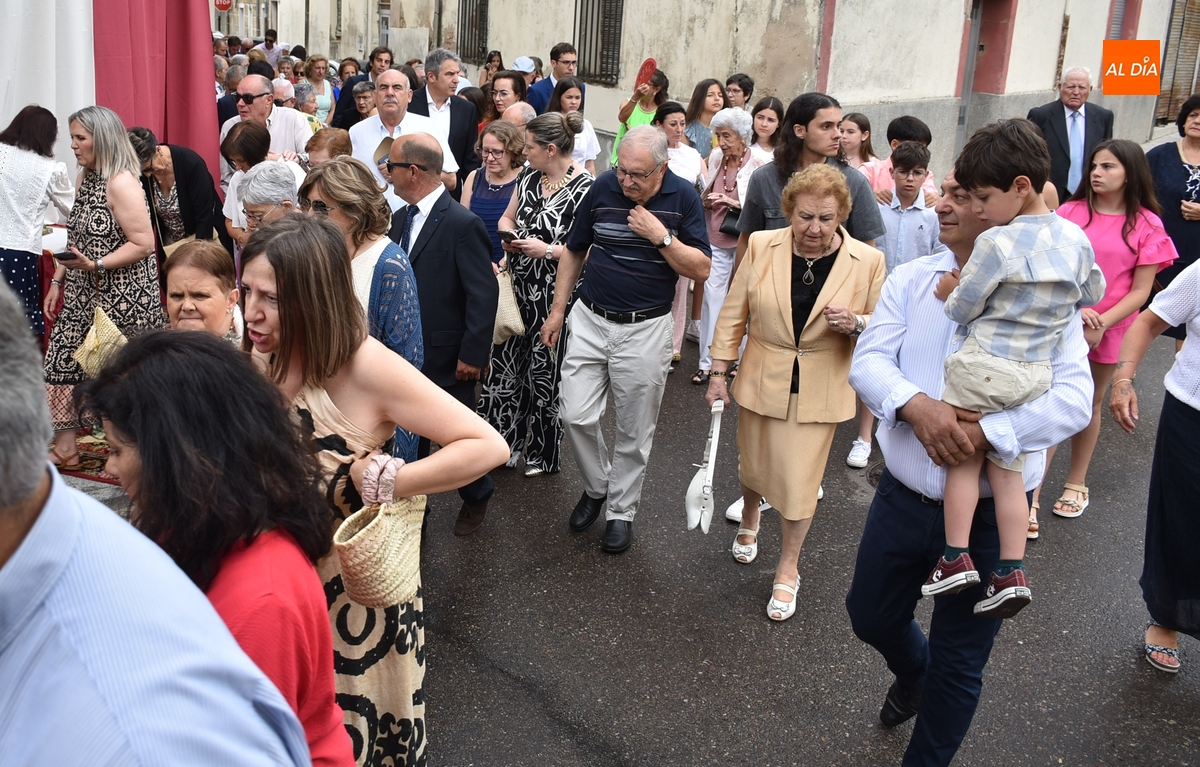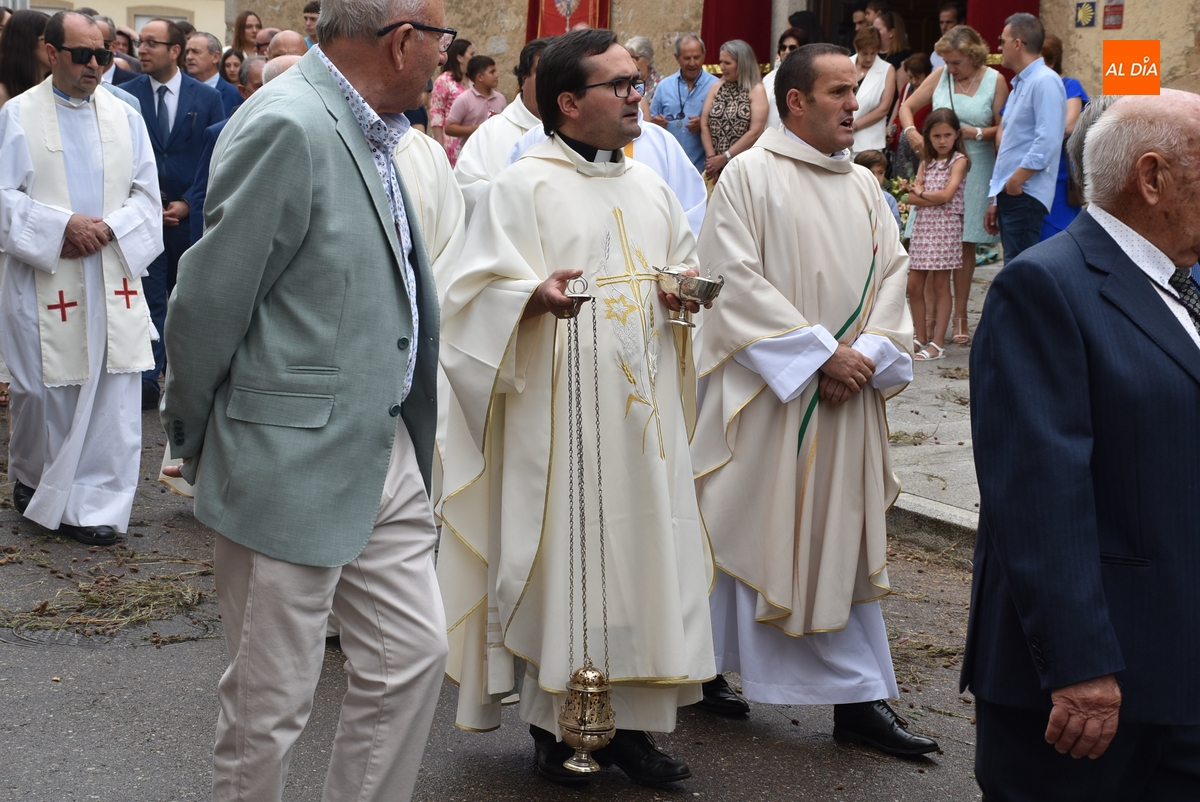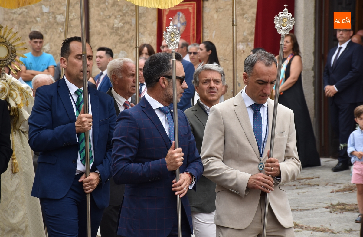 Así, la procesión pudo ponerse en marcha, encabezada por los estandartes distintivos del Corpus, a quiénes seguían las integrantes del Grupo de Baile Charro, cinco niños (4 niñas y un niño) que han tomado la Primera Comunión esta primavera en La Fuente de San Esteban, y los mayordomos de la celebración, Juan Ignacio García Rodríguez y Manuel Gallego Díez, quienes iban portando las varas. Tras ellos iba bajo palio el Santísimo Sacramento, arropado por unos cuantos sacerdotes encabezados por Anselmo Matilla.