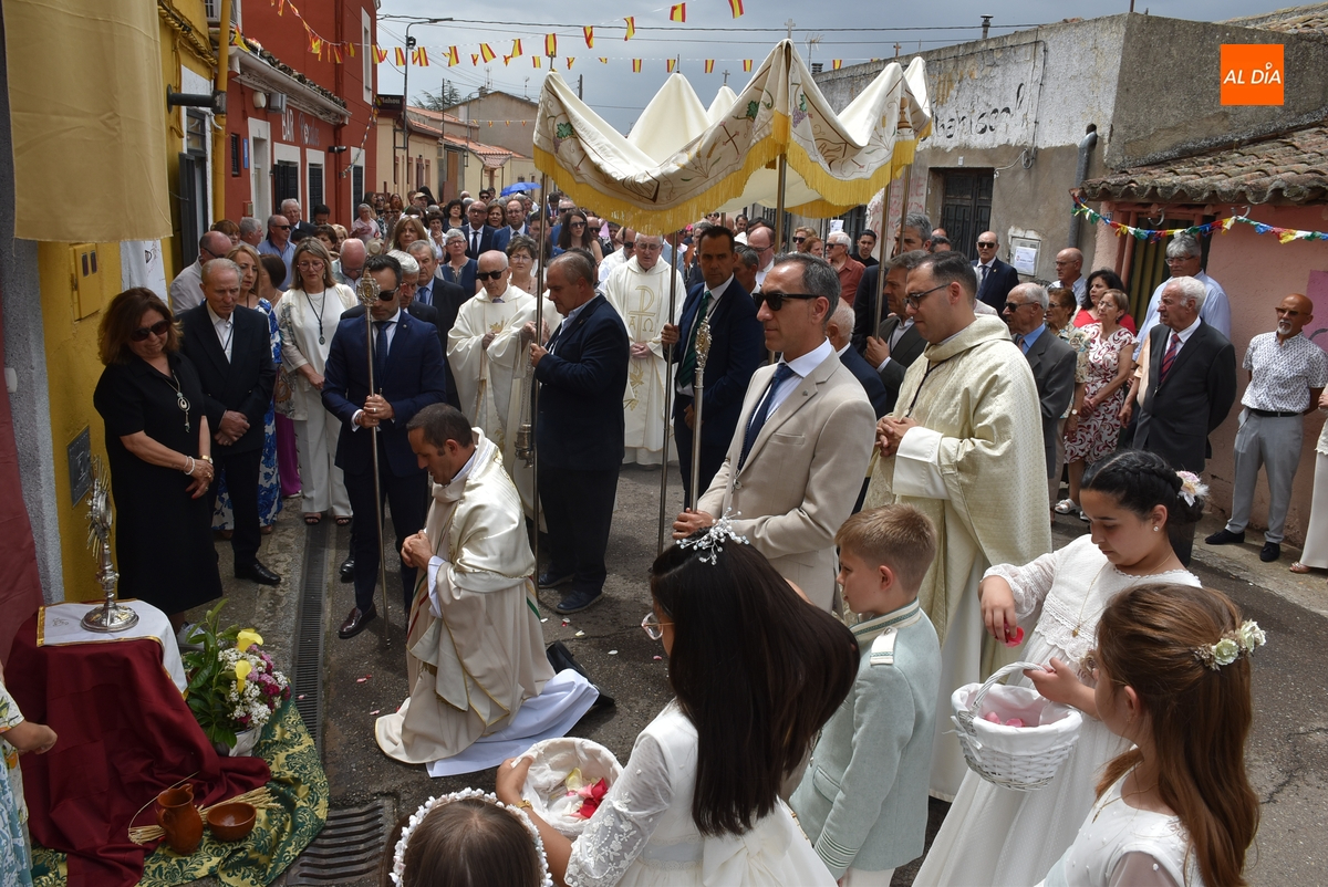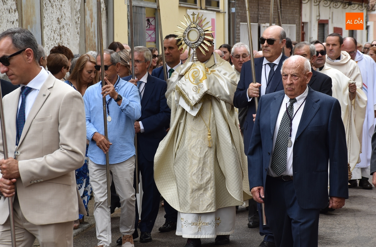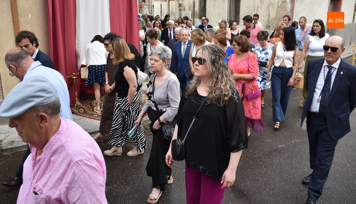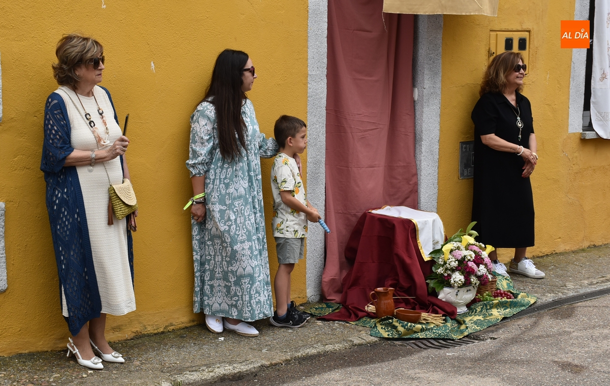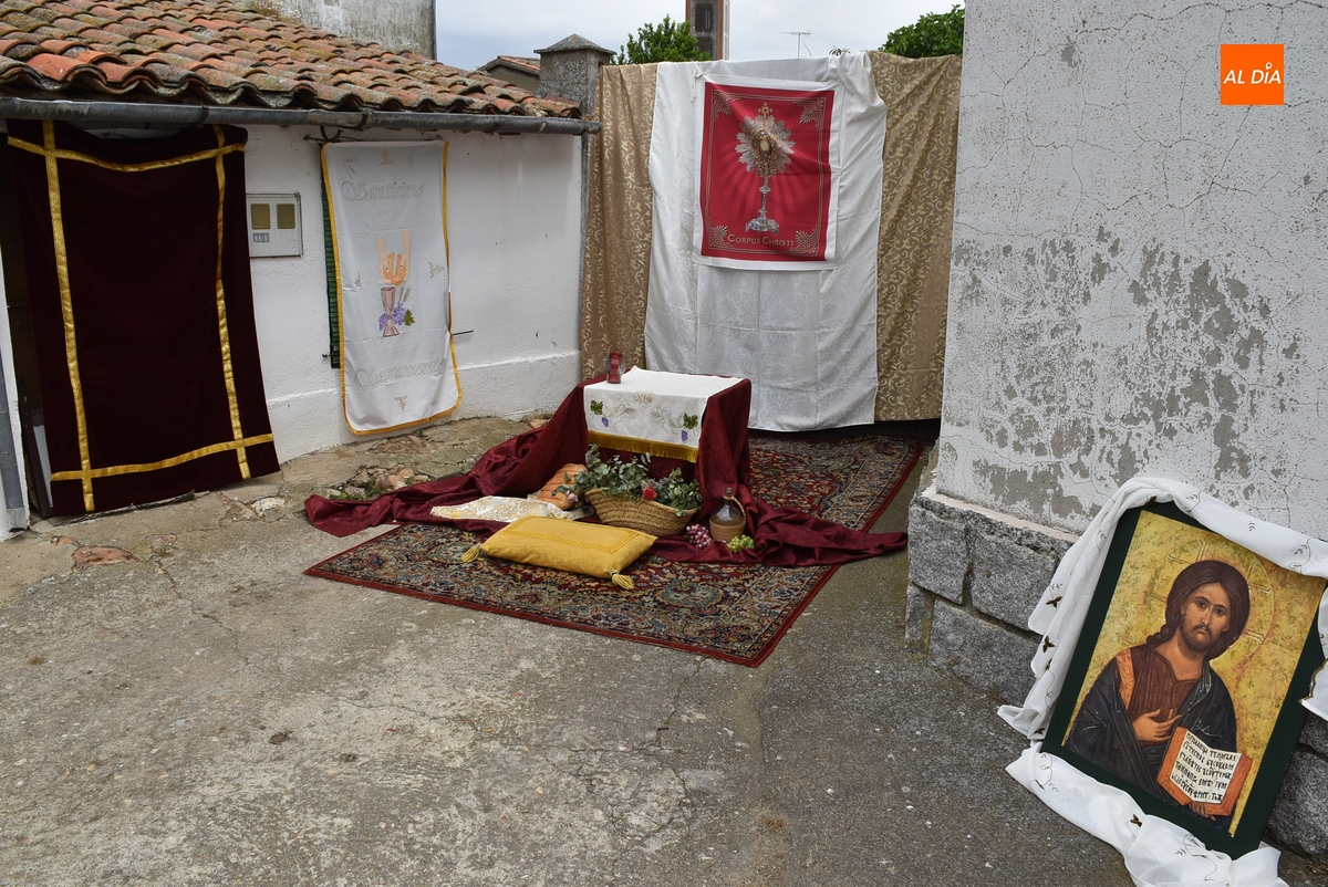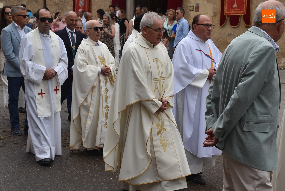 Así, la procesión pudo ponerse en marcha, encabezada por los estandartes distintivos del Corpus, a quiénes seguían las integrantes del Grupo de Baile Charro, cinco niños (4 niñas y un niño) que han tomado la Primera Comunión esta primavera en La Fuente de San Esteban, y los mayordomos de la celebración, Juan Ignacio García Rodríguez y Manuel Gallego Díez, quienes iban portando las varas. Tras ellos iba bajo palio el Santísimo Sacramento, arropado por unos cuantos sacerdotes encabezados por Anselmo Matilla.