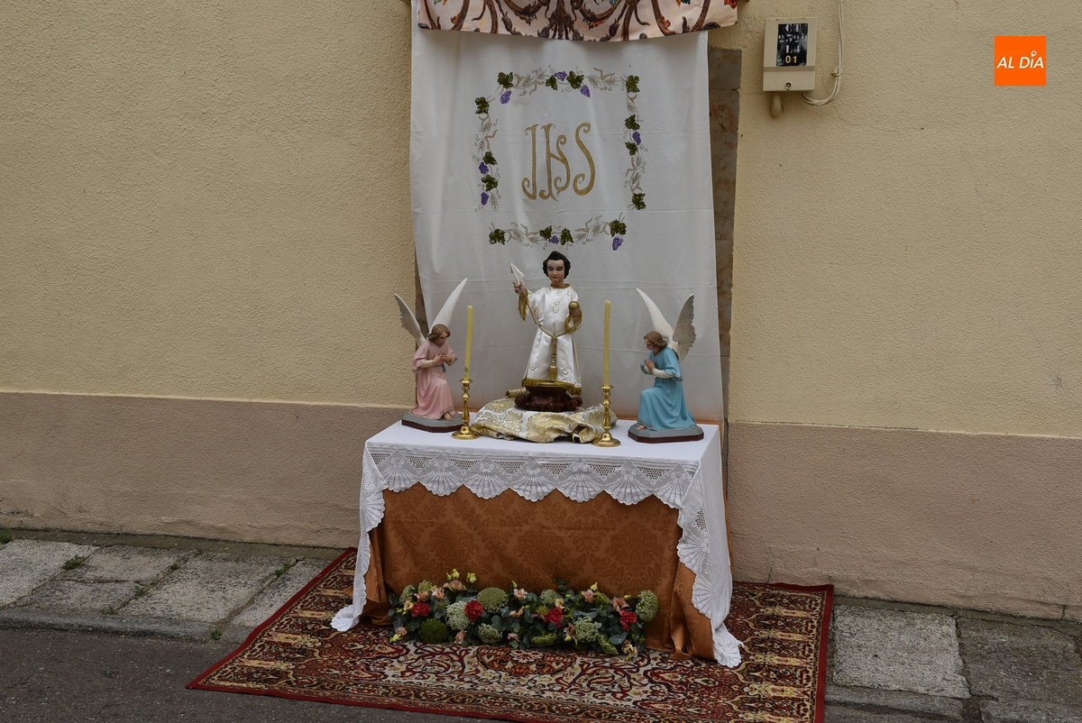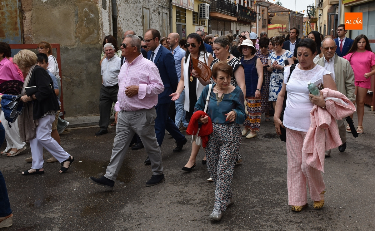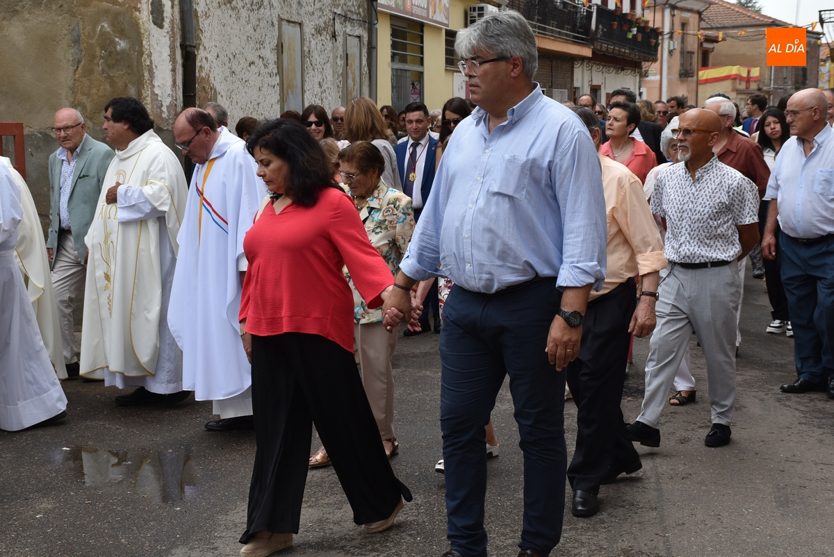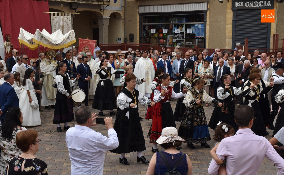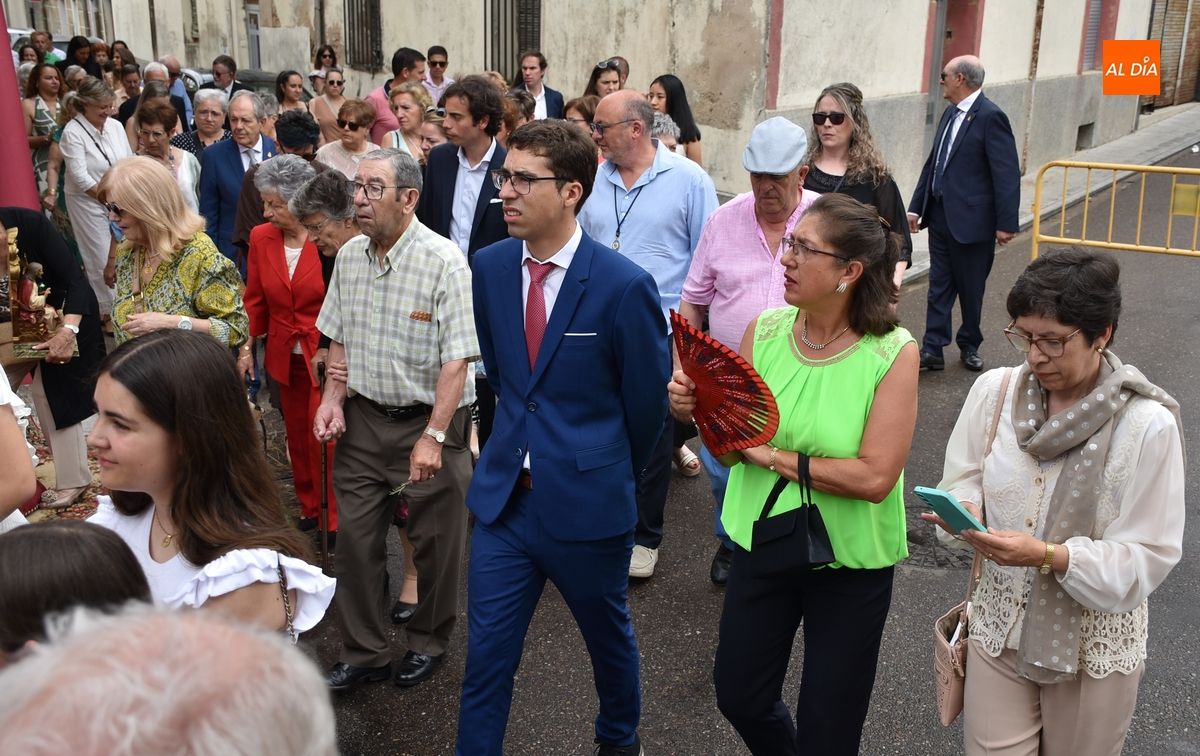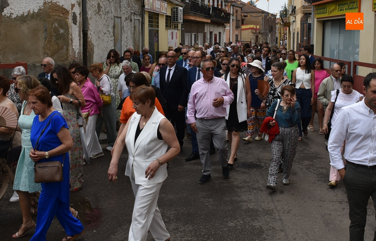 Así, la procesión pudo ponerse en marcha, encabezada por los estandartes distintivos del Corpus, a quiénes seguían las integrantes del Grupo de Baile Charro, cinco niños (4 niñas y un niño) que han tomado la Primera Comunión esta primavera en La Fuente de San Esteban, y los mayordomos de la celebración, Juan Ignacio García Rodríguez y Manuel Gallego Díez, quienes iban portando las varas. Tras ellos iba bajo palio el Santísimo Sacramento, arropado por unos cuantos sacerdotes encabezados por Anselmo Matilla.