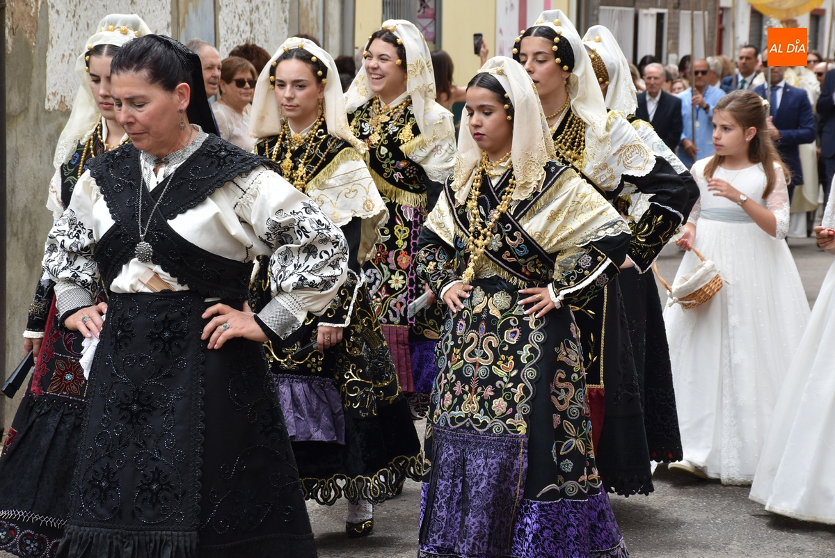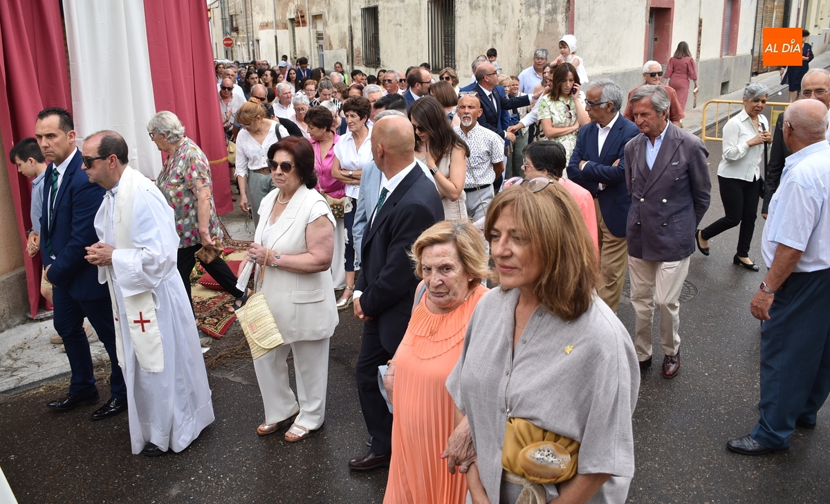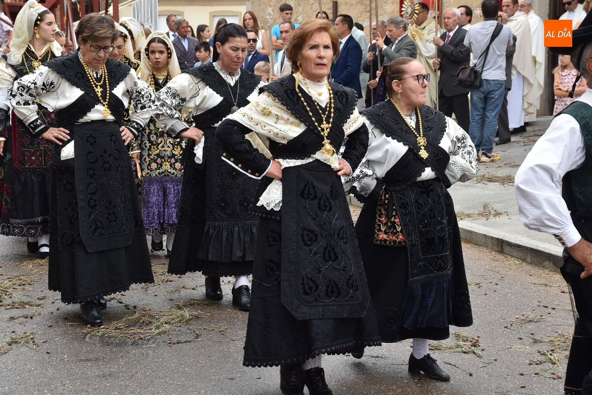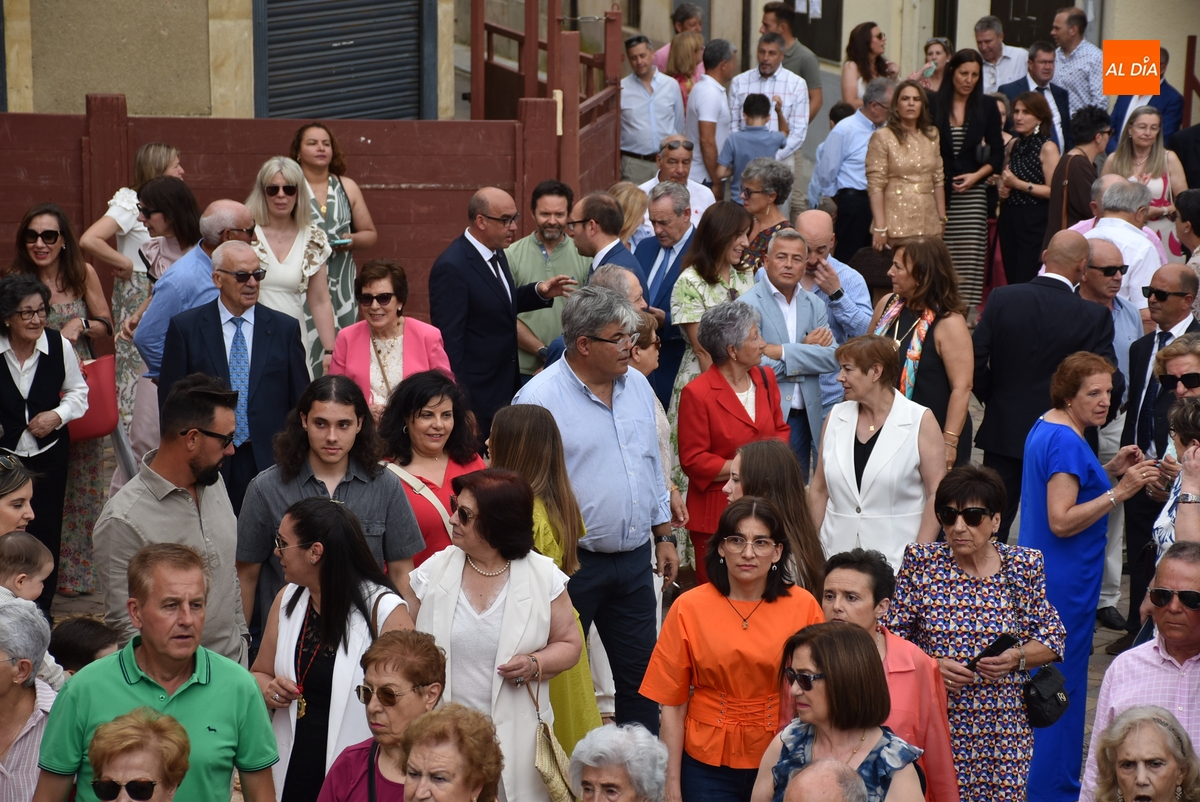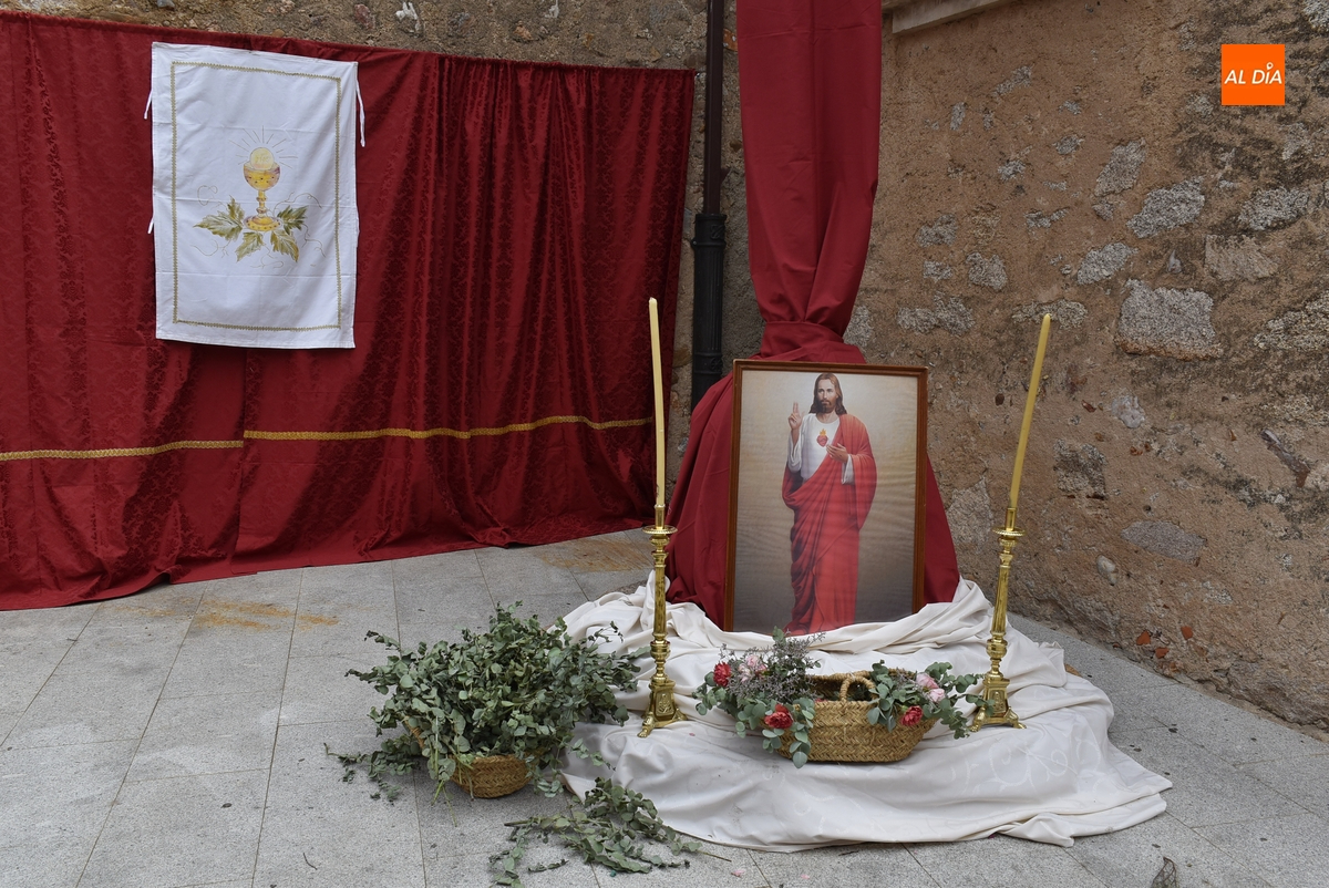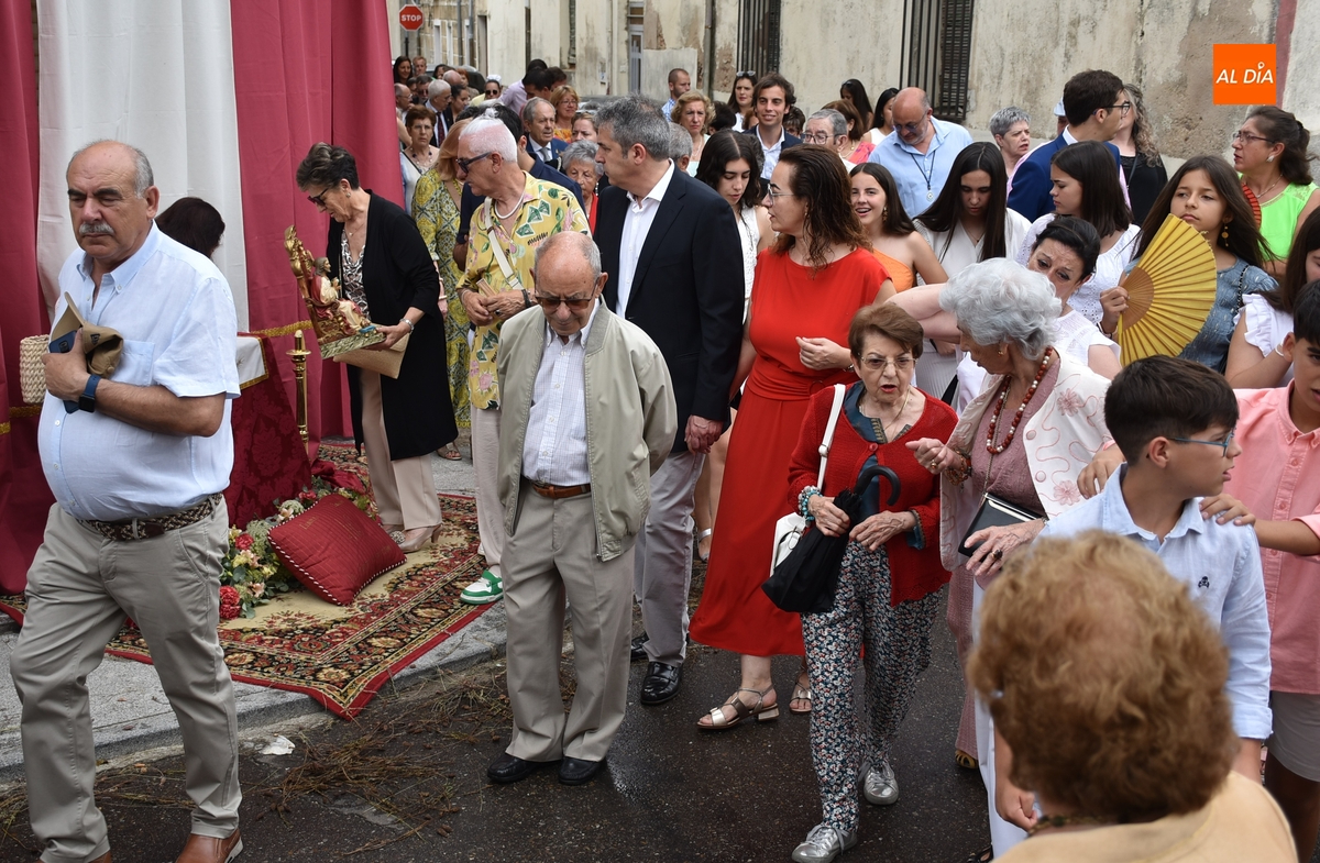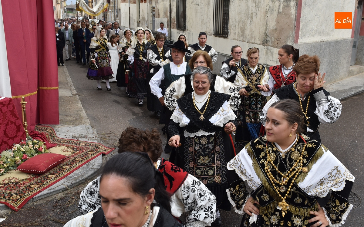 Así, la procesión pudo ponerse en marcha, encabezada por los estandartes distintivos del Corpus, a quiénes seguían las integrantes del Grupo de Baile Charro, cinco niños (4 niñas y un niño) que han tomado la Primera Comunión esta primavera en La Fuente de San Esteban, y los mayordomos de la celebración, Juan Ignacio García Rodríguez y Manuel Gallego Díez, quienes iban portando las varas. Tras ellos iba bajo palio el Santísimo Sacramento, arropado por unos cuantos sacerdotes encabezados por Anselmo Matilla.