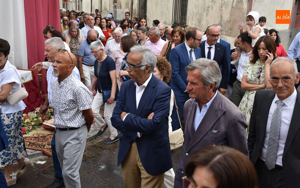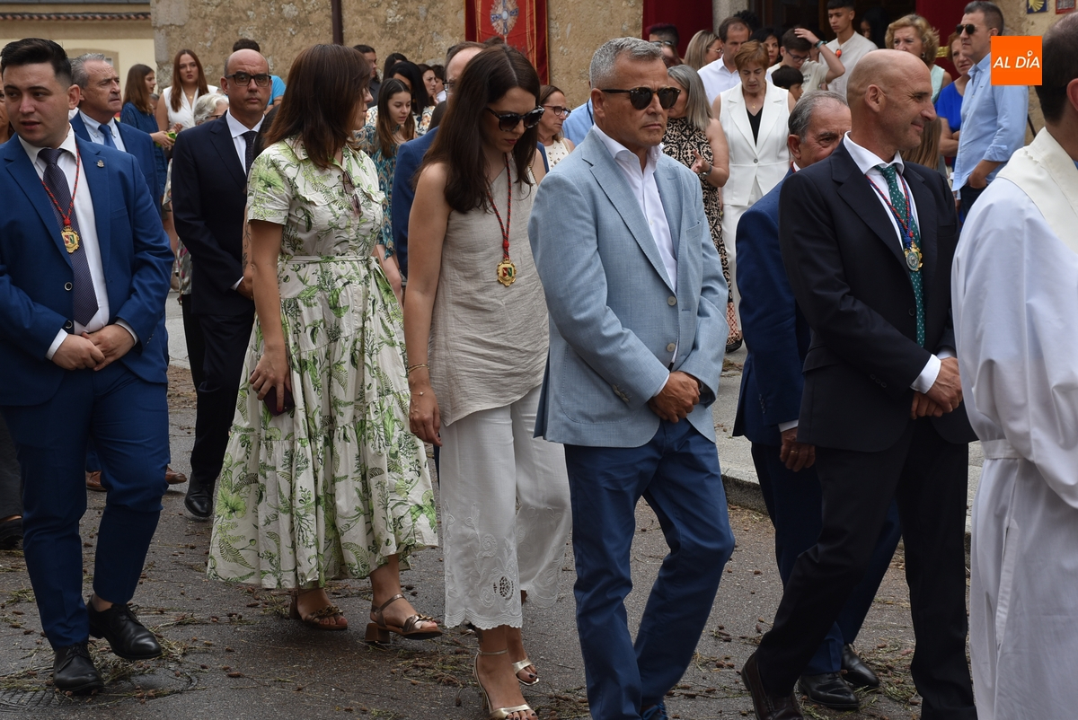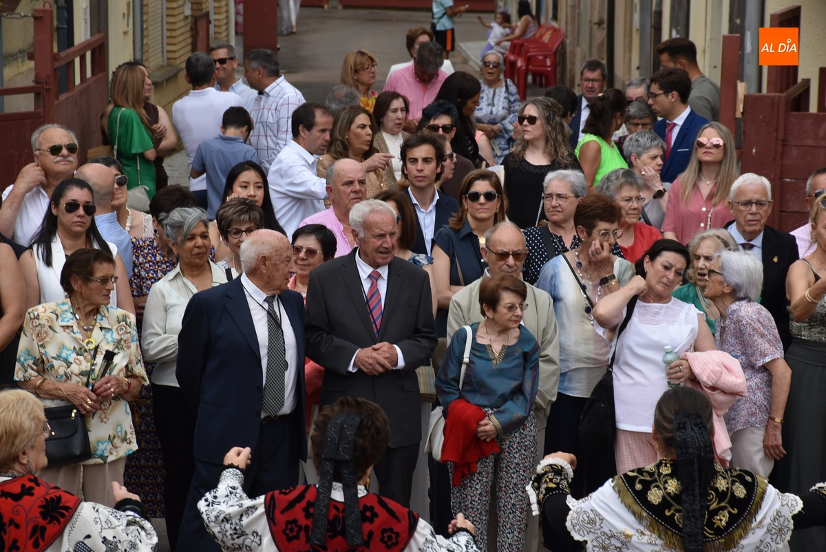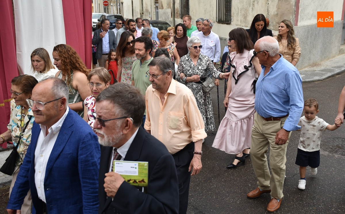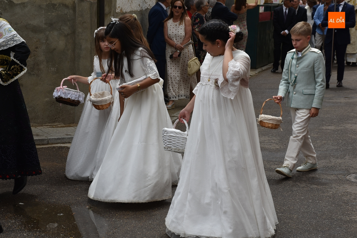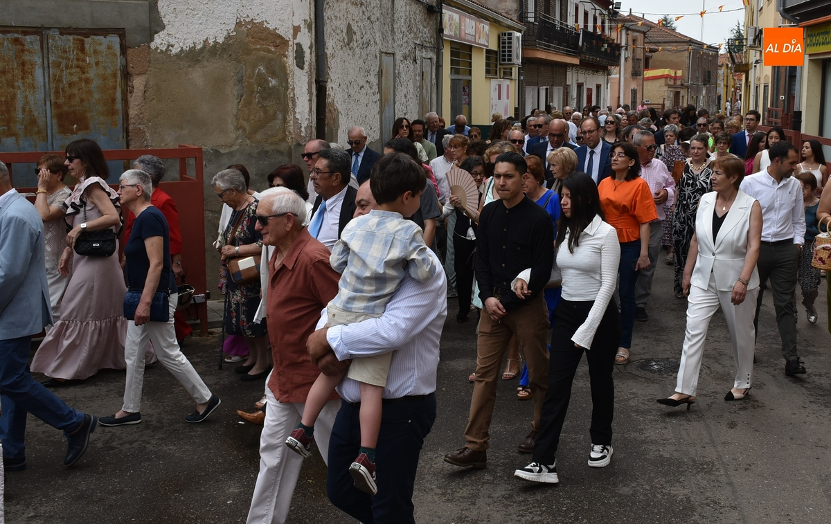 Así, la procesión pudo ponerse en marcha, encabezada por los estandartes distintivos del Corpus, a quiénes seguían las integrantes del Grupo de Baile Charro, cinco niños (4 niñas y un niño) que han tomado la Primera Comunión esta primavera en La Fuente de San Esteban, y los mayordomos de la celebración, Juan Ignacio García Rodríguez y Manuel Gallego Díez, quienes iban portando las varas. Tras ellos iba bajo palio el Santísimo Sacramento, arropado por unos cuantos sacerdotes encabezados por Anselmo Matilla.