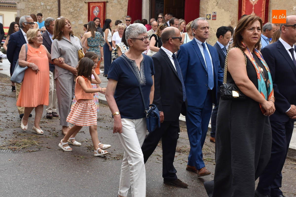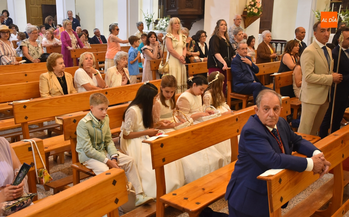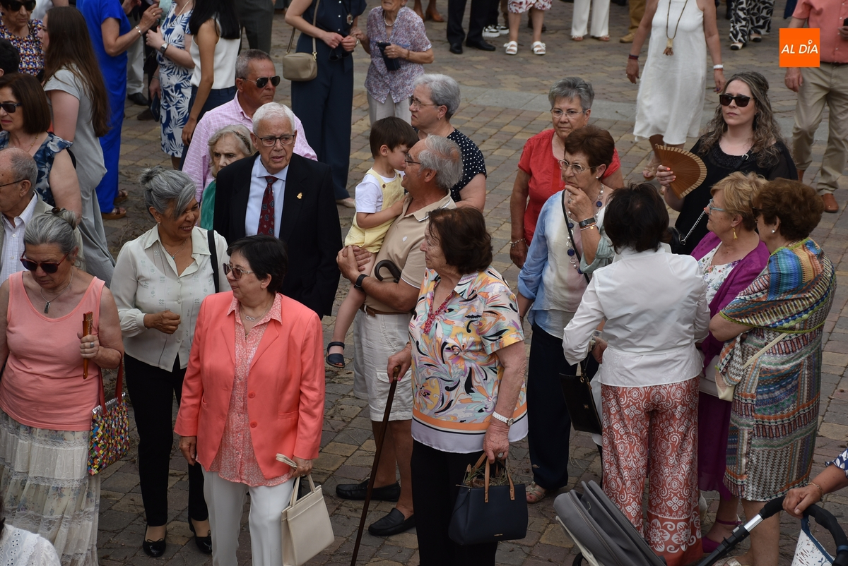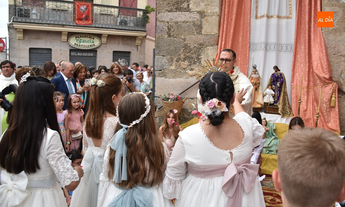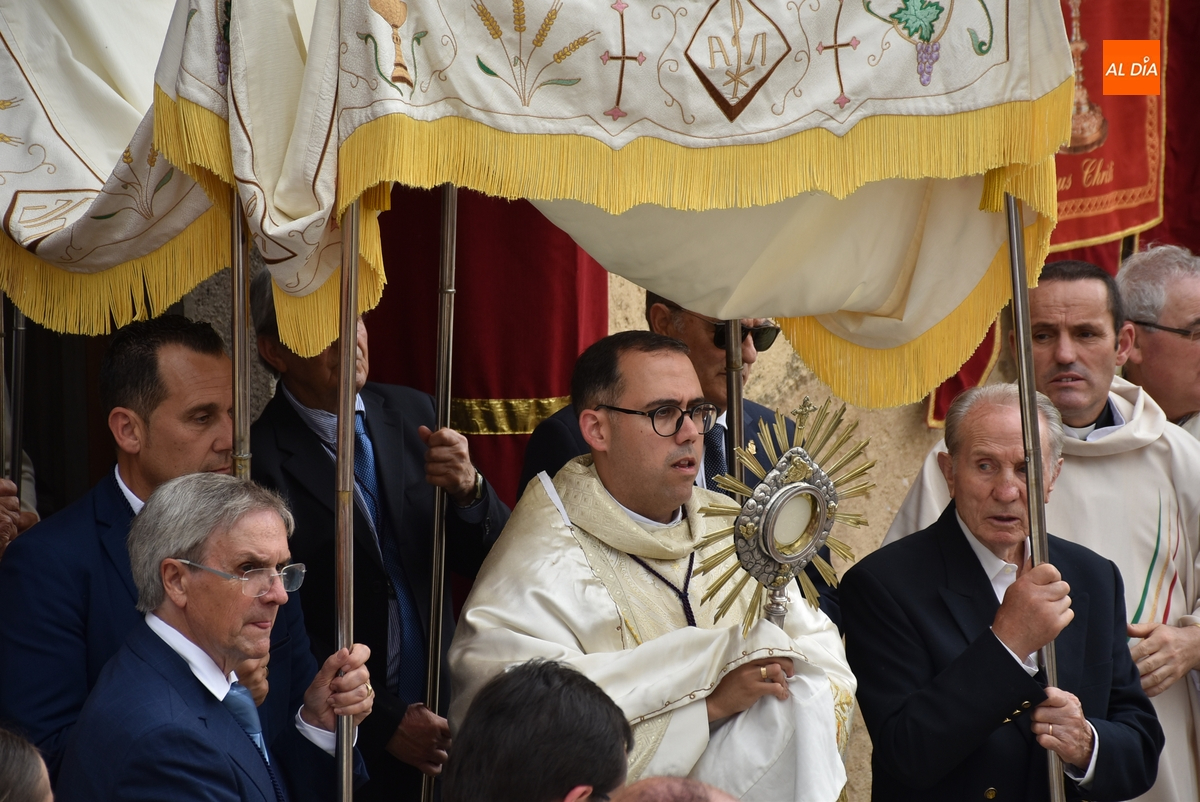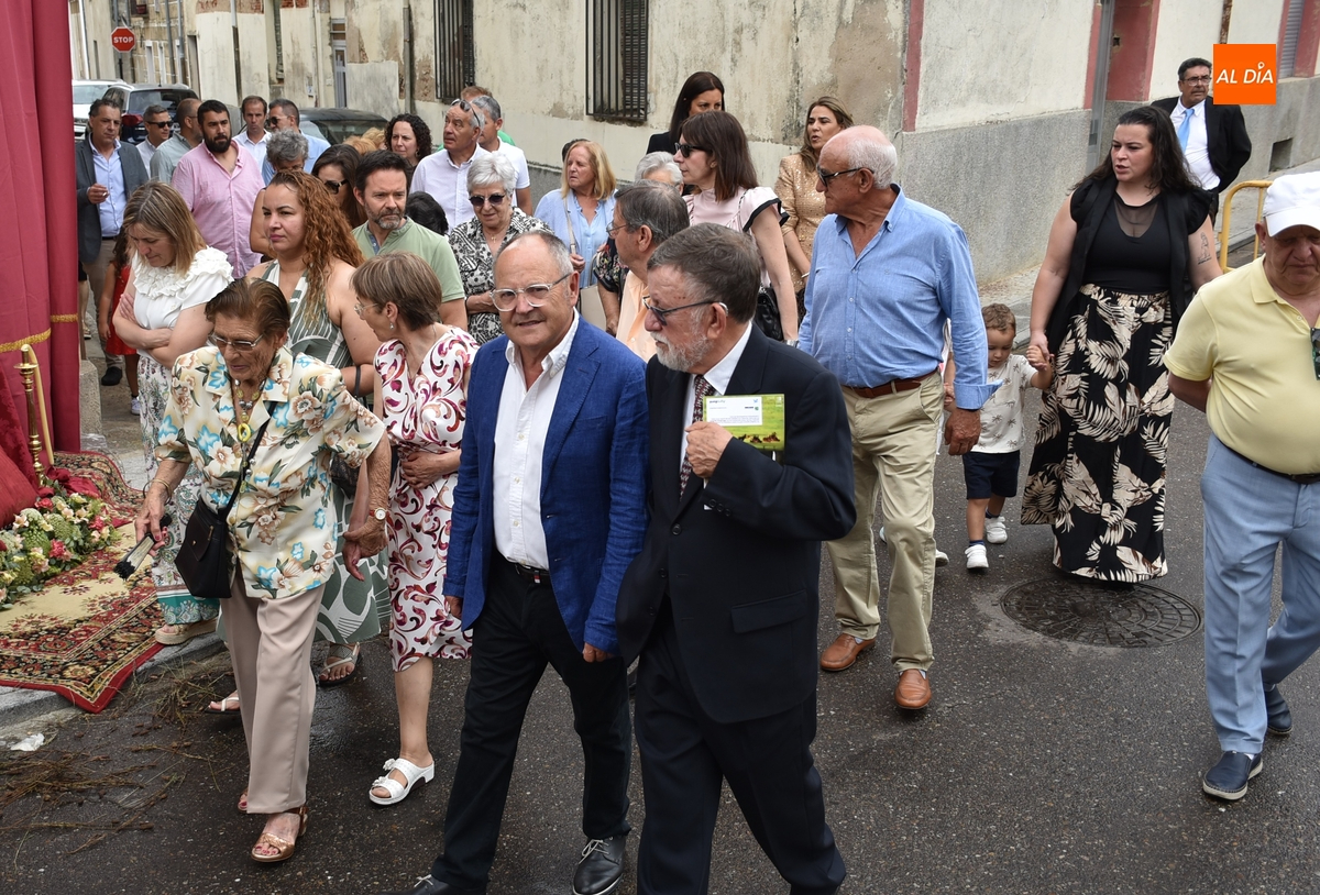 Así, la procesión pudo ponerse en marcha, encabezada por los estandartes distintivos del Corpus, a quiénes seguían las integrantes del Grupo de Baile Charro, cinco niños (4 niñas y un niño) que han tomado la Primera Comunión esta primavera en La Fuente de San Esteban, y los mayordomos de la celebración, Juan Ignacio García Rodríguez y Manuel Gallego Díez, quienes iban portando las varas. Tras ellos iba bajo palio el Santísimo Sacramento, arropado por unos cuantos sacerdotes encabezados por Anselmo Matilla.