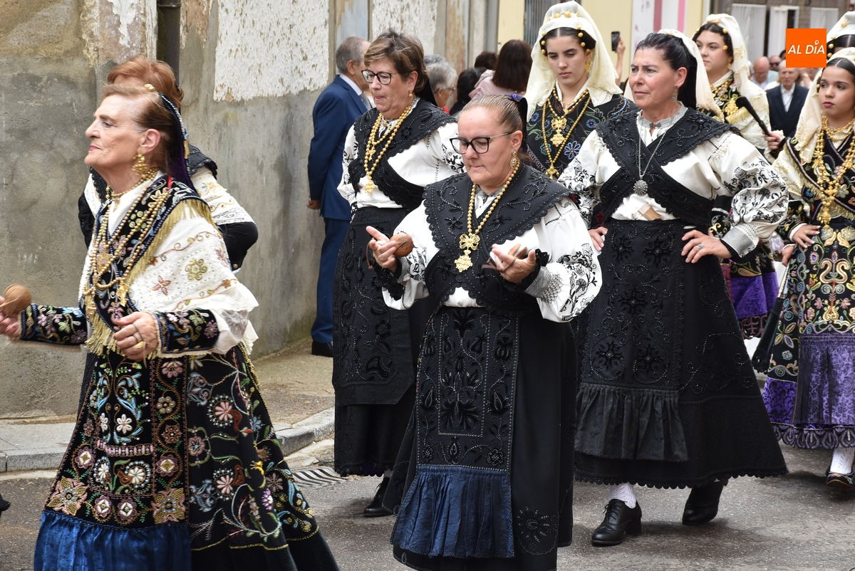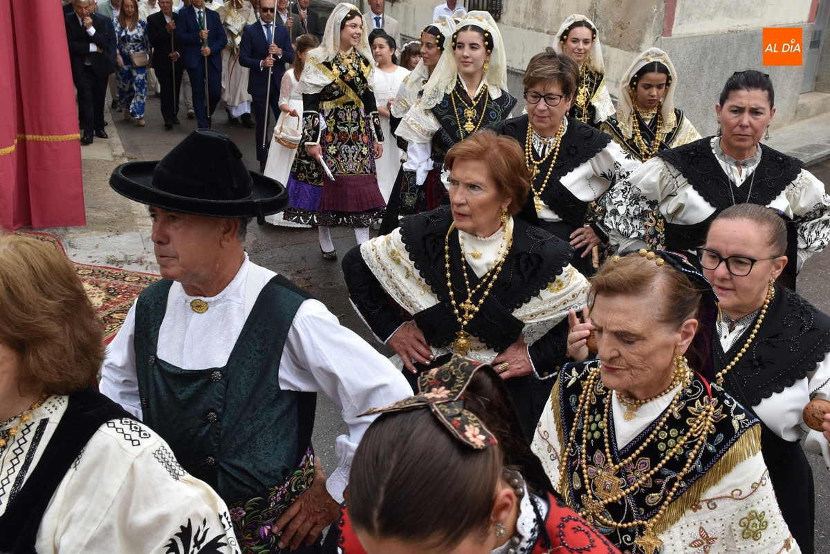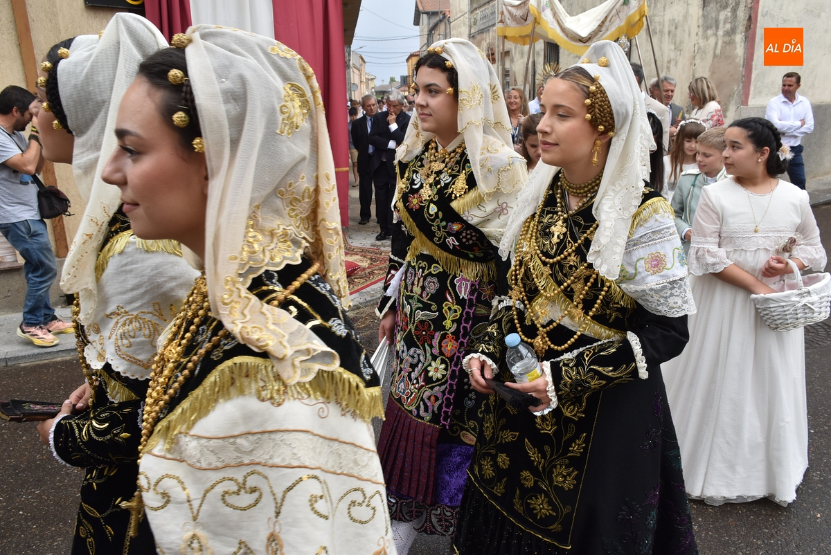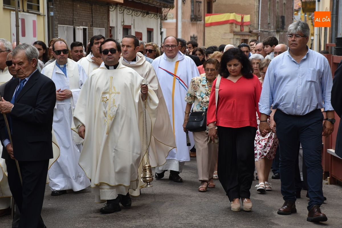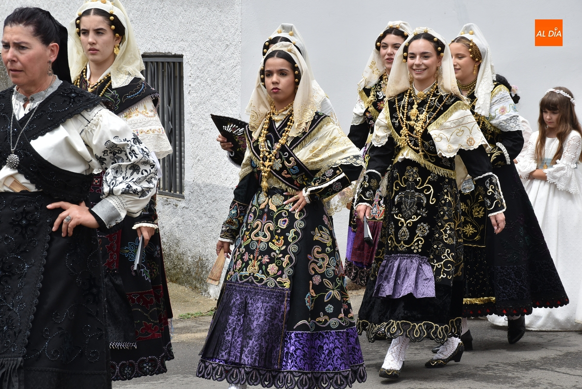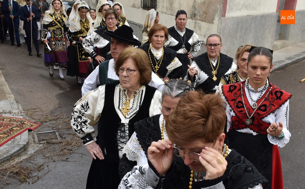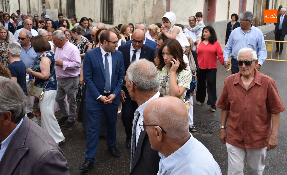 Así, la procesión pudo ponerse en marcha, encabezada por los estandartes distintivos del Corpus, a quiénes seguían las integrantes del Grupo de Baile Charro, cinco niños (4 niñas y un niño) que han tomado la Primera Comunión esta primavera en La Fuente de San Esteban, y los mayordomos de la celebración, Juan Ignacio García Rodríguez y Manuel Gallego Díez, quienes iban portando las varas. Tras ellos iba bajo palio el Santísimo Sacramento, arropado por unos cuantos sacerdotes encabezados por Anselmo Matilla.