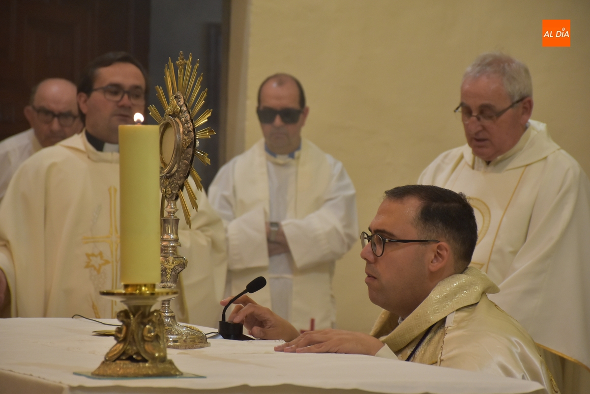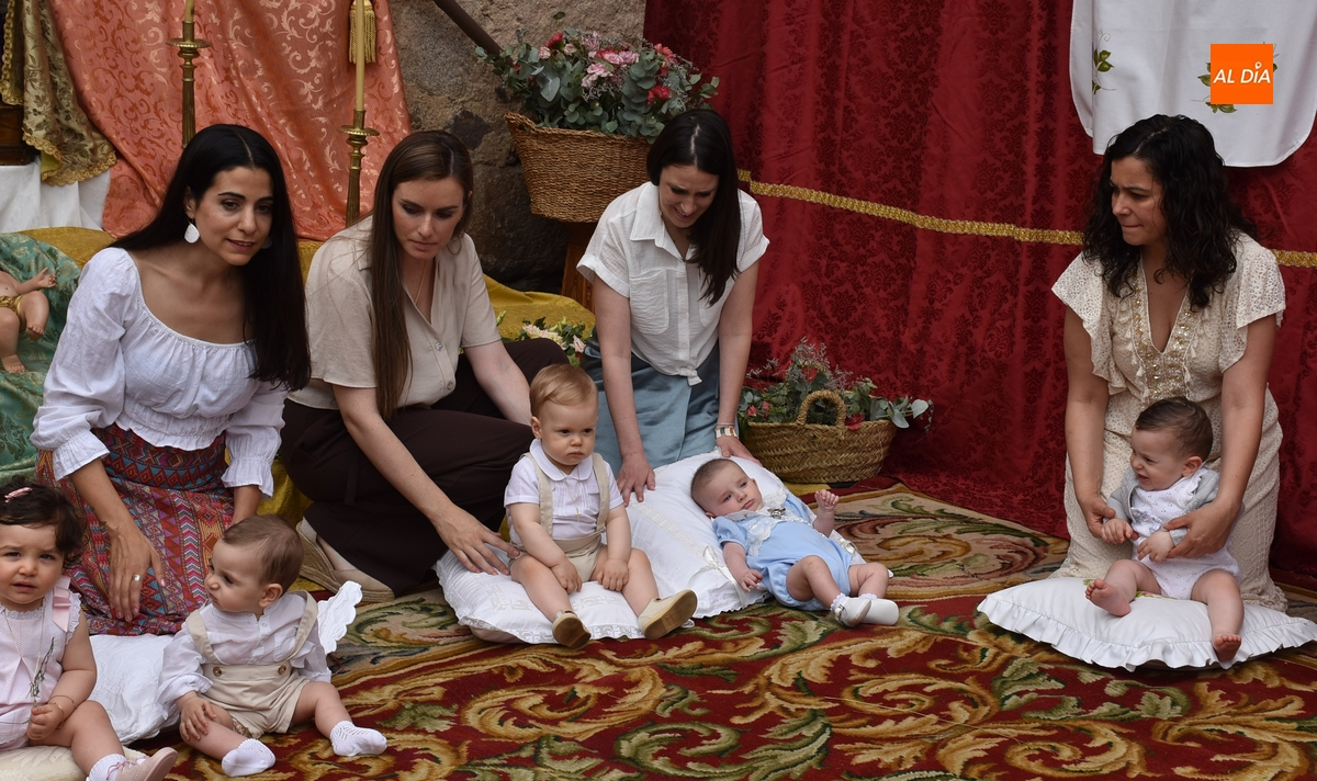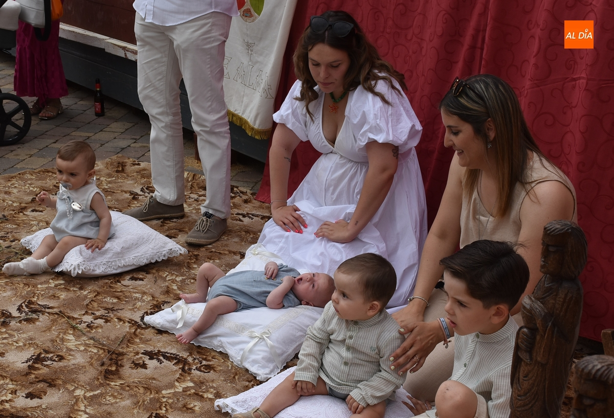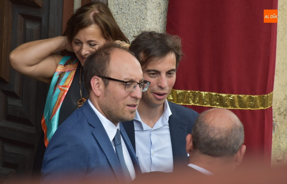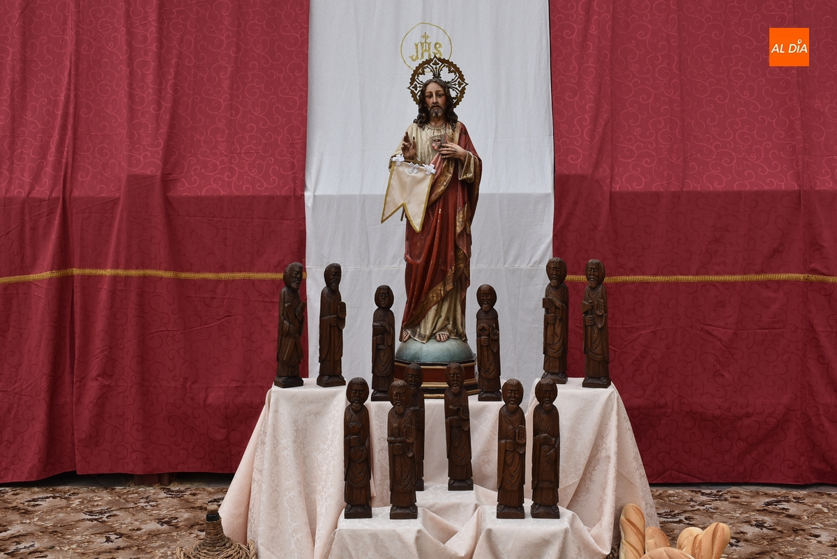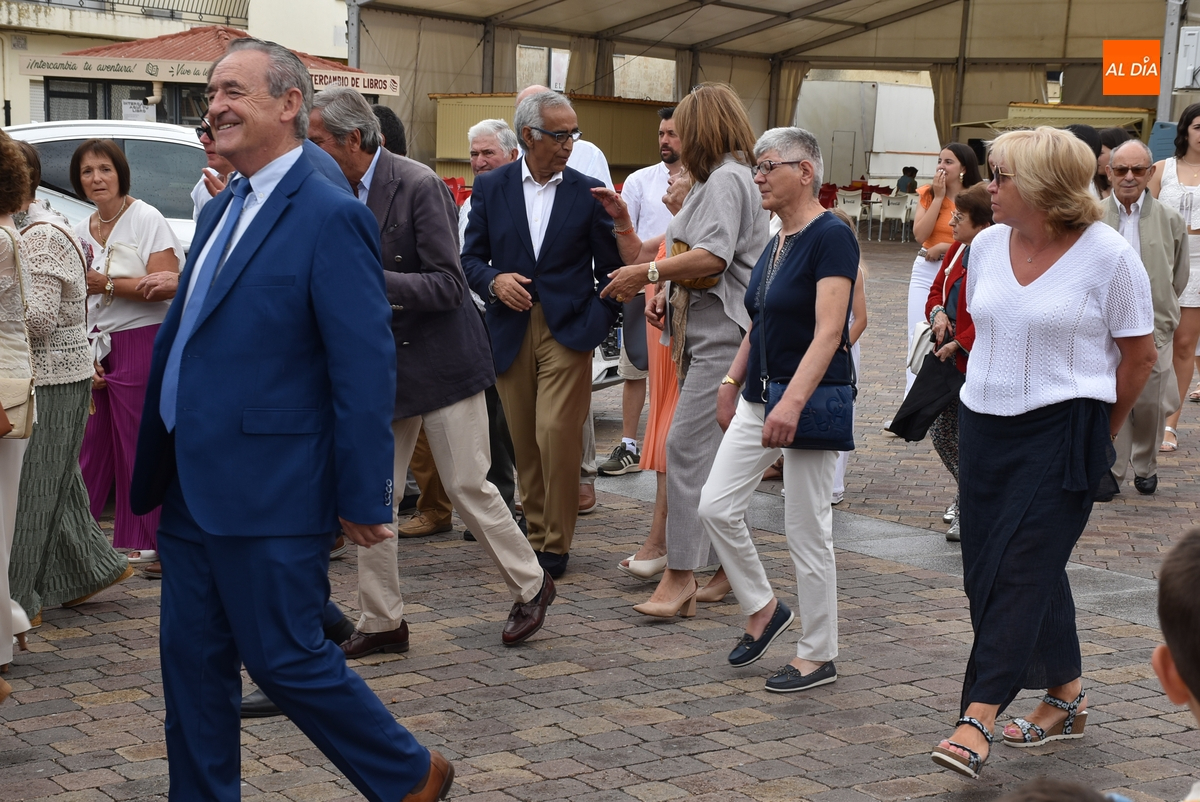 Así, la procesión pudo ponerse en marcha, encabezada por los estandartes distintivos del Corpus, a quiénes seguían las integrantes del Grupo de Baile Charro, cinco niños (4 niñas y un niño) que han tomado la Primera Comunión esta primavera en La Fuente de San Esteban, y los mayordomos de la celebración, Juan Ignacio García Rodríguez y Manuel Gallego Díez, quienes iban portando las varas. Tras ellos iba bajo palio el Santísimo Sacramento, arropado por unos cuantos sacerdotes encabezados por Anselmo Matilla.
