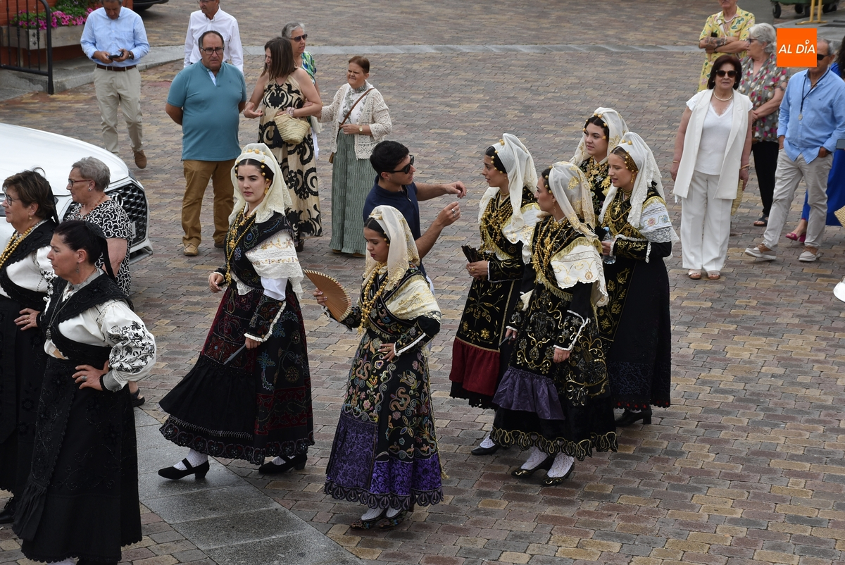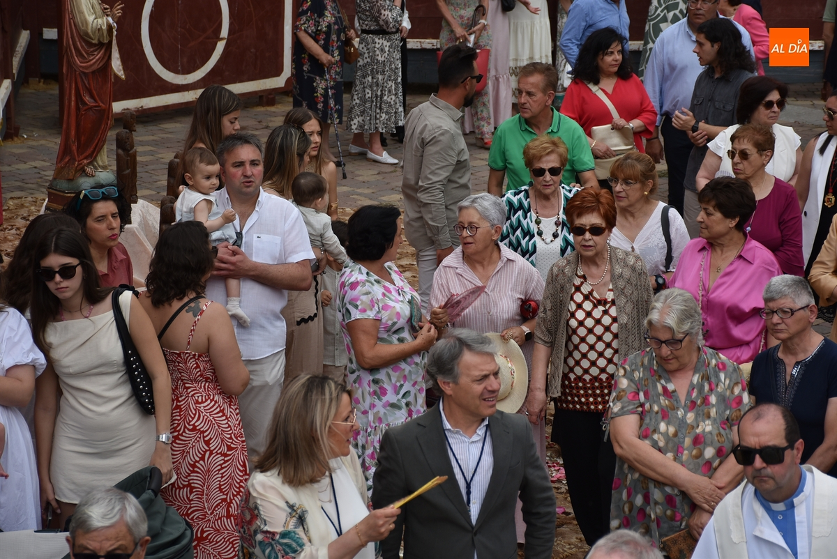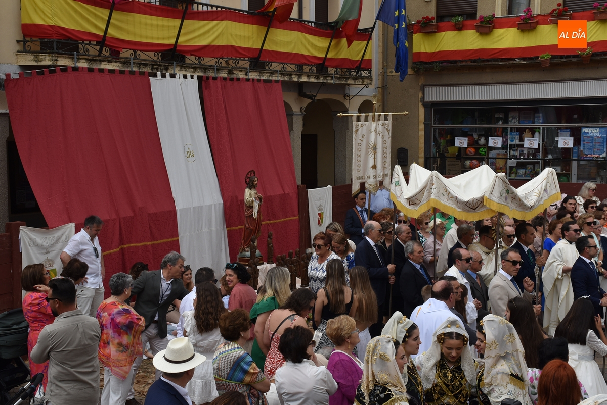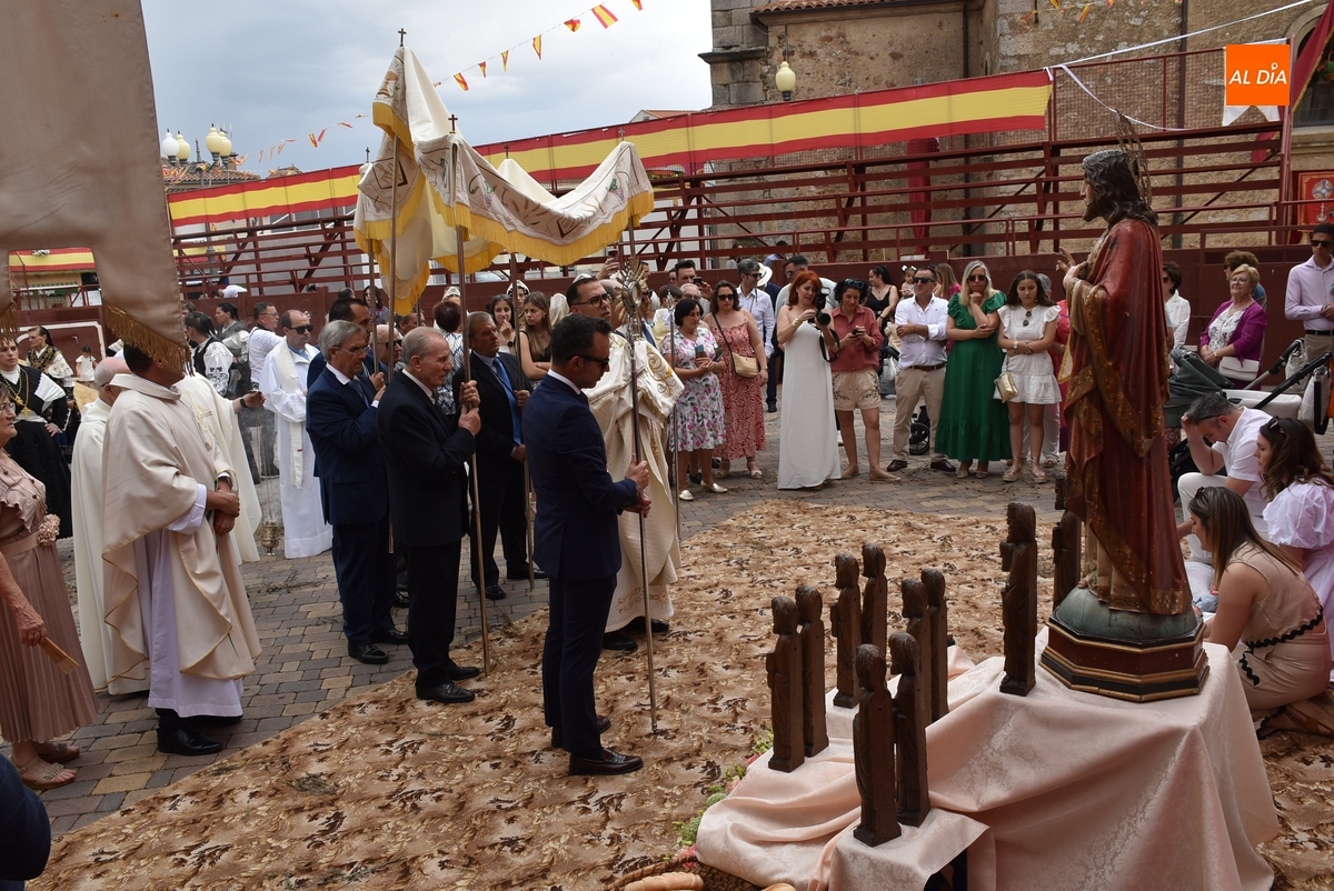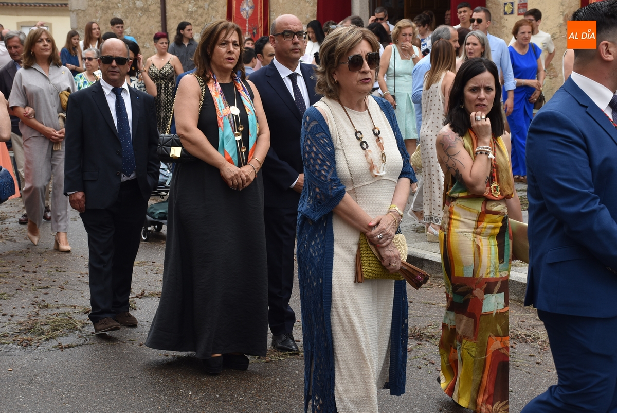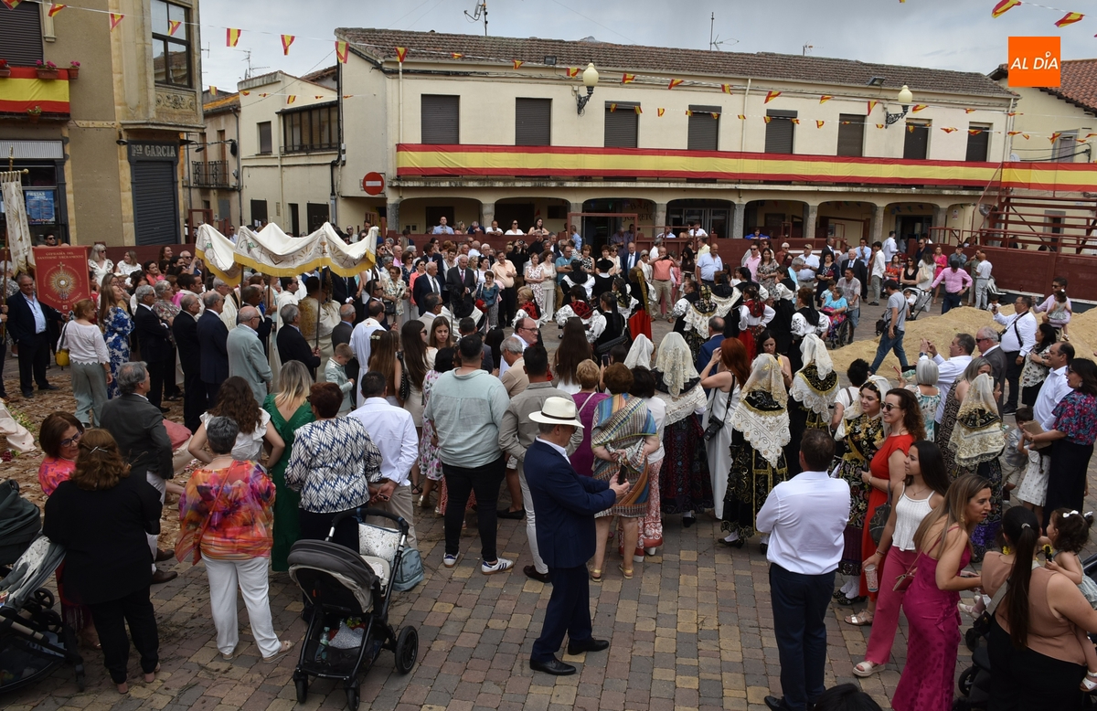 A continuación, siempre bajo palio, fue introducido en la Iglesia Parroquial, donde se impartió la bendición final, mientras en el exterior continuaban los bailes del Grupo de Baile Charro, que se tuvieron que interrumpir de nuevo por culpa de la lluvia, que volvió a hacer acto de presencia con otro chaparrón breve pero intenso. De este modo, todos los presentes se tuvieron que ir a tomar algo a cubierto.