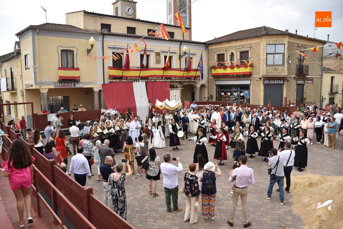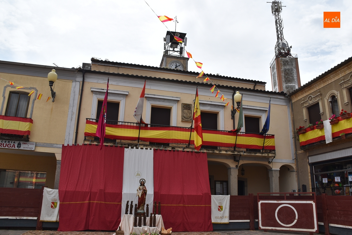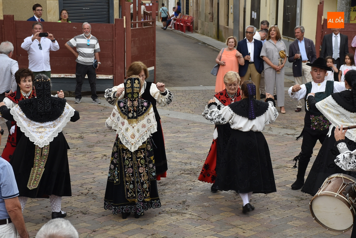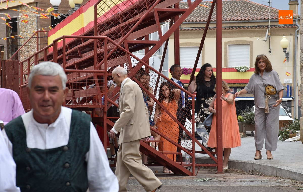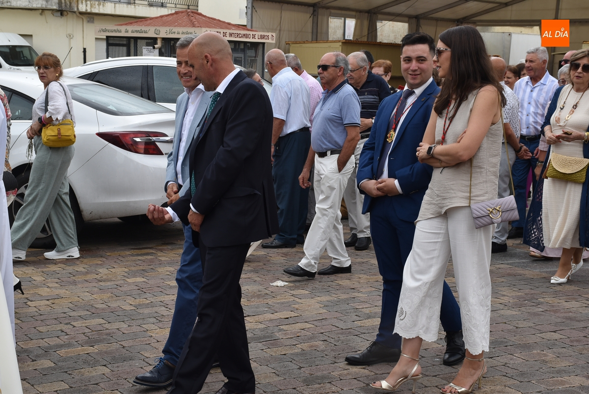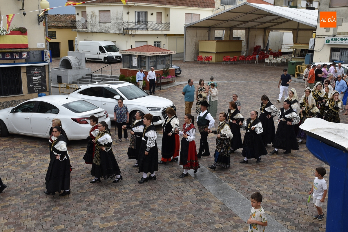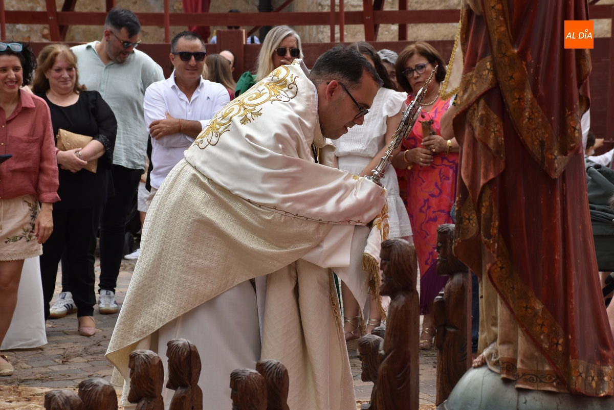 A continuación, siempre bajo palio, fue introducido en la Iglesia Parroquial, donde se impartió la bendición final, mientras en el exterior continuaban los bailes del Grupo de Baile Charro, que se tuvieron que interrumpir de nuevo por culpa de la lluvia, que volvió a hacer acto de presencia con otro chaparrón breve pero intenso. De este modo, todos los presentes se tuvieron que ir a tomar algo a cubierto.