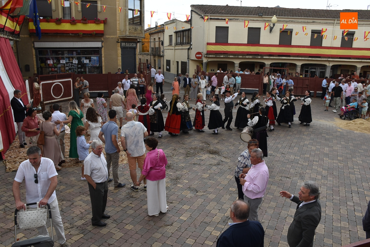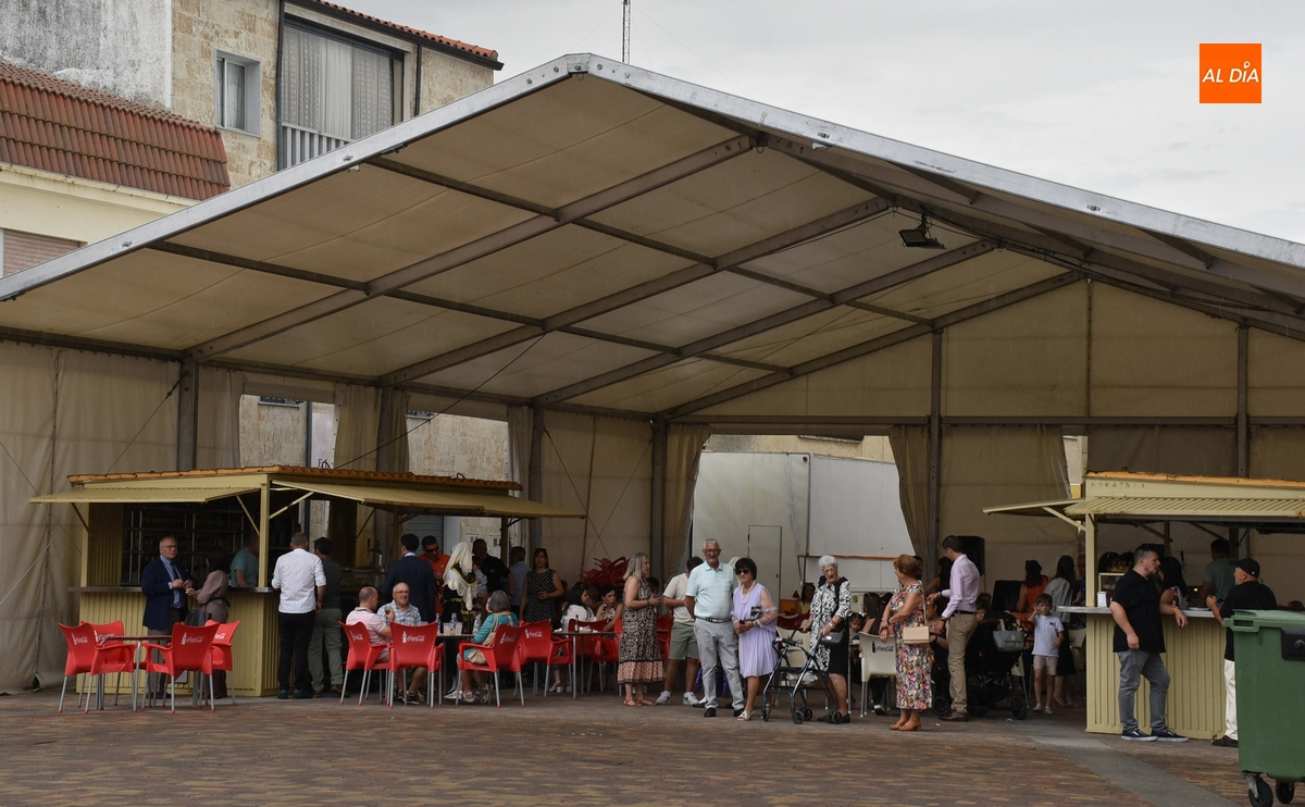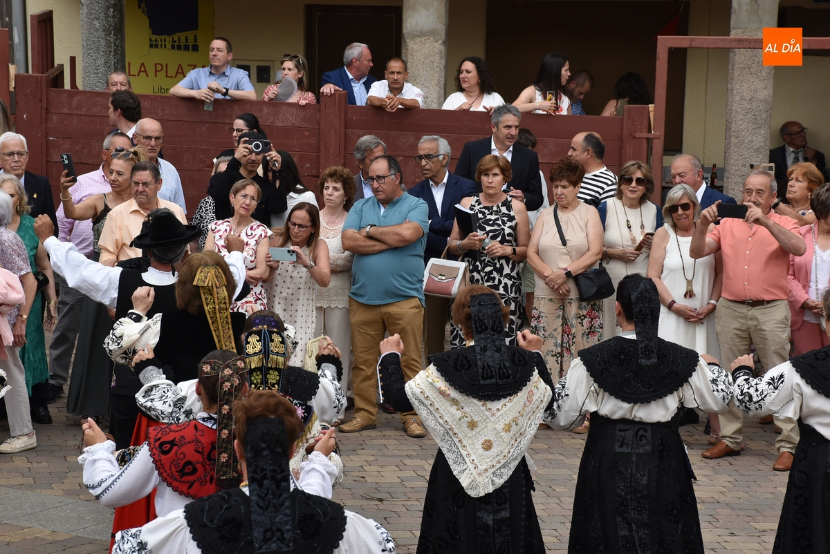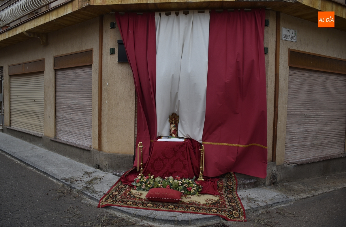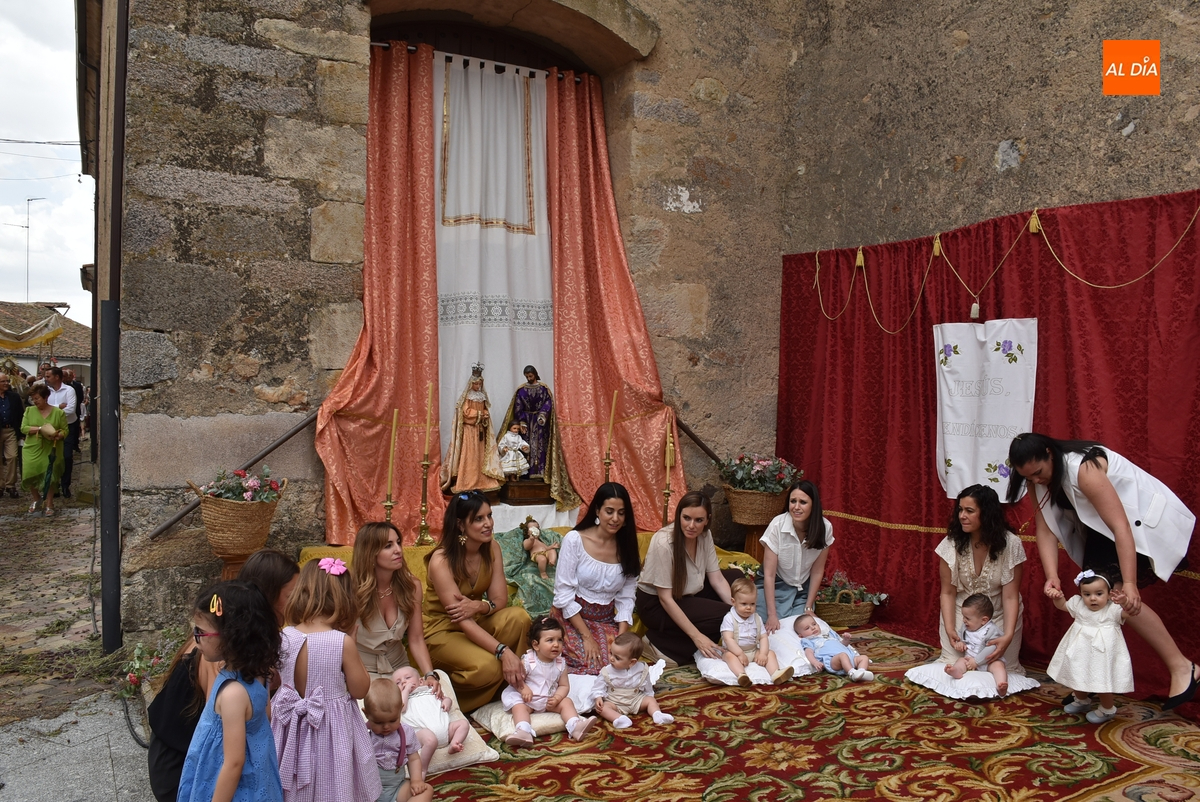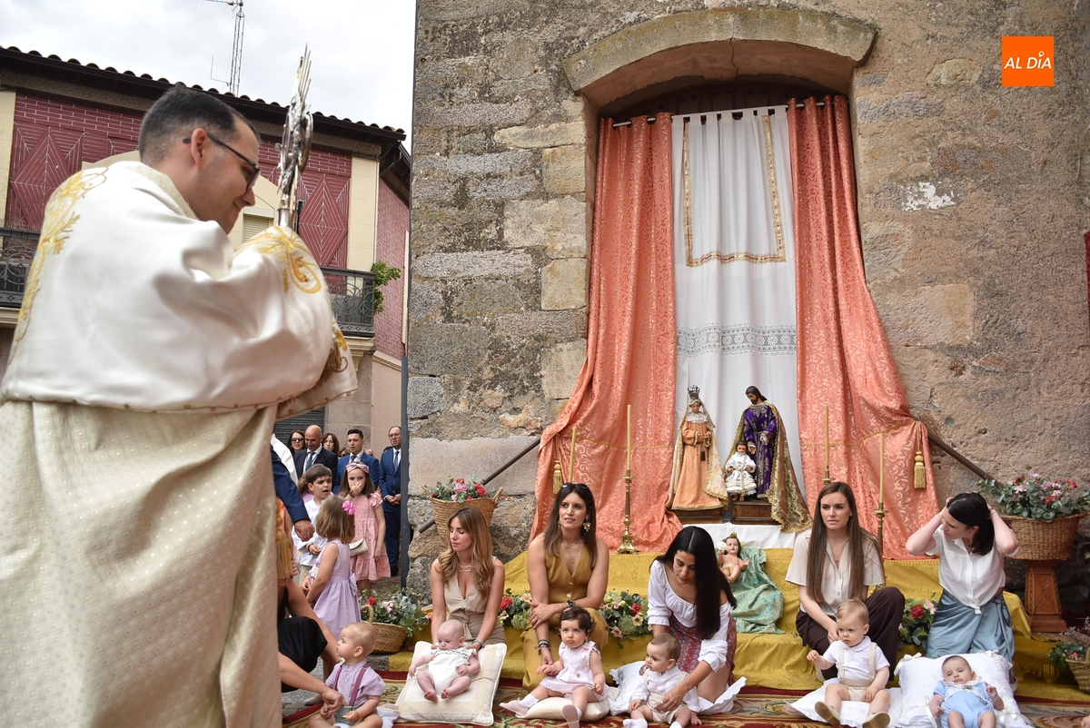 A continuación, siempre bajo palio, fue introducido en la Iglesia Parroquial, donde se impartió la bendición final, mientras en el exterior continuaban los bailes del Grupo de Baile Charro, que se tuvieron que interrumpir de nuevo por culpa de la lluvia, que volvió a hacer acto de presencia con otro chaparrón breve pero intenso. De este modo, todos los presentes se tuvieron que ir a tomar algo a cubierto.