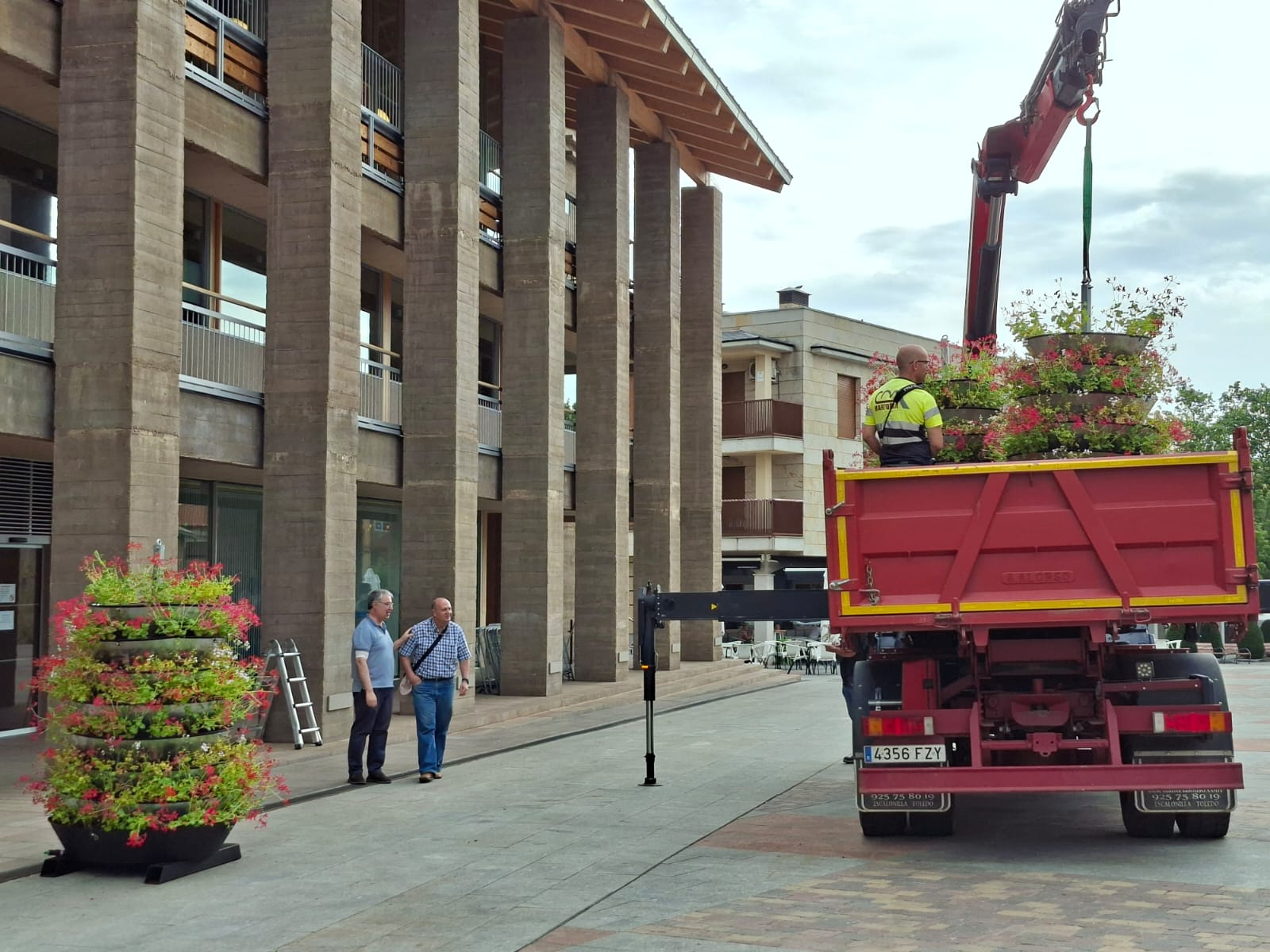 El Ayuntamiento ha instalado cuatro torres con jardineras cónicas y sistema de riego integrado, buscando aportar color y vida vegetal al renovado corazón del municipio