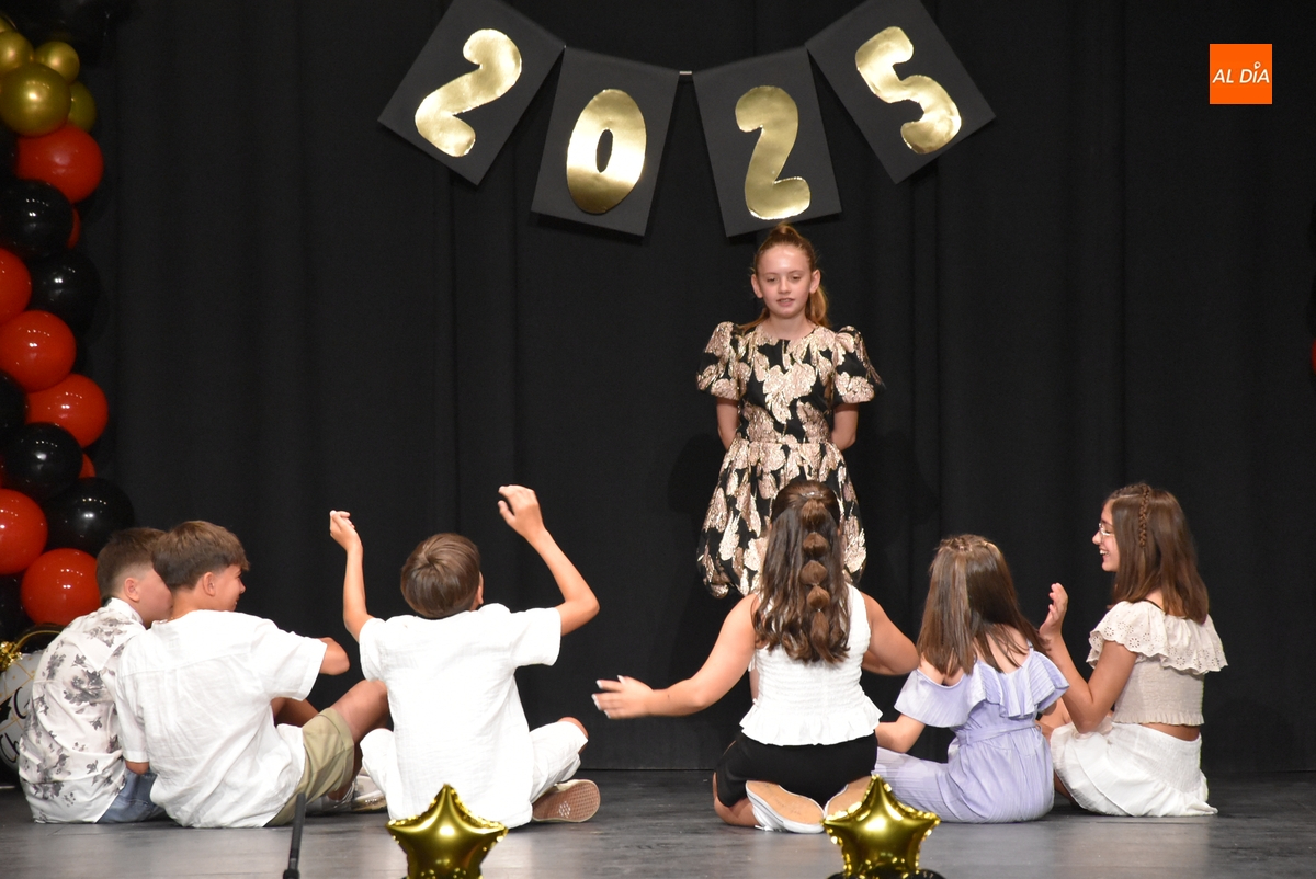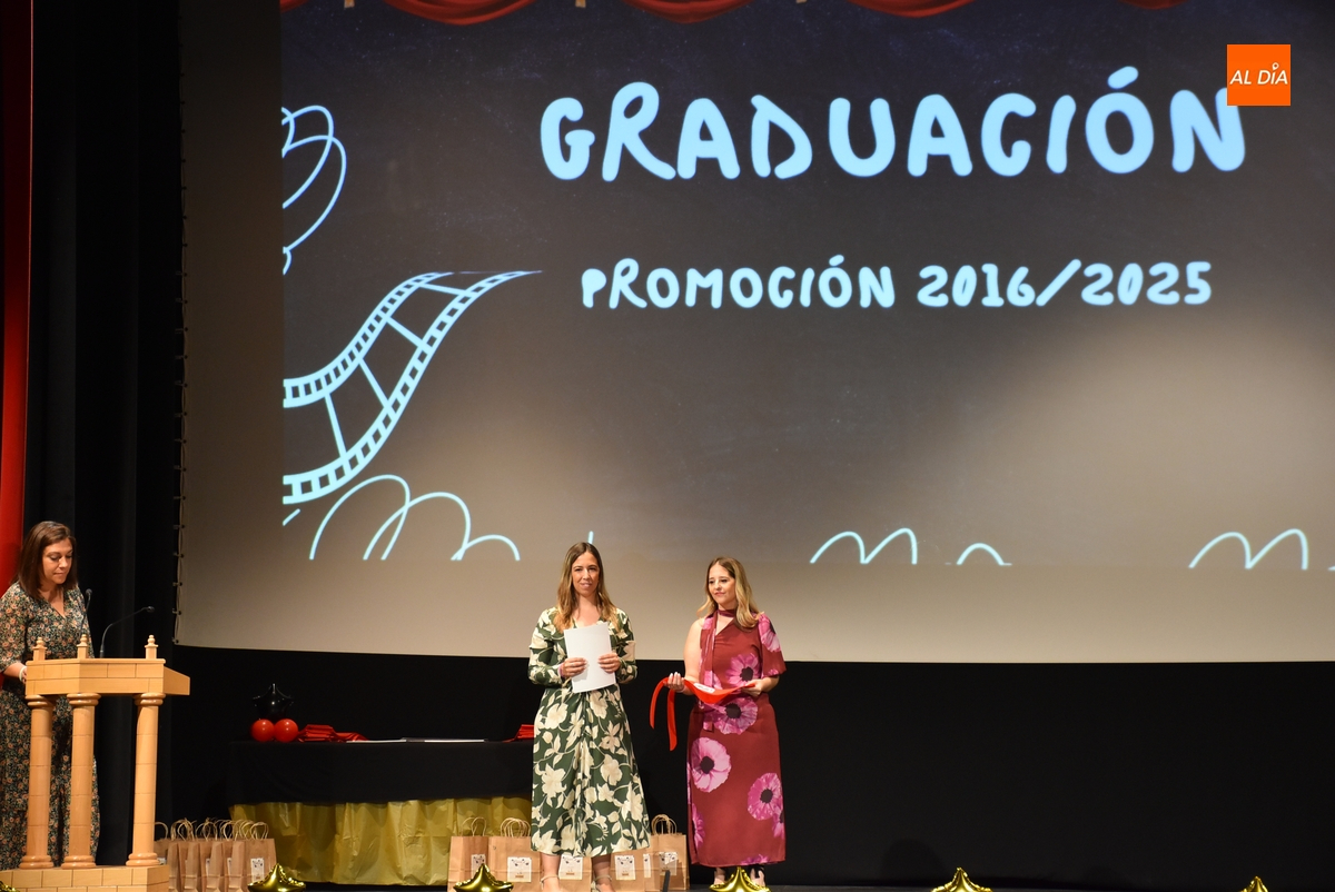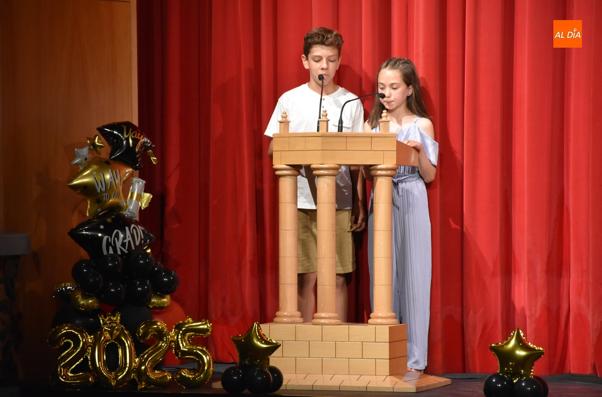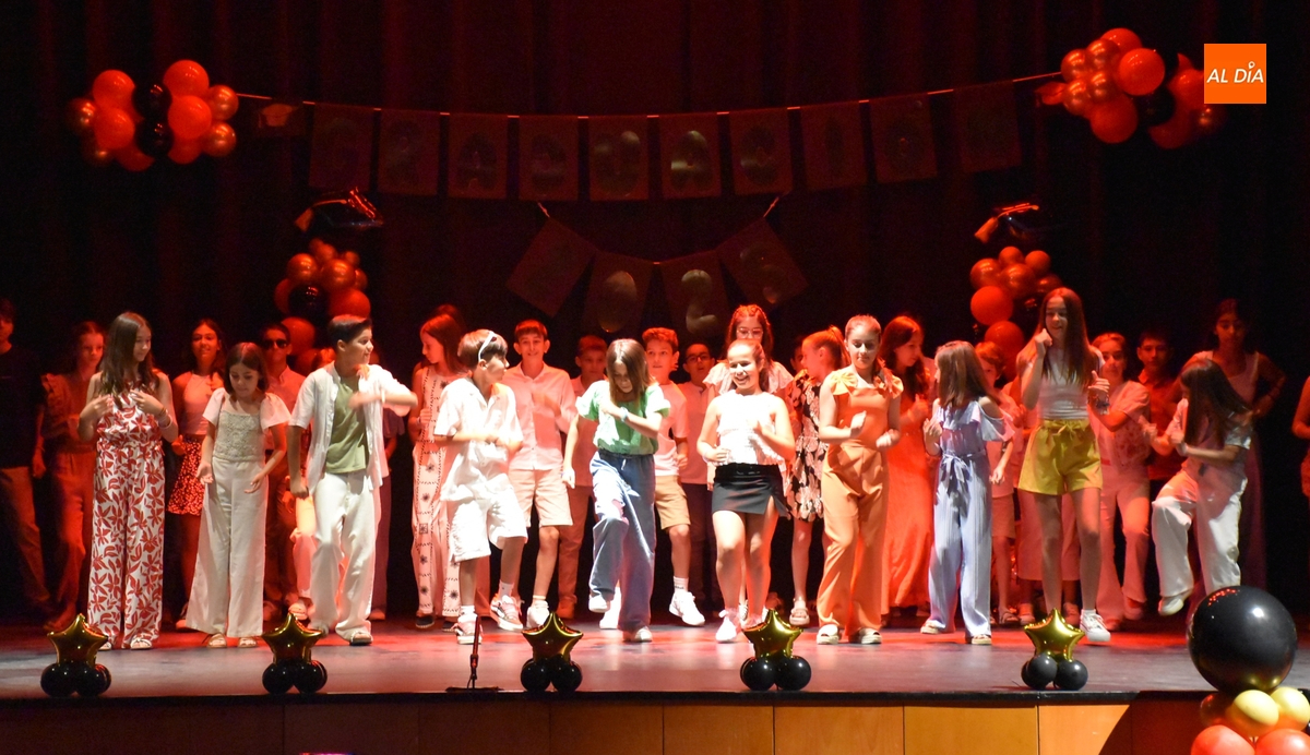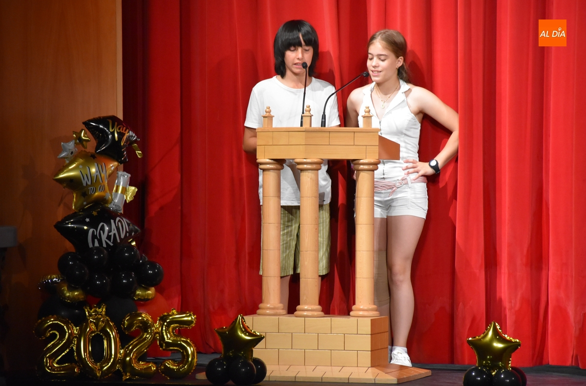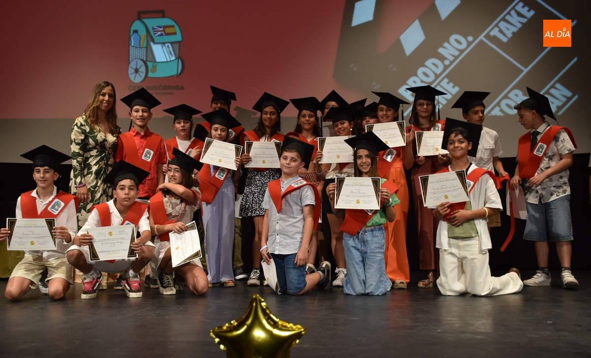 El Colegio Miróbriga de Ciudad Rodrigo graduó en la mañana del viernes a su promoción 2016-2025, con una ceremonia en el Teatro Nuevo Fernando Arrabal que, además de los componentes habituales de este tipo de actos, tuvo una parte artística, ya que cada una de las dos clases ofreció un ‘espectáculo’ (los de 6ºB pusieron en escena una obra de teatro creada por ellos mismos que repasa sus años en el Colegio, recordando por ejemplo cuando les tocó vivir el coronavirus).