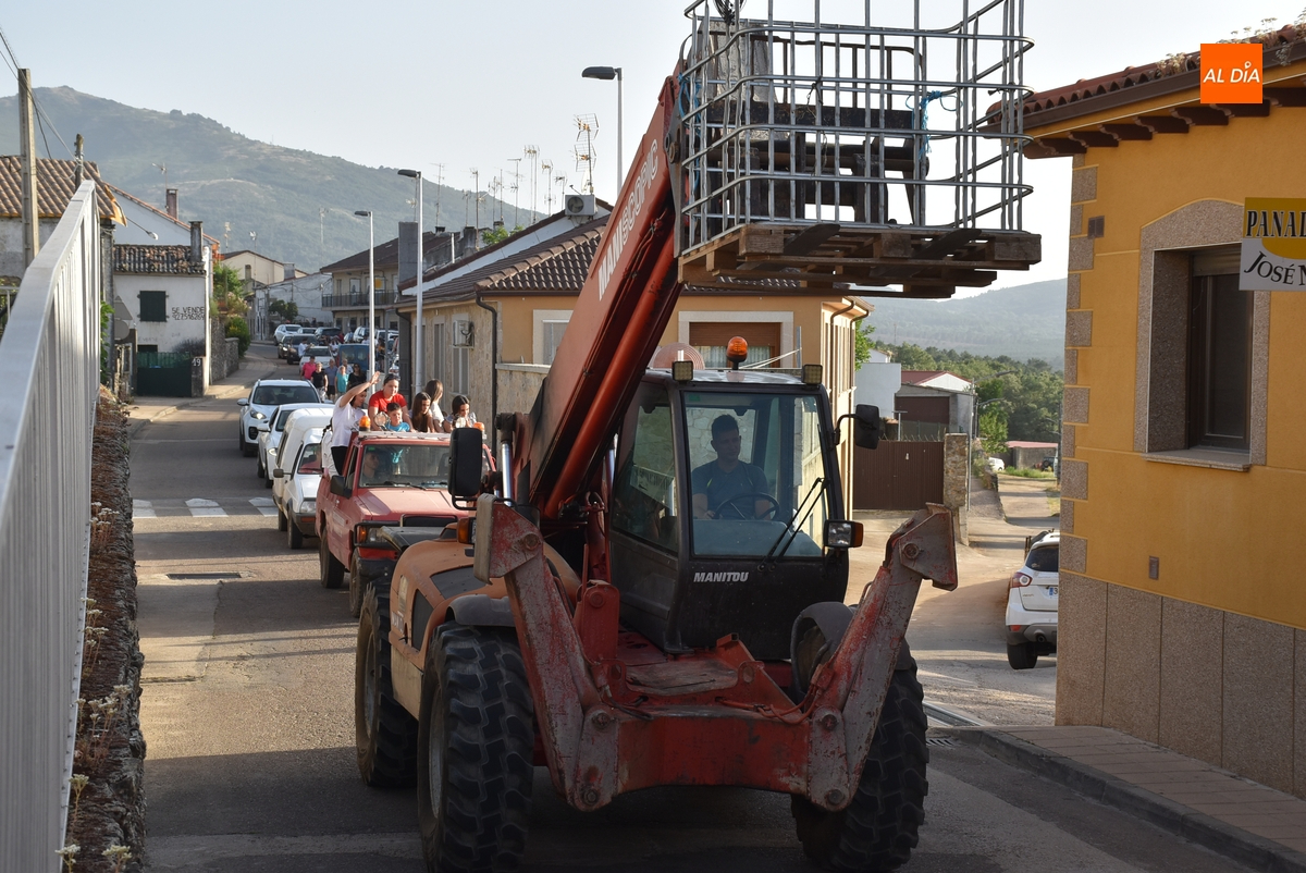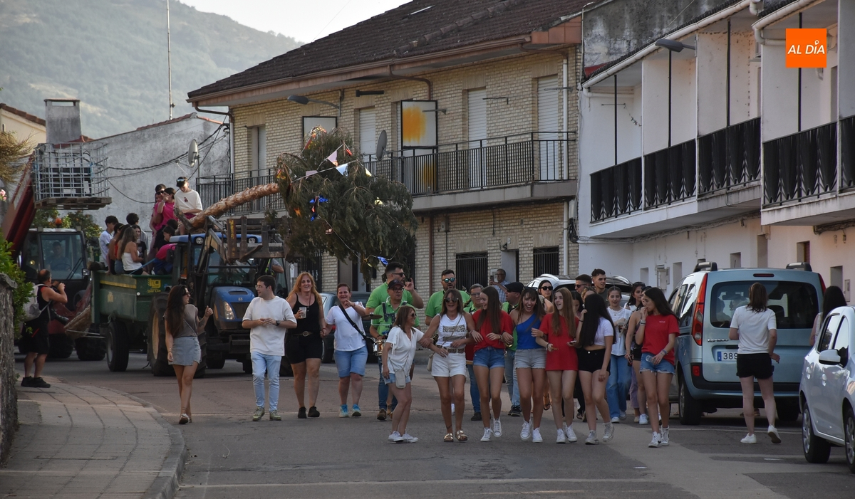 Esa comitiva estaba encabezada a pie por los integrantes de la Charanga Al Rojo, con cuyos sones fueron bailando varias personas justo delante del remolque que transportaba la viga, sobre la que iban subidos los 5 Kintos de este 2025: Hugo, Lidia, Edu, Alba y Rocío, quienes estuvieron acompañados por otros niños y jóvenes que en los próximos años tendrán la misma responsabilidad. A continuación, iban varios vehículos más con personas que habían participado en la tala y traída hasta El Payo de la viga.
