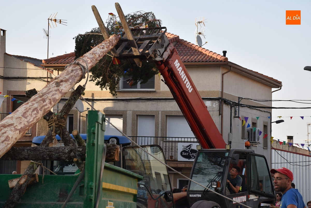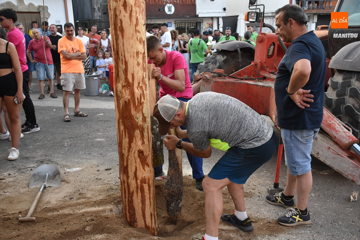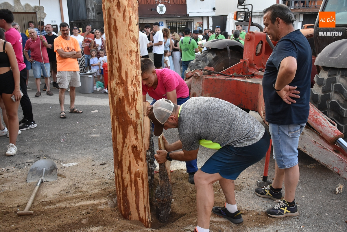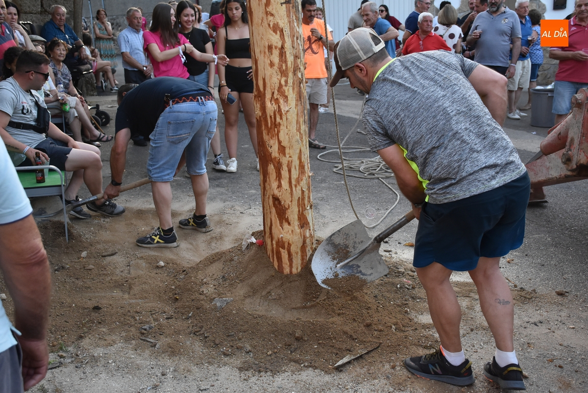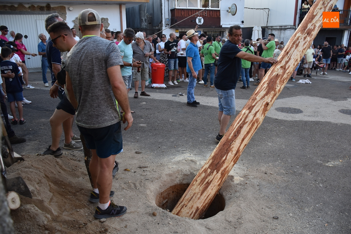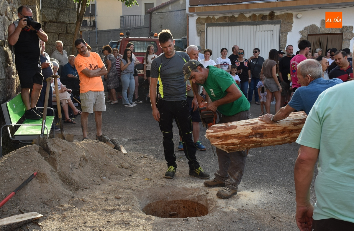 Una vez en la Plaza Mayor, comenzó la minuciosa tarea de izarla, para lo que se empleó el propio remolque en el que venía y otra máquina, así como unas cuerdas situadas en la mitad del tronco de las que fueron tirando varios vecinos en distintas direcciones para dejar la viga lo más recta posible. Mientras esa tarea estaba en marcha, todos los presentes pudieron dar buena cuenta de los dulces y la sangría que se fueron repartiendo de forma gratuita.