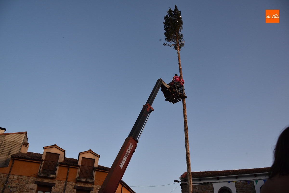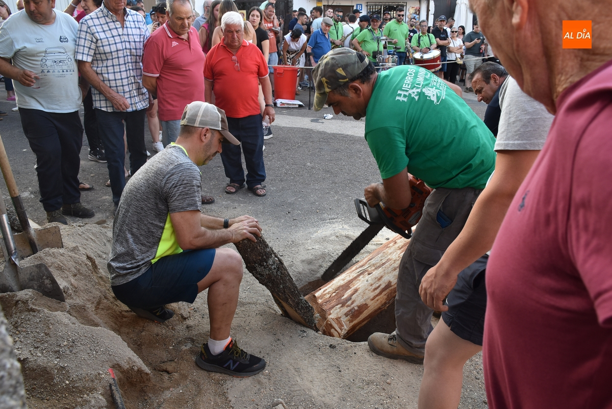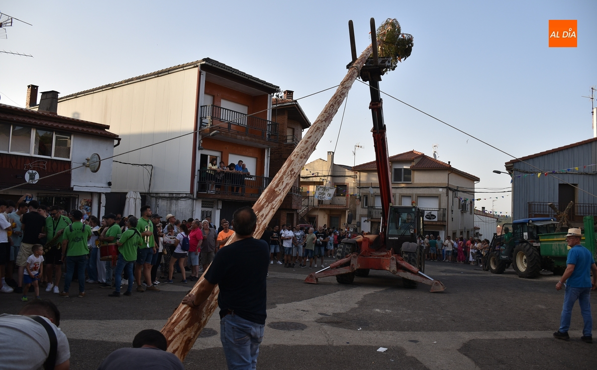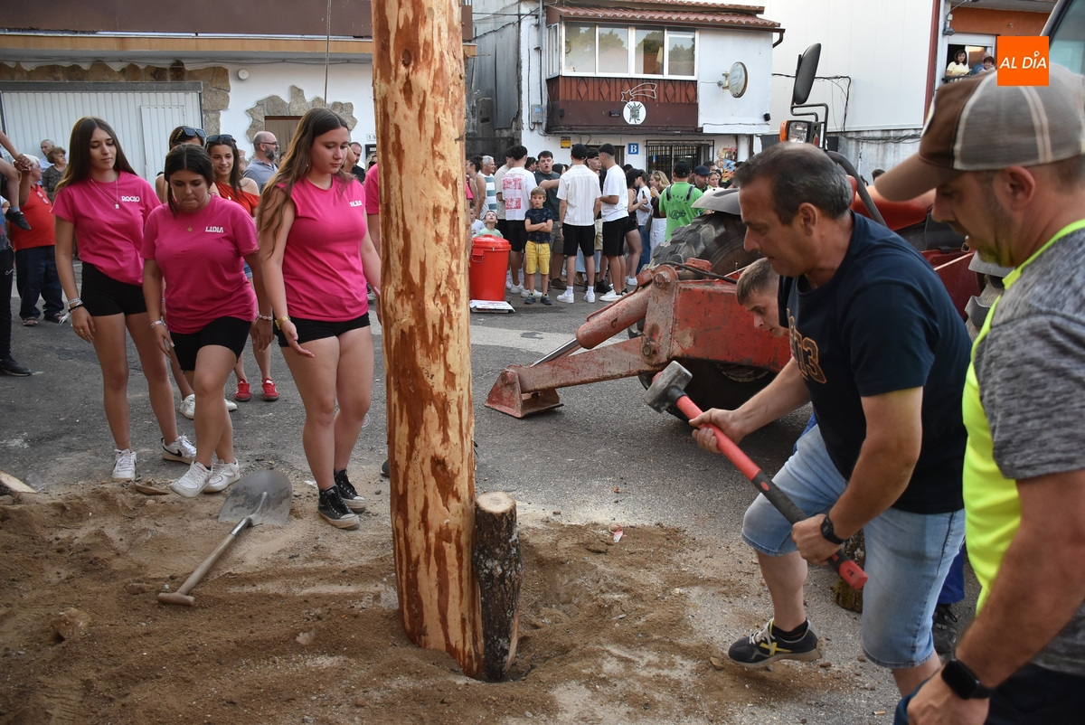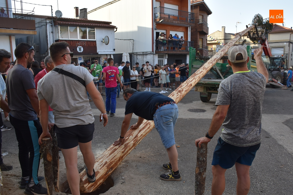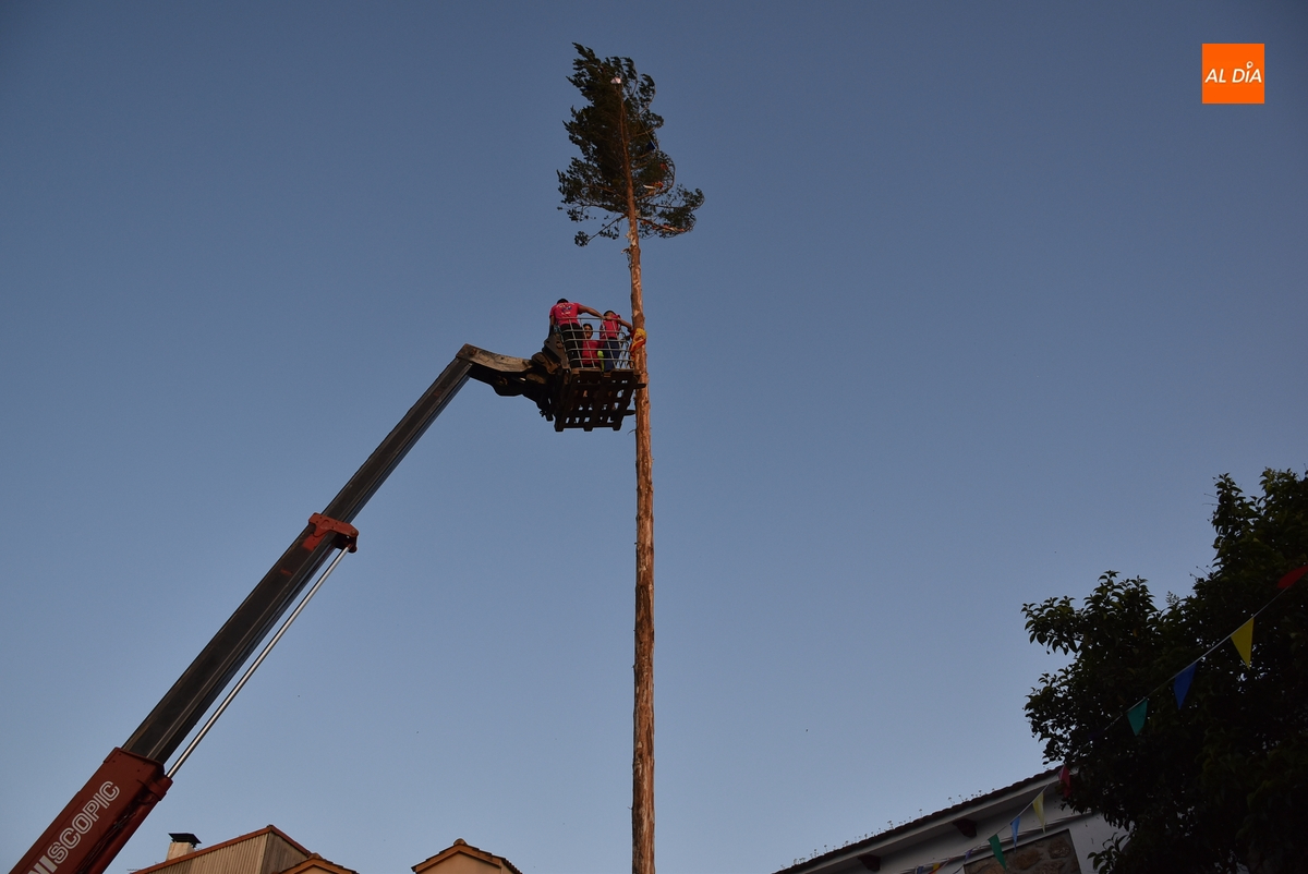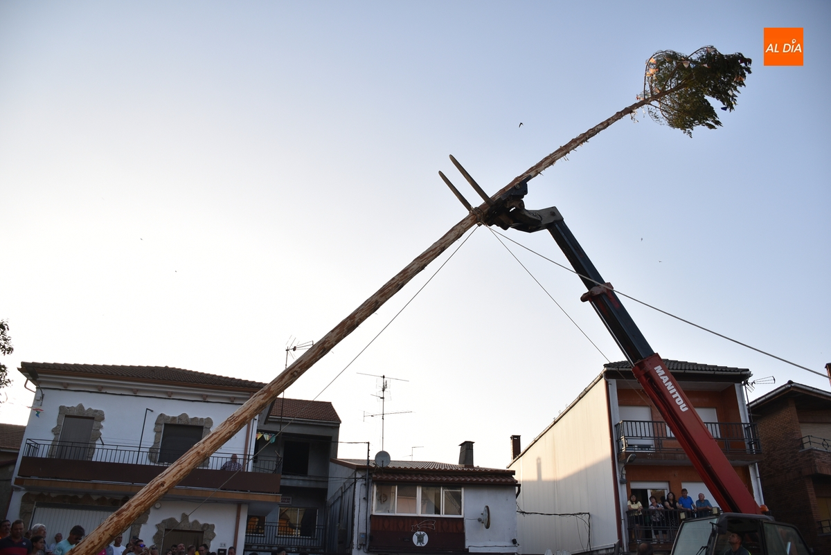 Una vez en la Plaza Mayor, comenzó la minuciosa tarea de izarla, para lo que se empleó el propio remolque en el que venía y otra máquina, así como unas cuerdas situadas en la mitad del tronco de las que fueron tirando varios vecinos en distintas direcciones para dejar la viga lo más recta posible. Mientras esa tarea estaba en marcha, todos los presentes pudieron dar buena cuenta de los dulces y la sangría que se fueron repartiendo de forma gratuita.