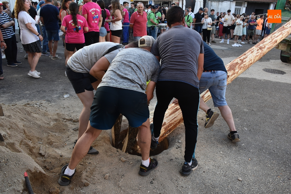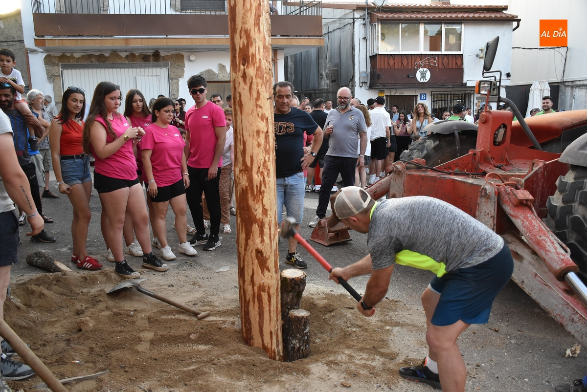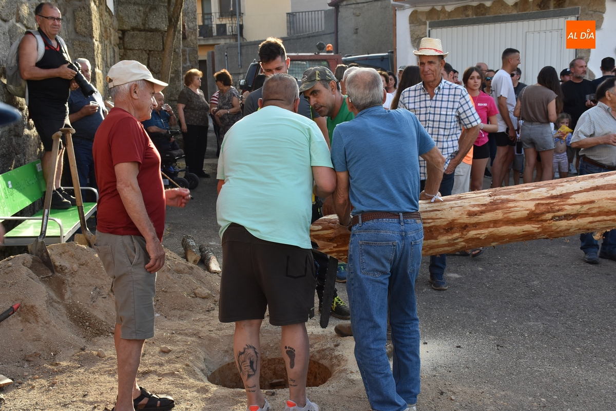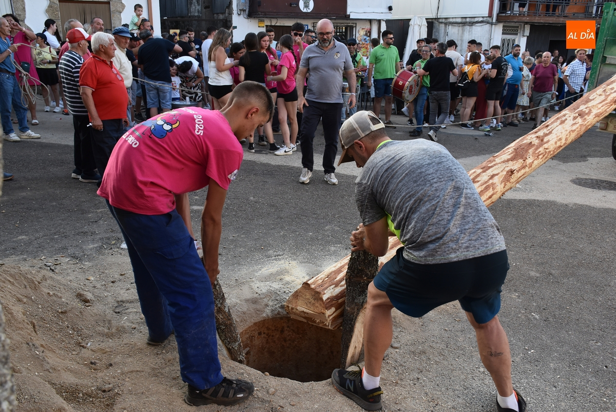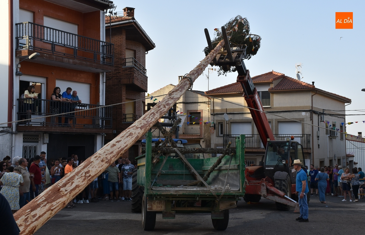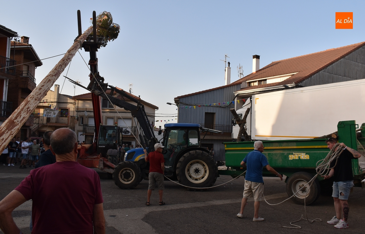 Una vez en la Plaza Mayor, comenzó la minuciosa tarea de izarla, para lo que se empleó el propio remolque en el que venía y otra máquina, así como unas cuerdas situadas en la mitad del tronco de las que fueron tirando varios vecinos en distintas direcciones para dejar la viga lo más recta posible. Mientras esa tarea estaba en marcha, todos los presentes pudieron dar buena cuenta de los dulces y la sangría que se fueron repartiendo de forma gratuita.