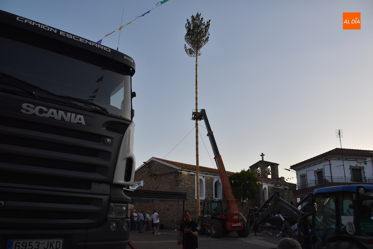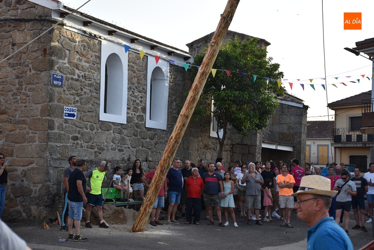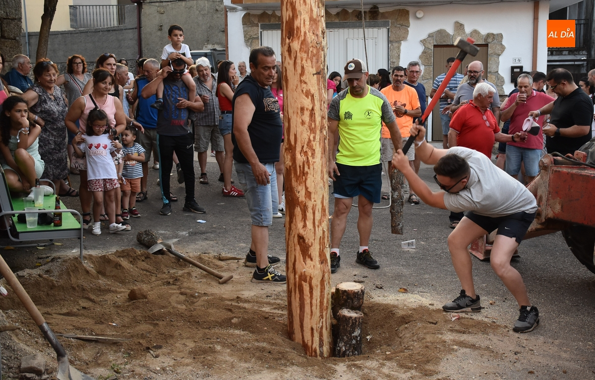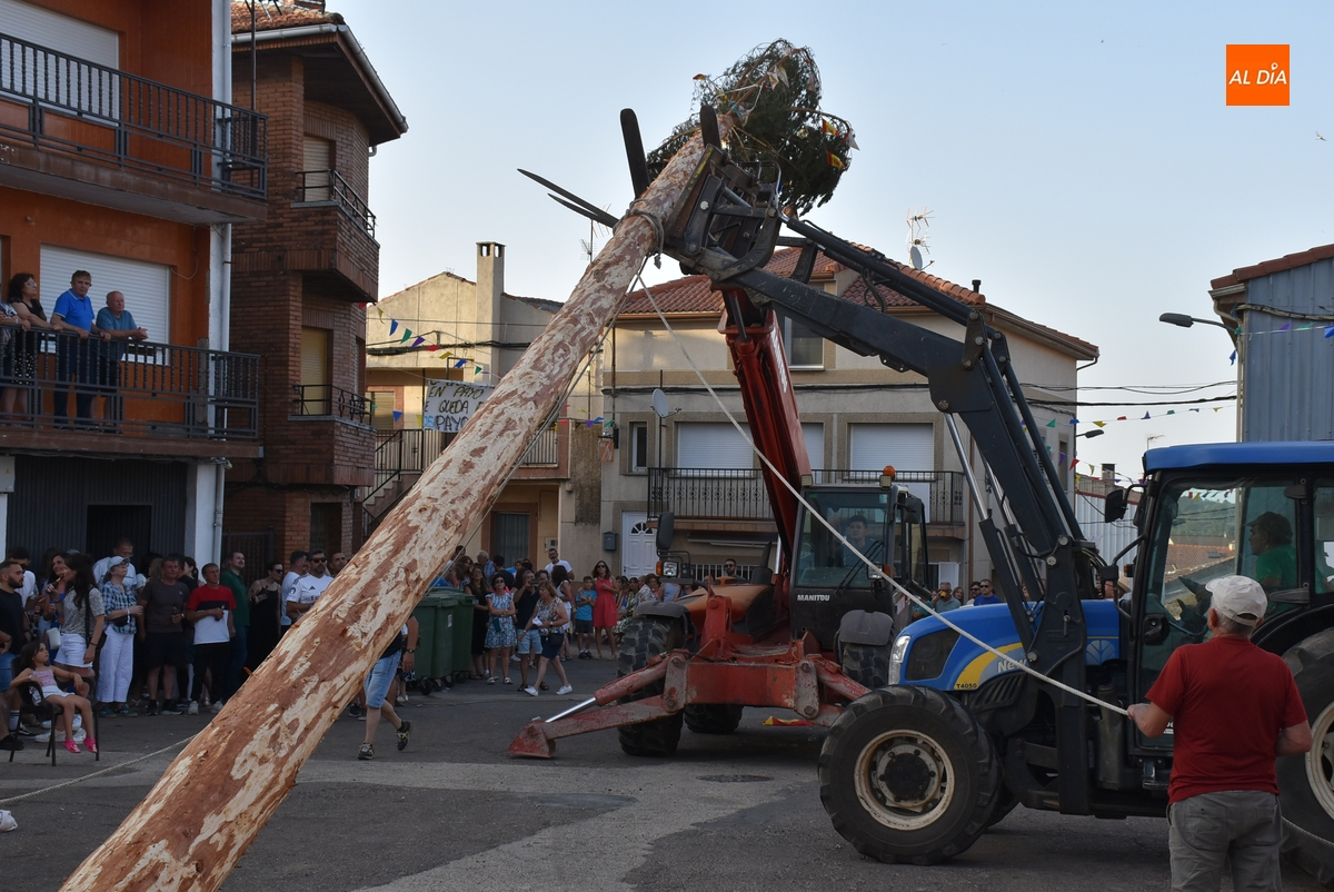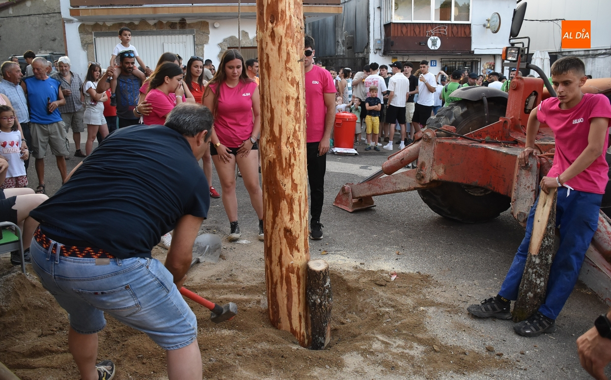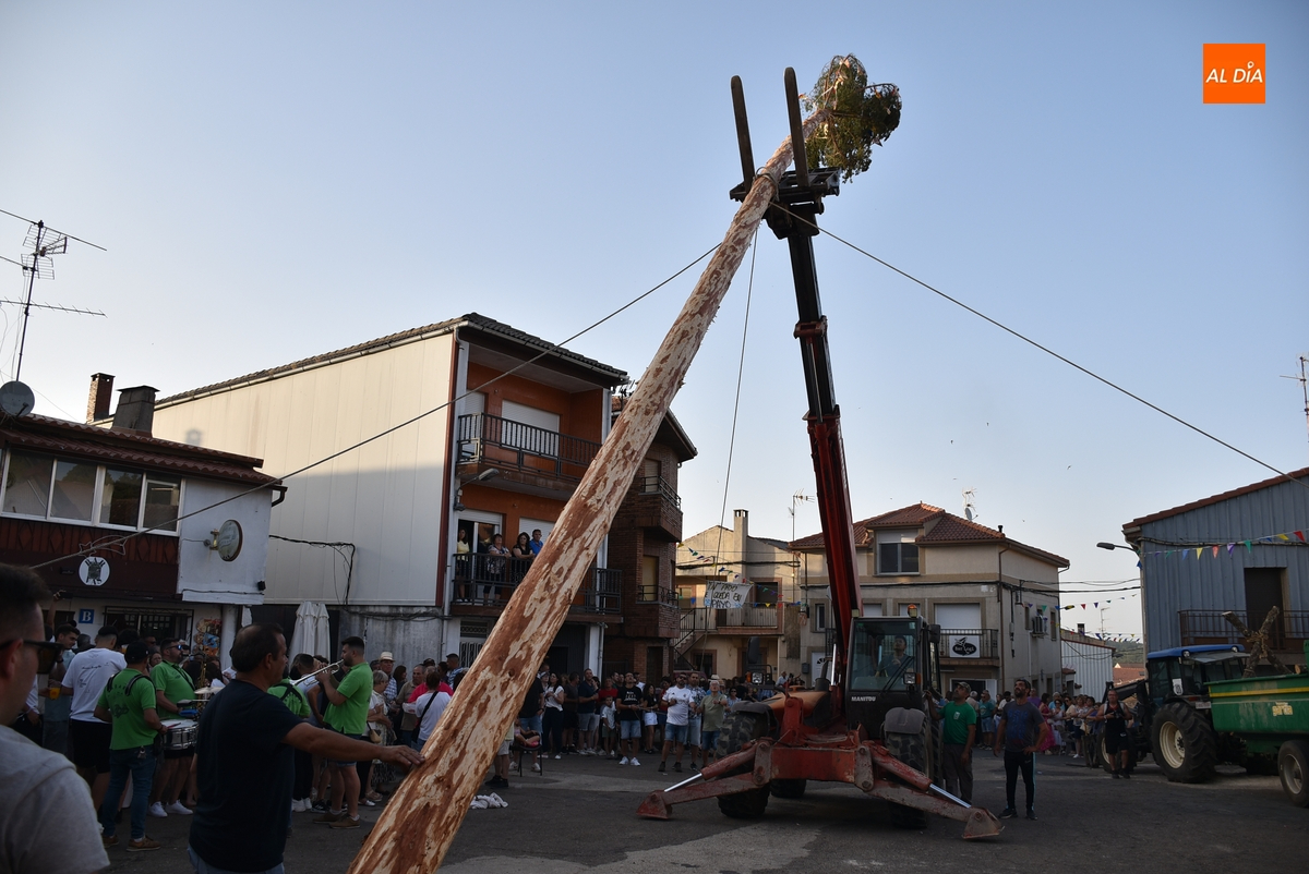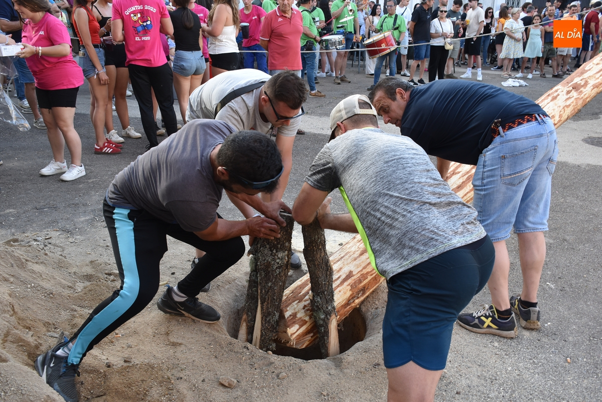 Una vez en la Plaza Mayor, comenzó la minuciosa tarea de izarla, para lo que se empleó el propio remolque en el que venía y otra máquina, así como unas cuerdas situadas en la mitad del tronco de las que fueron tirando varios vecinos en distintas direcciones para dejar la viga lo más recta posible. Mientras esa tarea estaba en marcha, todos los presentes pudieron dar buena cuenta de los dulces y la sangría que se fueron repartiendo de forma gratuita.