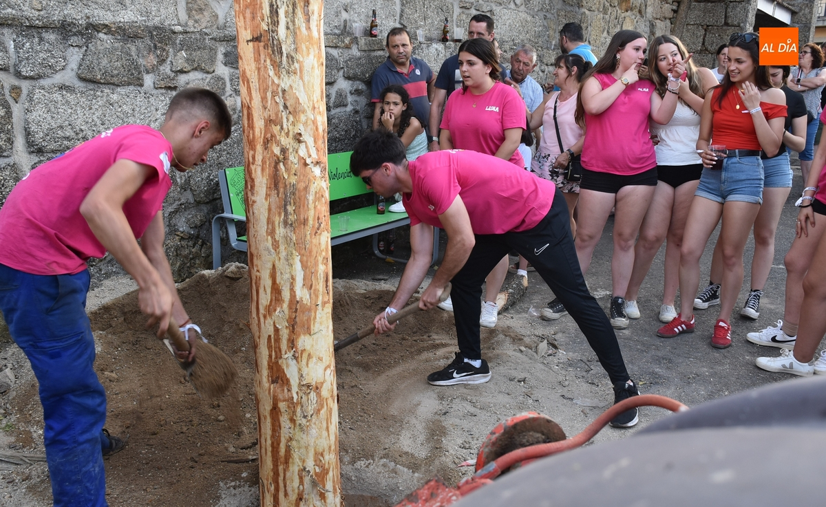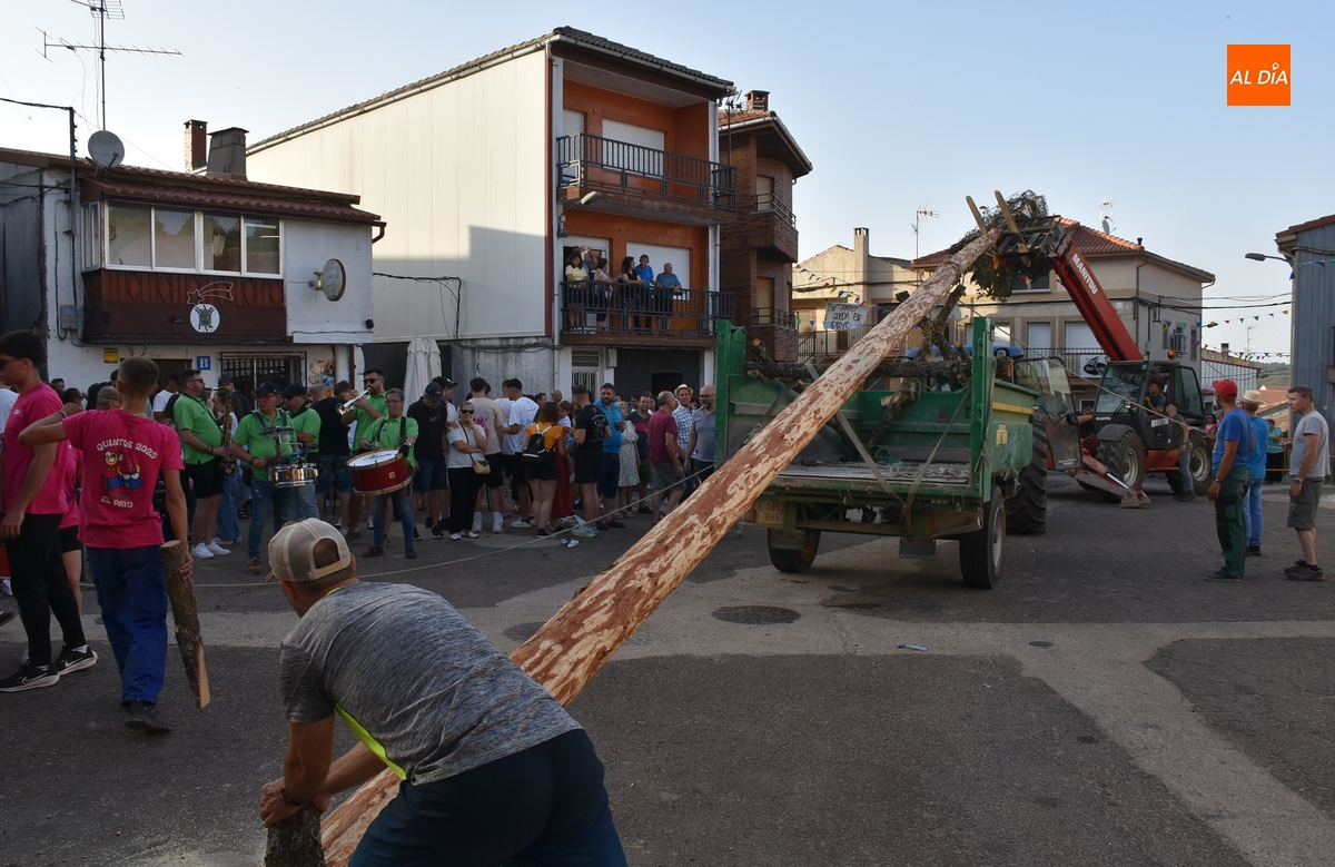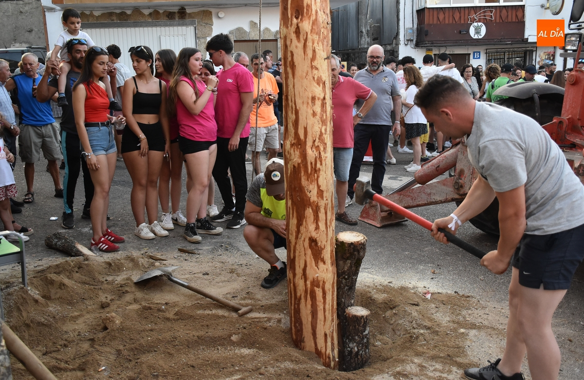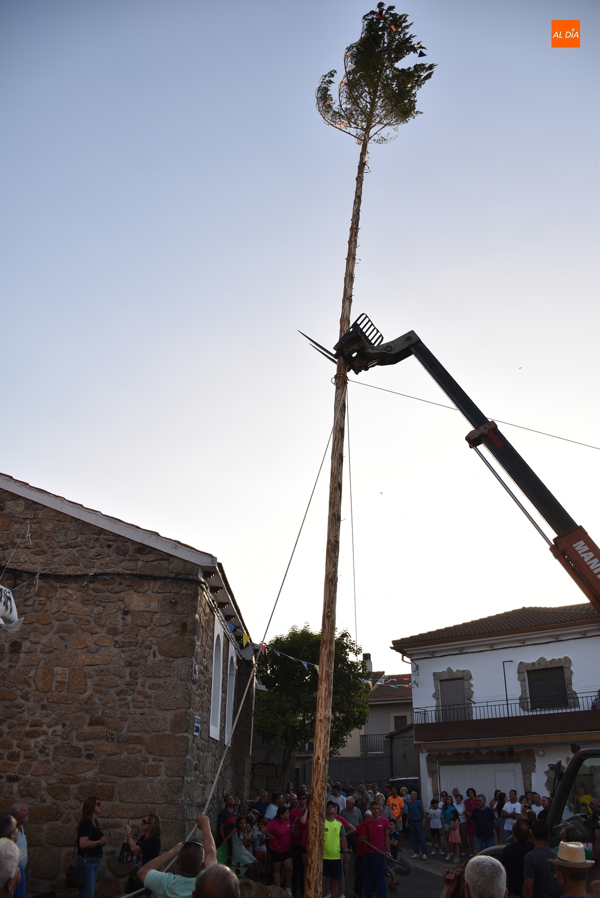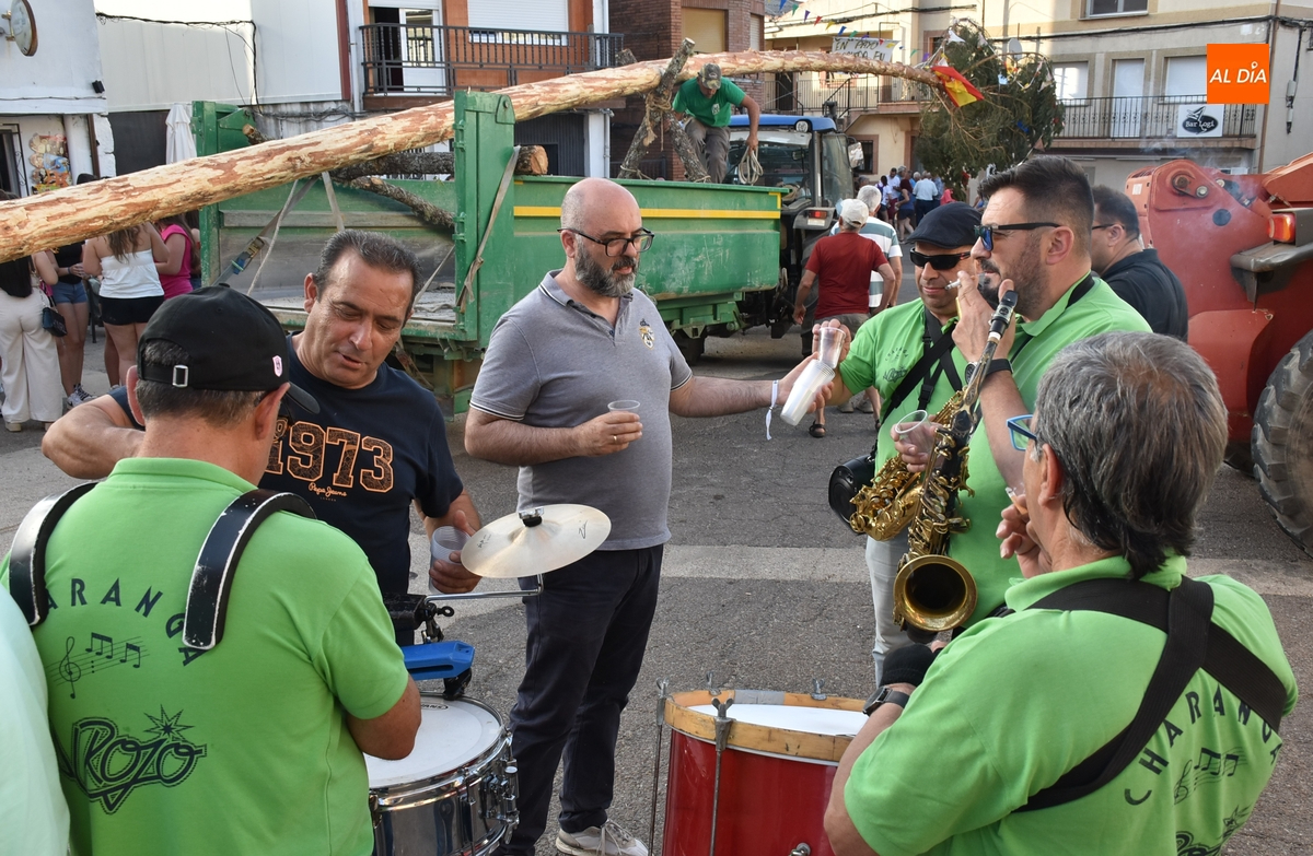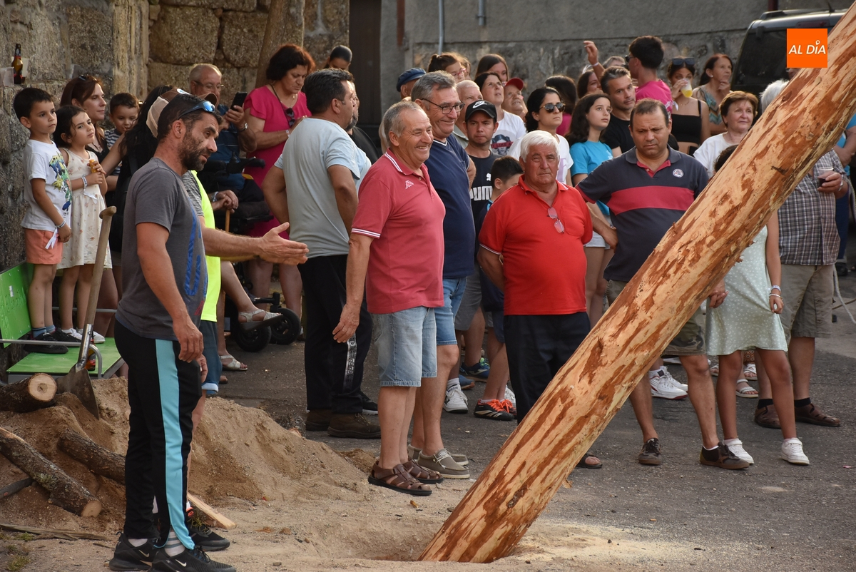 Una vez en la Plaza Mayor, comenzó la minuciosa tarea de izarla, para lo que se empleó el propio remolque en el que venía y otra máquina, así como unas cuerdas situadas en la mitad del tronco de las que fueron tirando varios vecinos en distintas direcciones para dejar la viga lo más recta posible. Mientras esa tarea estaba en marcha, todos los presentes pudieron dar buena cuenta de los dulces y la sangría que se fueron repartiendo de forma gratuita.