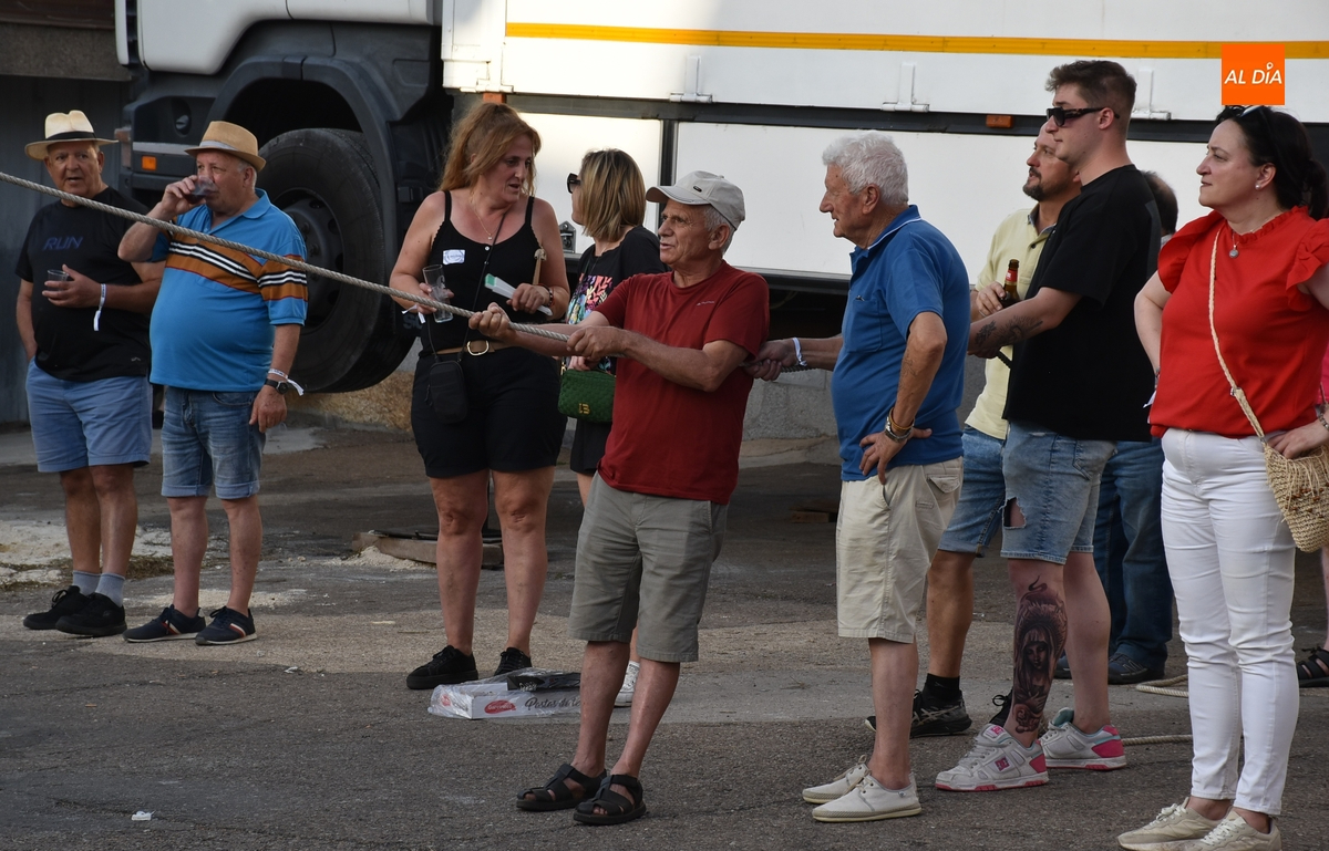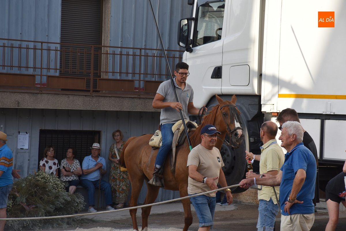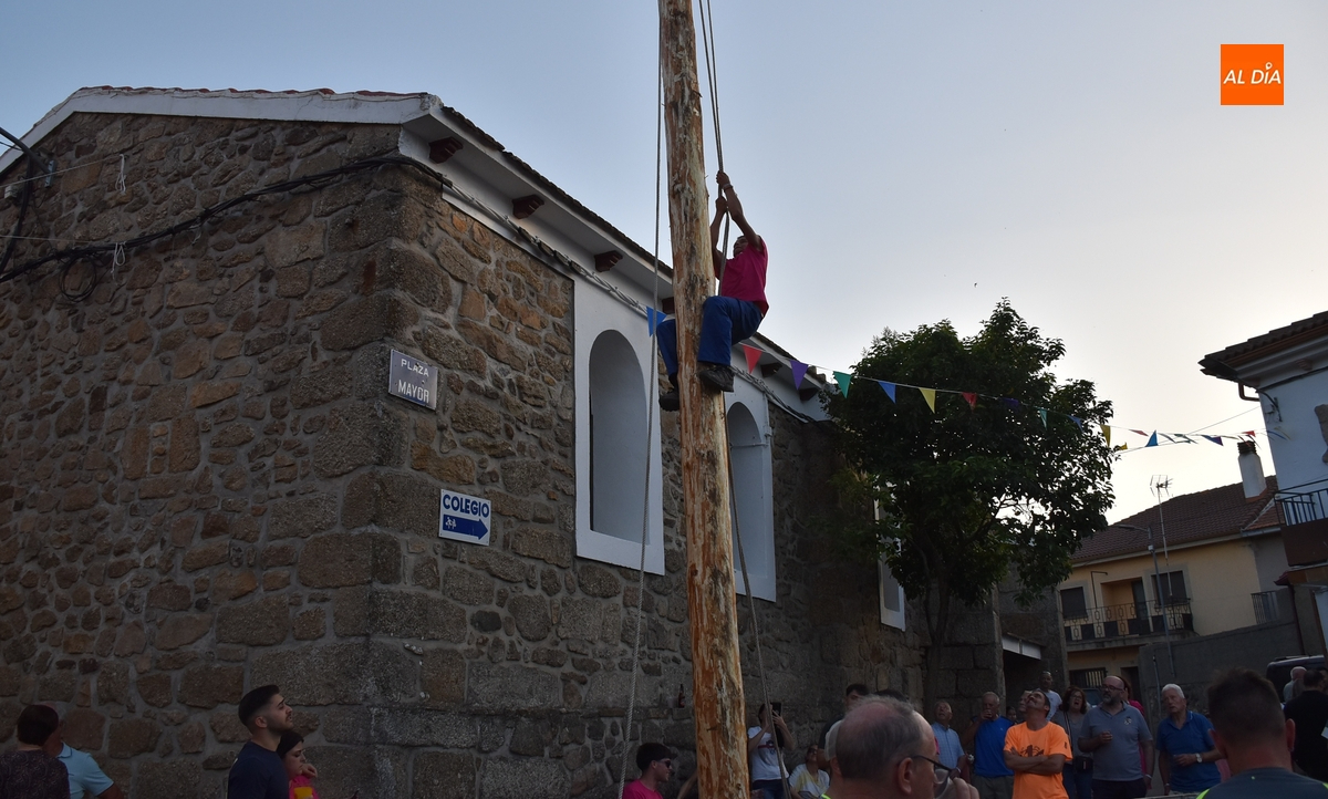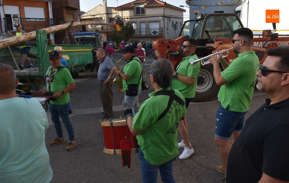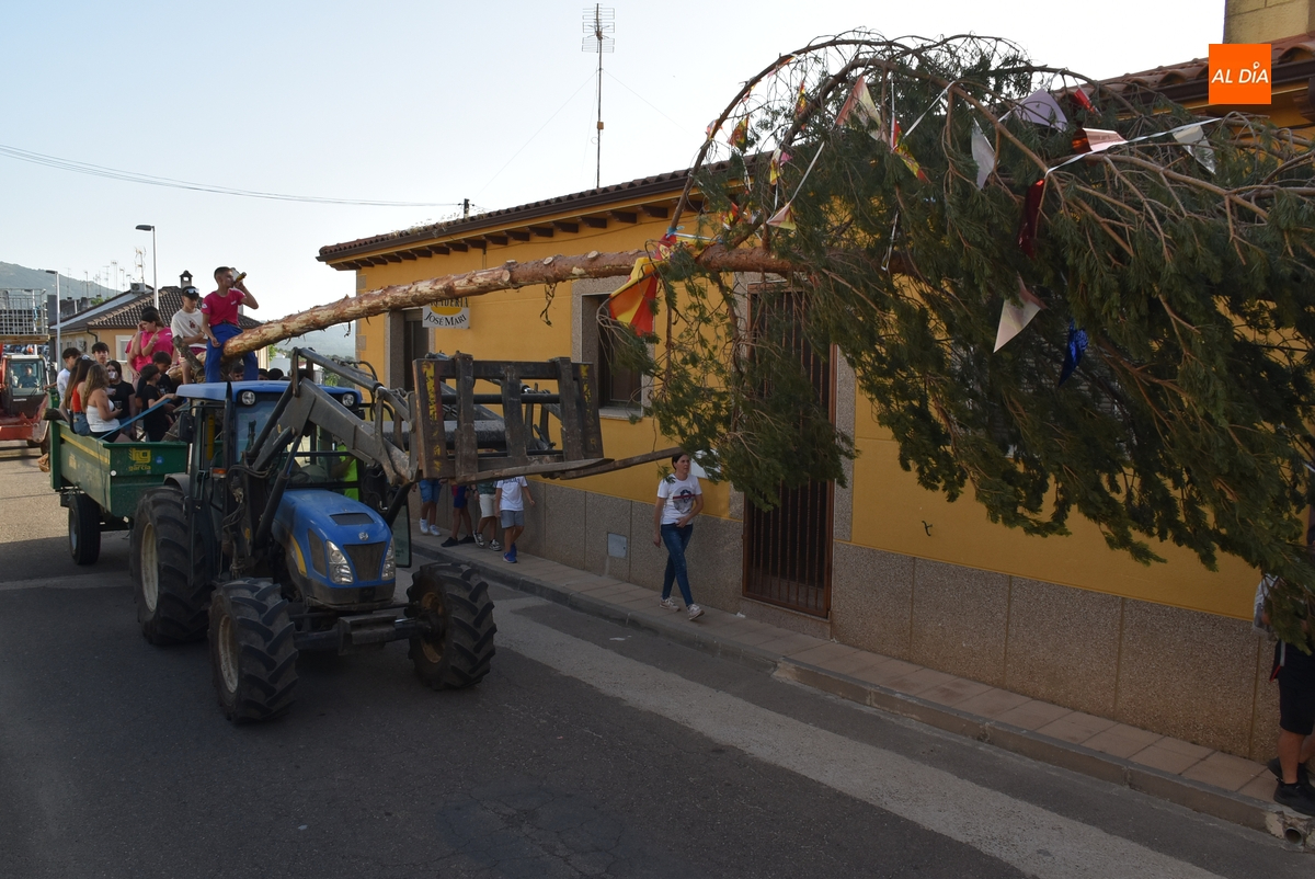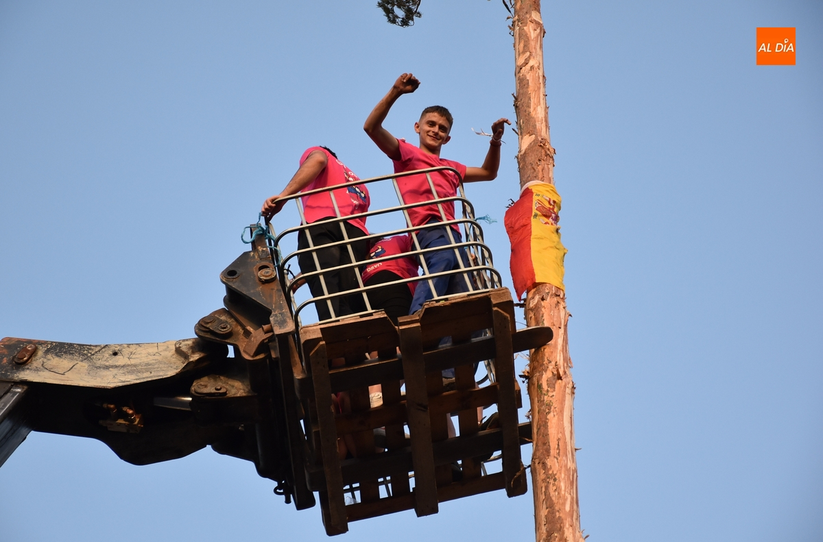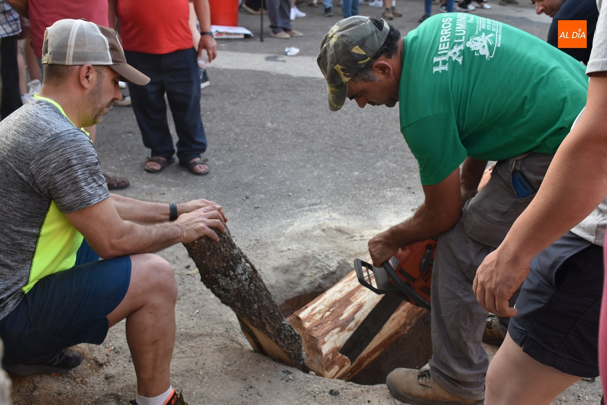 Una vez en la Plaza Mayor, comenzó la minuciosa tarea de izarla, para lo que se empleó el propio remolque en el que venía y otra máquina, así como unas cuerdas situadas en la mitad del tronco de las que fueron tirando varios vecinos en distintas direcciones para dejar la viga lo más recta posible. Mientras esa tarea estaba en marcha, todos los presentes pudieron dar buena cuenta de los dulces y la sangría que se fueron repartiendo de forma gratuita.