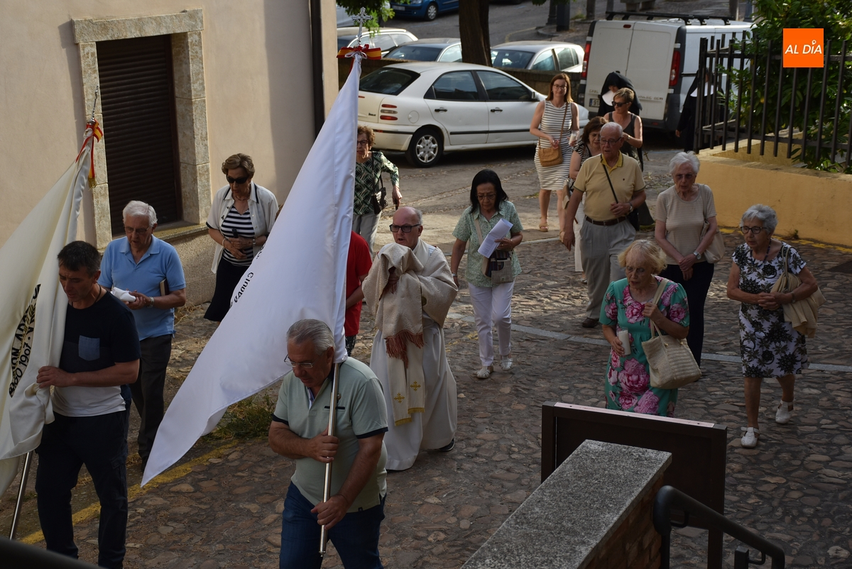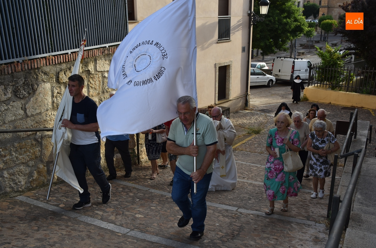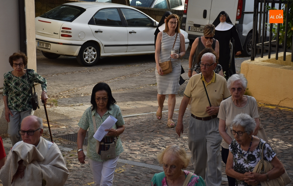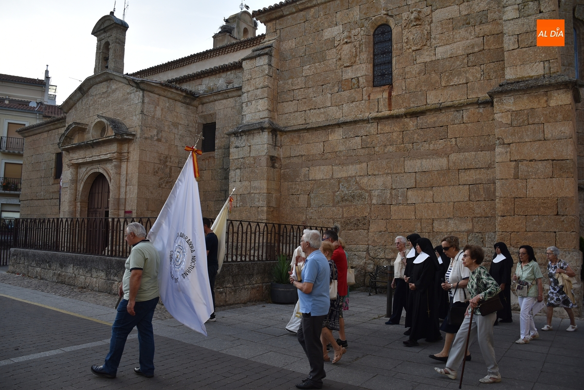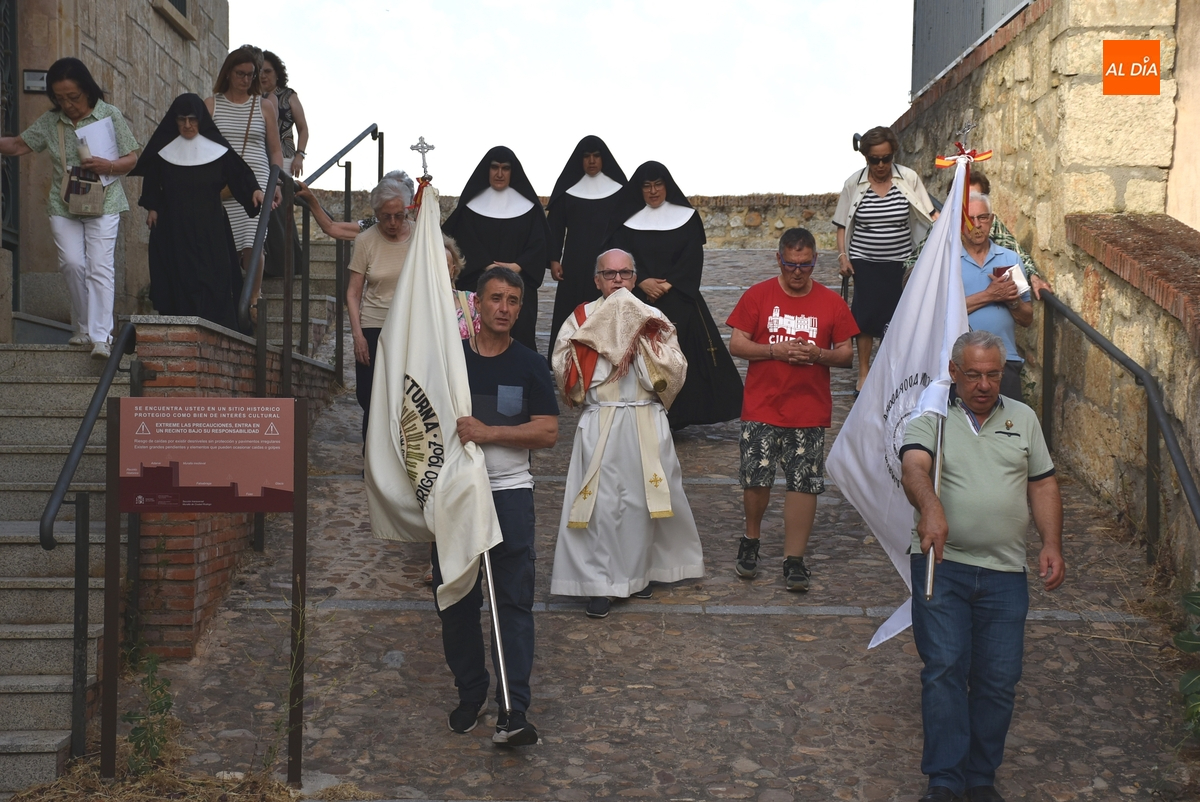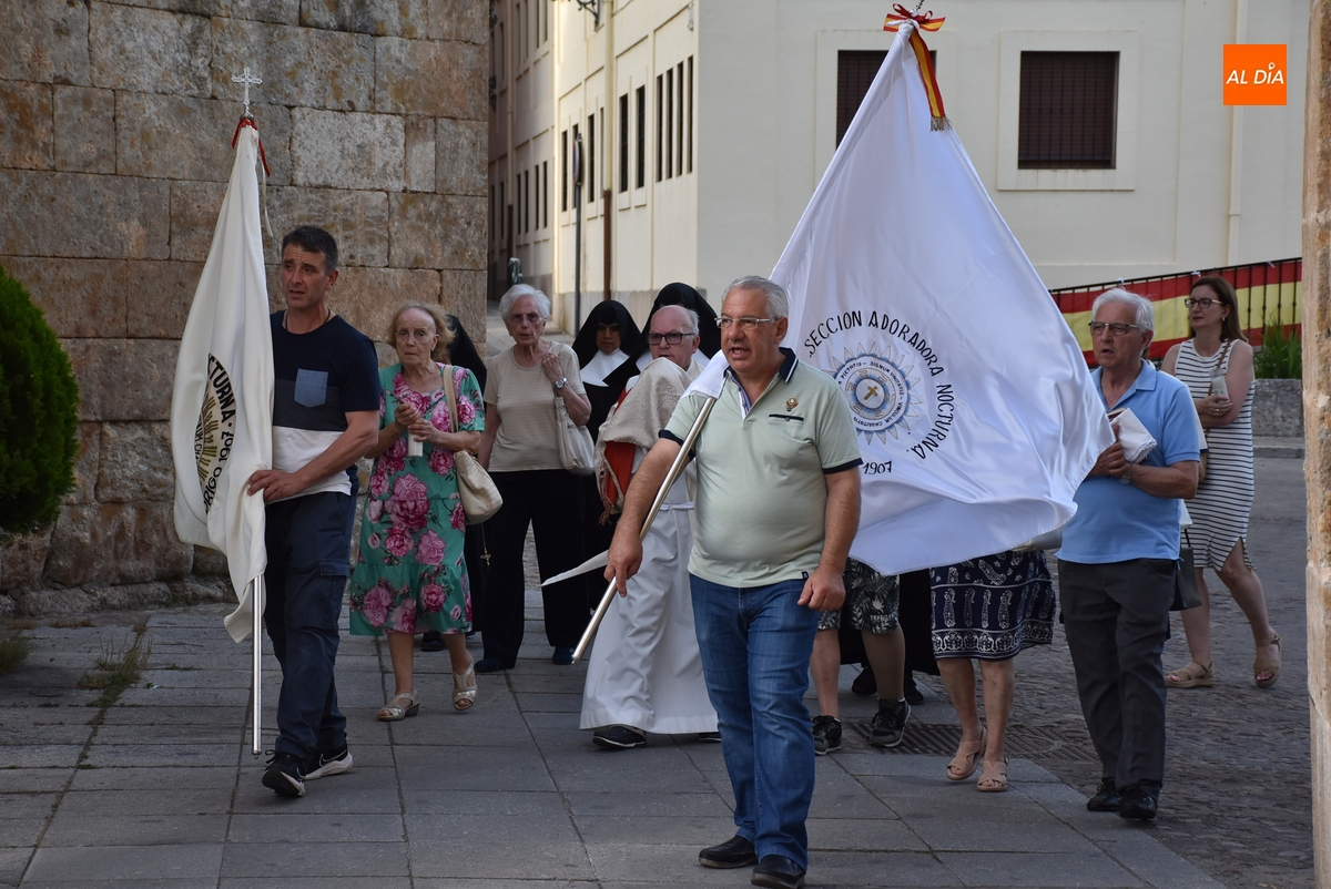 Como es habitual, el grupo salió de la Iglesia de San Pedro-San Isidoro encabezado por dos banderas de la Adoración Nocturna, portando Fernando Dias-Bailón al Santísimo. Tras pasar por el Campo del Pozo, el grupo cogió la gran rampa de subida al adarve de la muralla que hay junto al Centro de Día de Personas Mayores, sumándose en esos momentos varias Hermanitas de los Ancianos Desamparados responsables de la Residencia de San José.