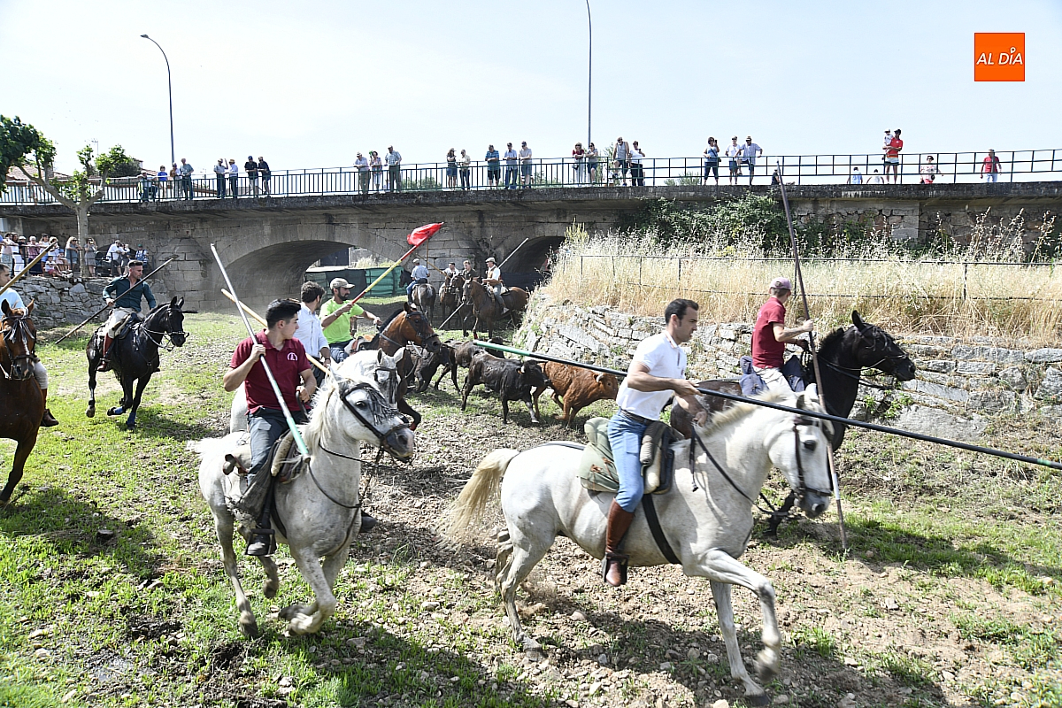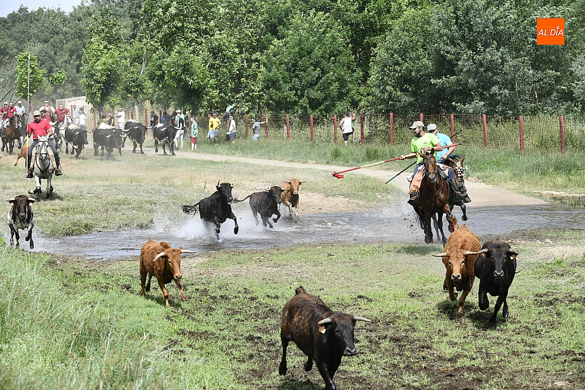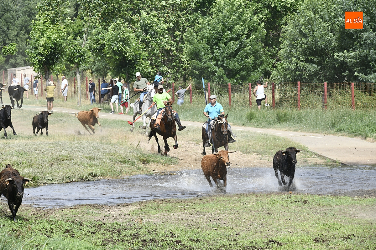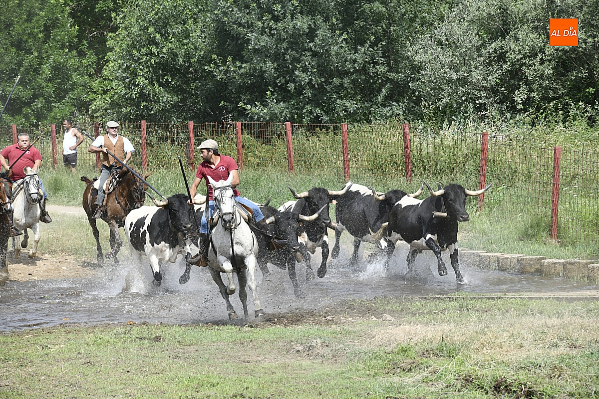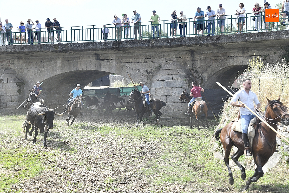 La singularidad del encierro —ambientado en un entorno natural y con un componente escénico notable— residió en el uso del propio cauce fluvial como recorrido. Aunque el río presentaba escaso caudal, tan solo visible en sus tramos más hondos, ello no restó espectacularidad al evento. Muy al contrario, la estampa de las reses cruzando entre salpicaduras de agua y el galope de los caballos proporcionó un atractivo visual que fue muy celebrado por el público.