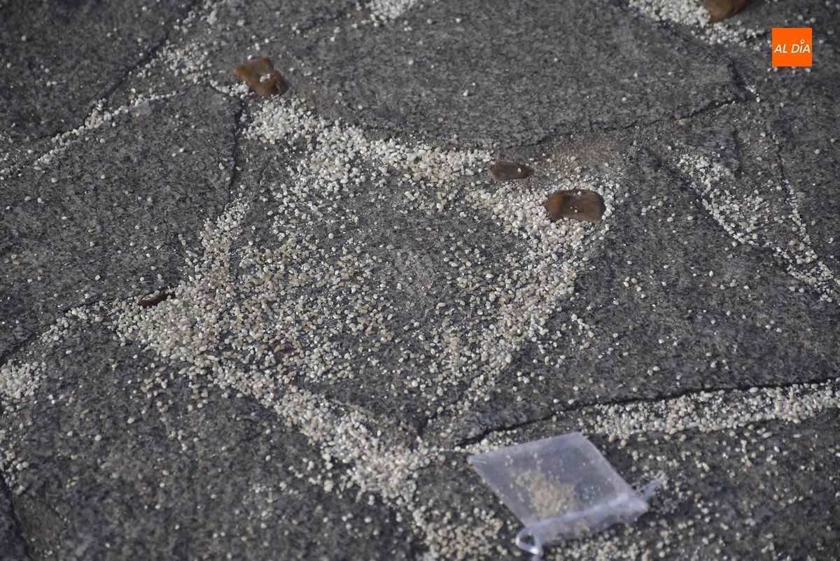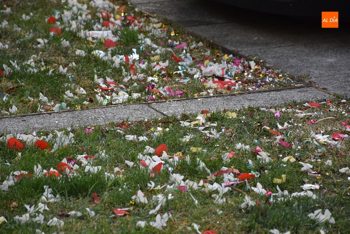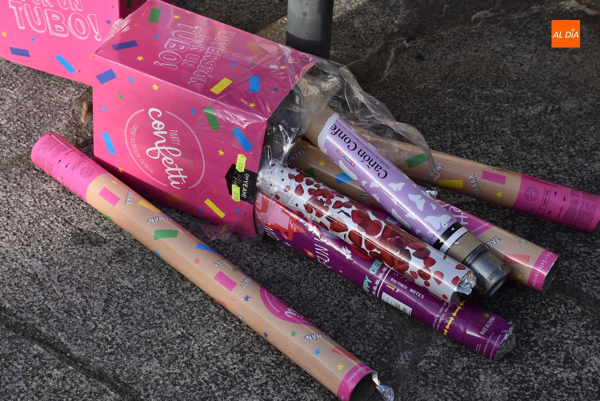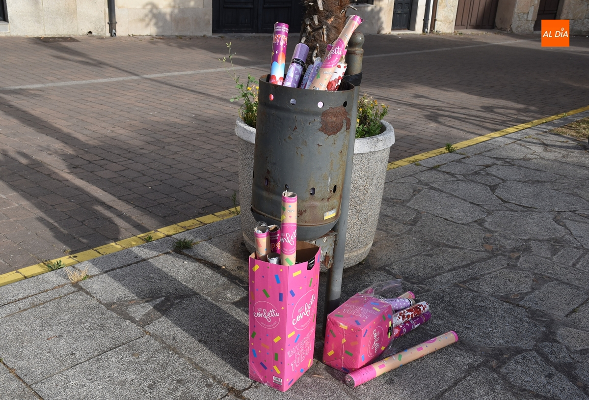 Por otro lado, por la Plazuela se podían ver los restos de la fiesta posterior a una boda que se ofició a lo largo de la jornada en la Iglesia de San Pedro-San Isidoro. Como se puede ver en las imágenes, se habían empleado unos cuantos tubos de confeti, que habían sido depositados en una papelera (o estaban a sus pies), pero el confeti en sí había pasado a decorar por ejemplo la zona de césped del espacio. Por supuesto, por el suelo de la Plazuela también se encontraba el arroz lanzado a los novios.