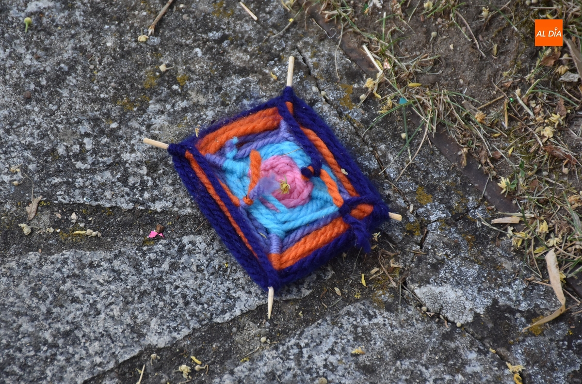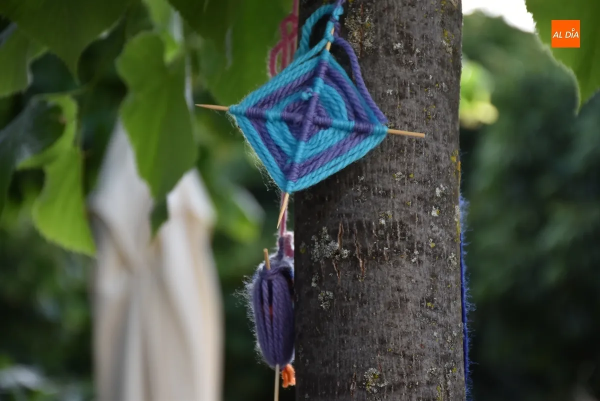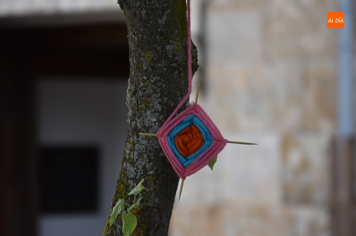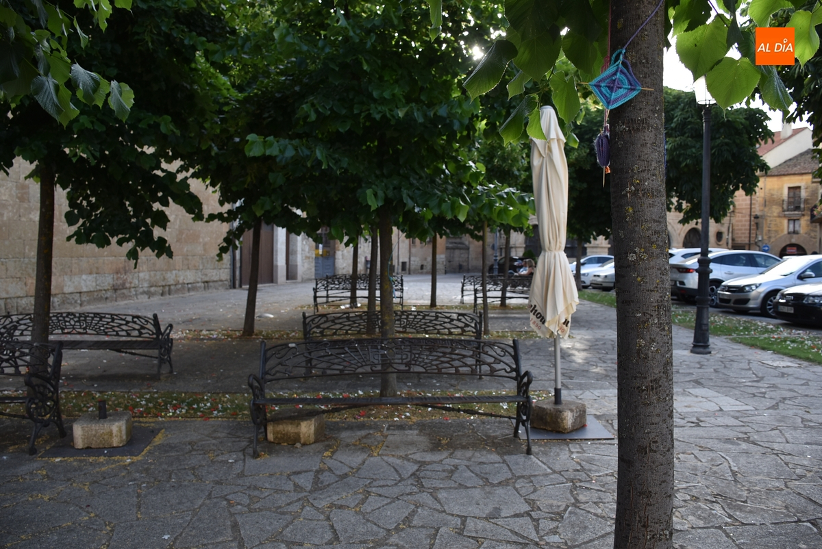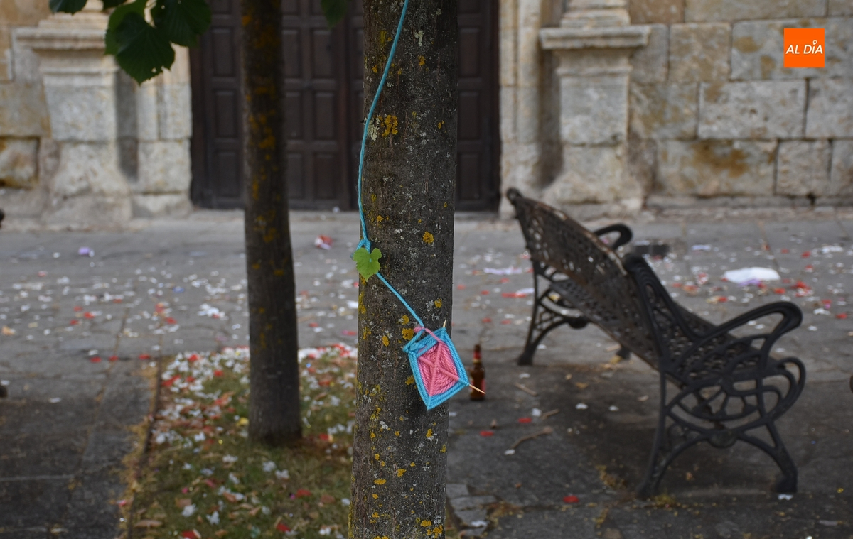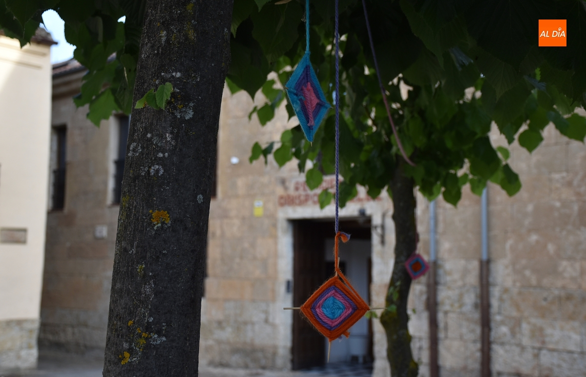 La céntrica Plazuela Cristóbal de Castillejo de Ciudad Rodrigo contaba al menos en la tarde del sábado con un doble colorido adicional. Por un lado, de varios de sus árboles seguían colgando –había otros caídos al suelo- los mandalas elaborados en la I Feria de la Diversión sin Edad que tuvo lugar en la mañana del miércoles, en la que tomaron parte alumnos del Colegio Misioneras de la Providencia-Santa Teresa y residentes de Obispo Téllez, San José y el Hospital de la Pasión.