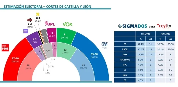 Encuesta CyLTV Junio 2025 => PP 36’7% voto / 35-38 escaños