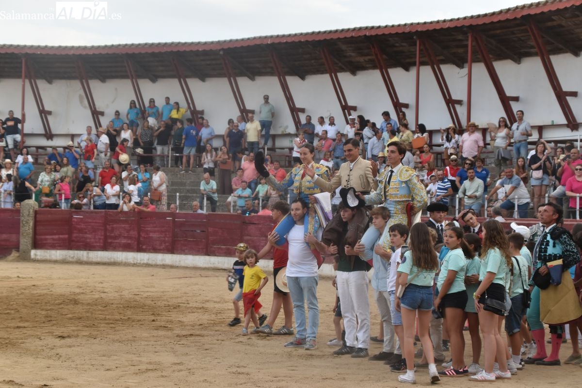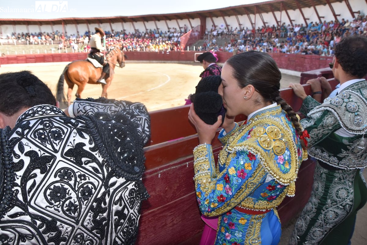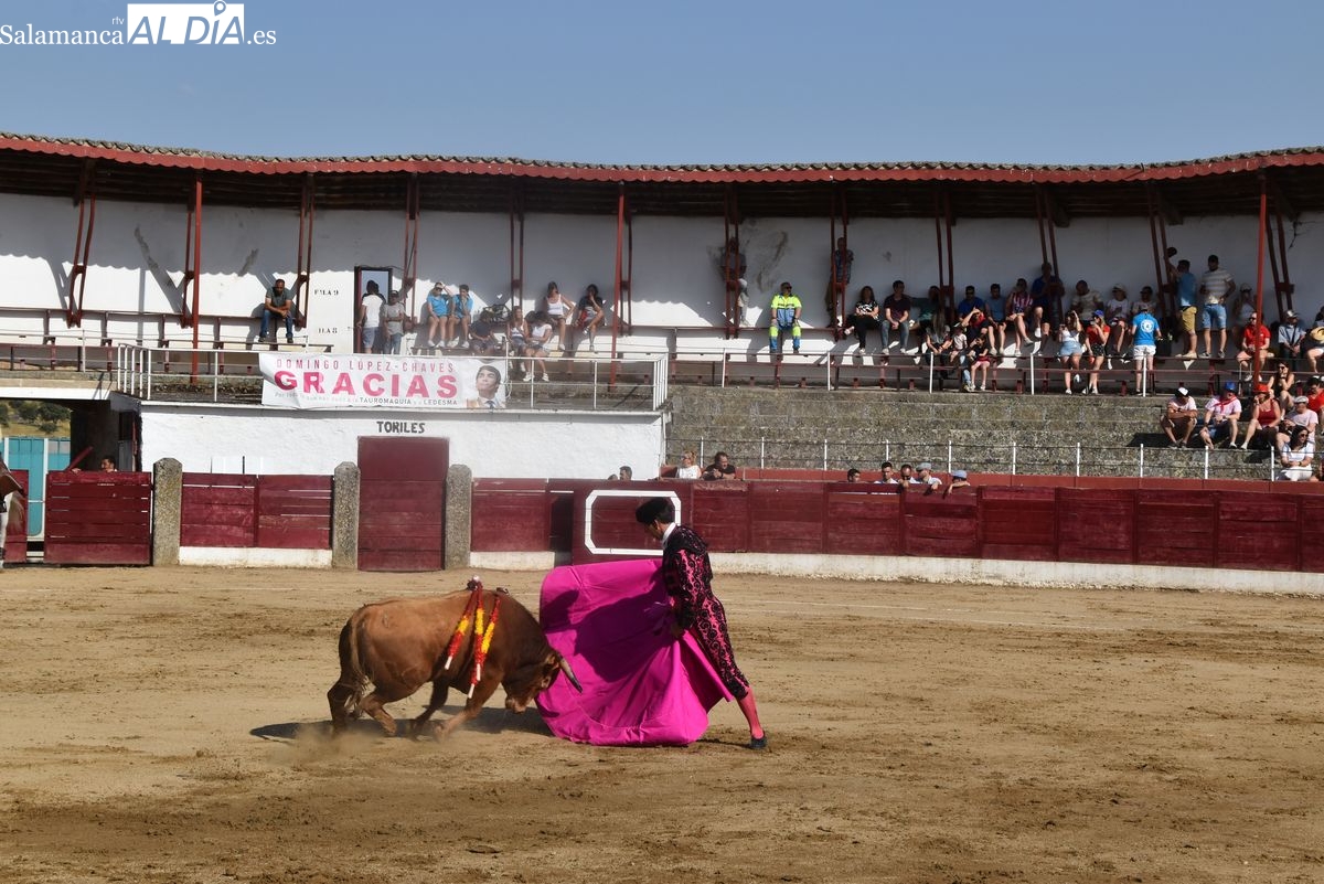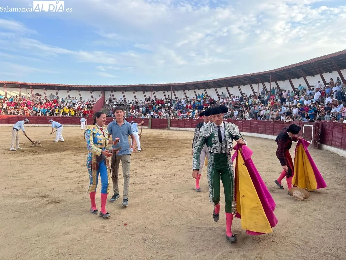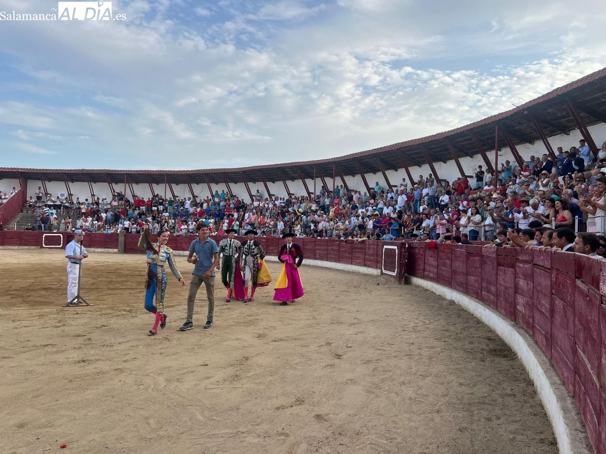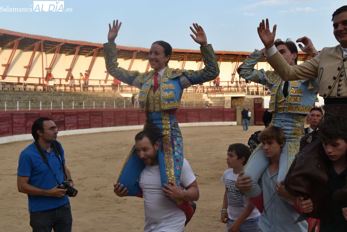 Triunfo rotundo de Raquel Martín en Ledesma, donde indultó un extraordinario novillo de Lorenzo Rodríguez Espioja de nombre 'Lolito'. La salmantina compartió salida en hombros con el rejoneador Sergio Pérez de Gregorio y el novillero Julio Norte, que cortaron dos orejas cada uno.