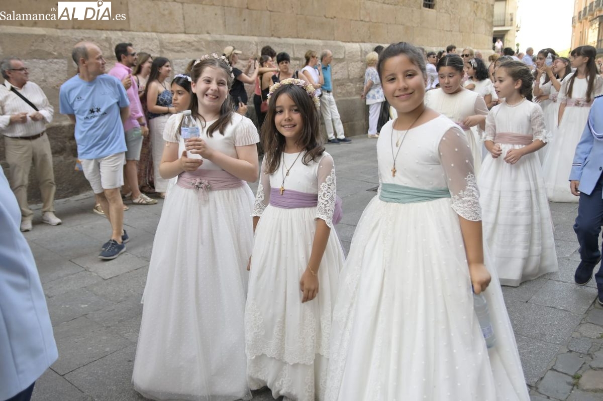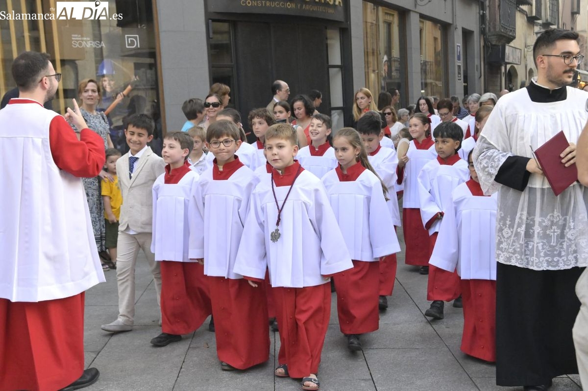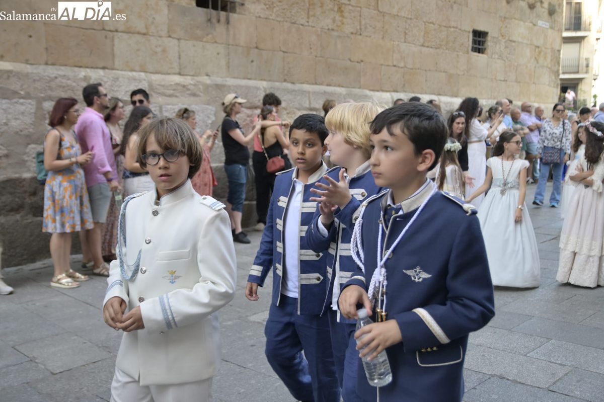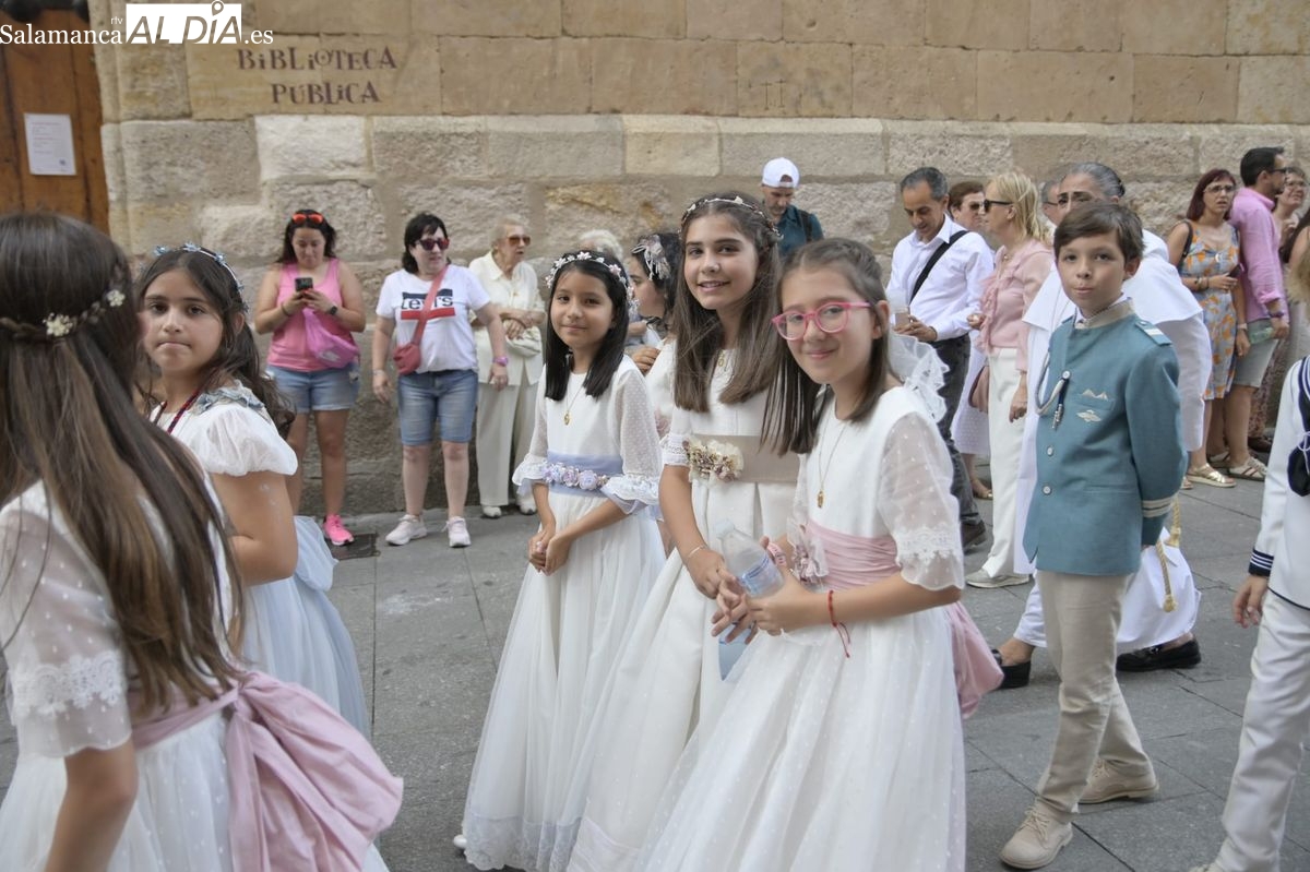 Tras la conclusión de la misa, ha tenido lugar uno de los momentos más esperados y vistosos: la tradicional procesión eucarística. El Santísimo Sacramento ha recorrido las calles del casco histórico de Salamanca, en un itinerario que ha contado con la participación destacada de los niños que han celebrado su Primera Comunión durante este año.