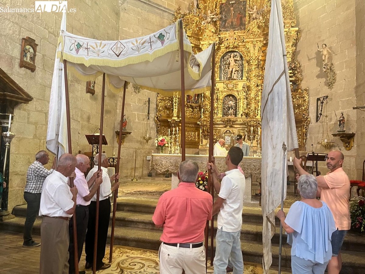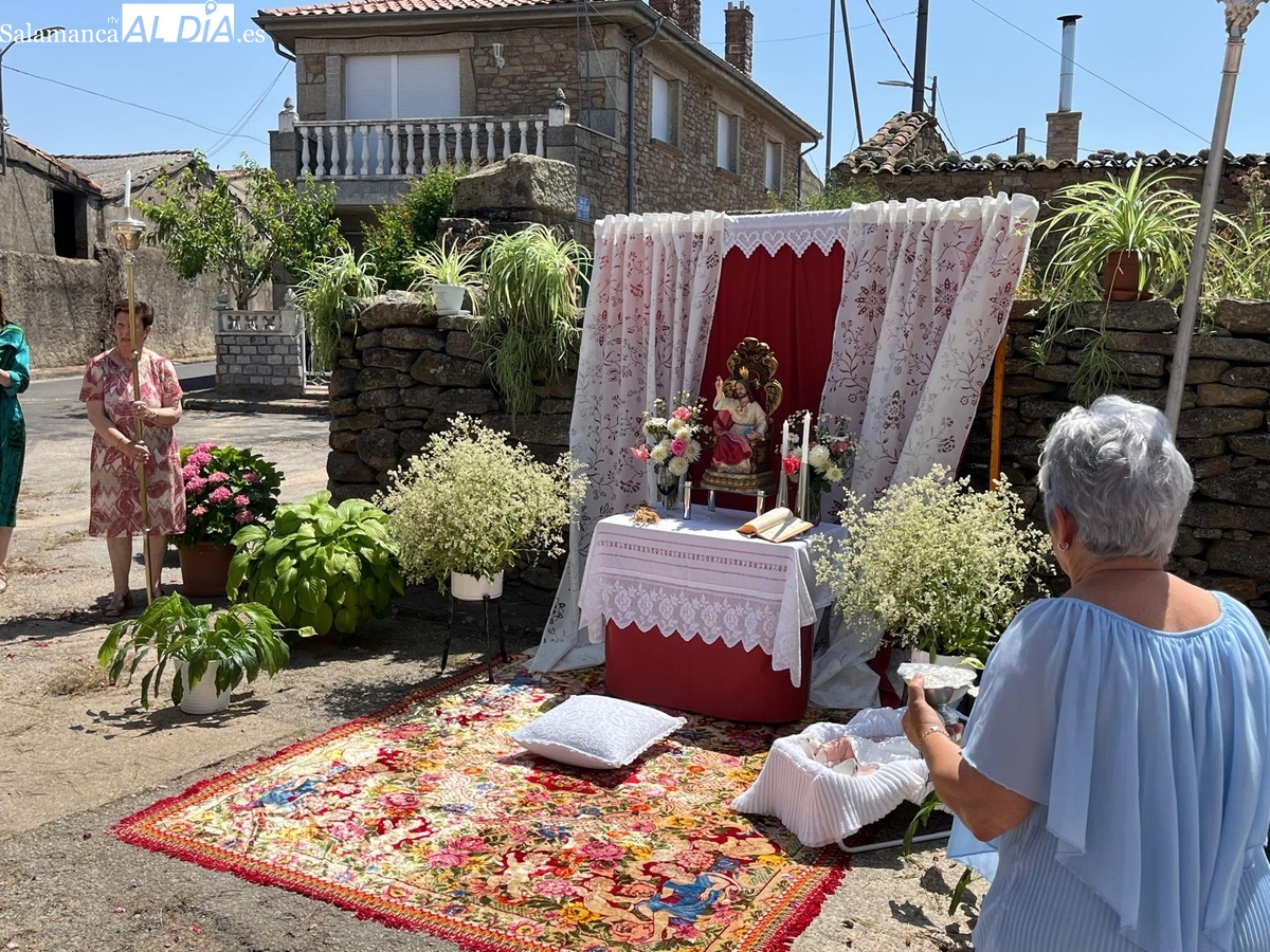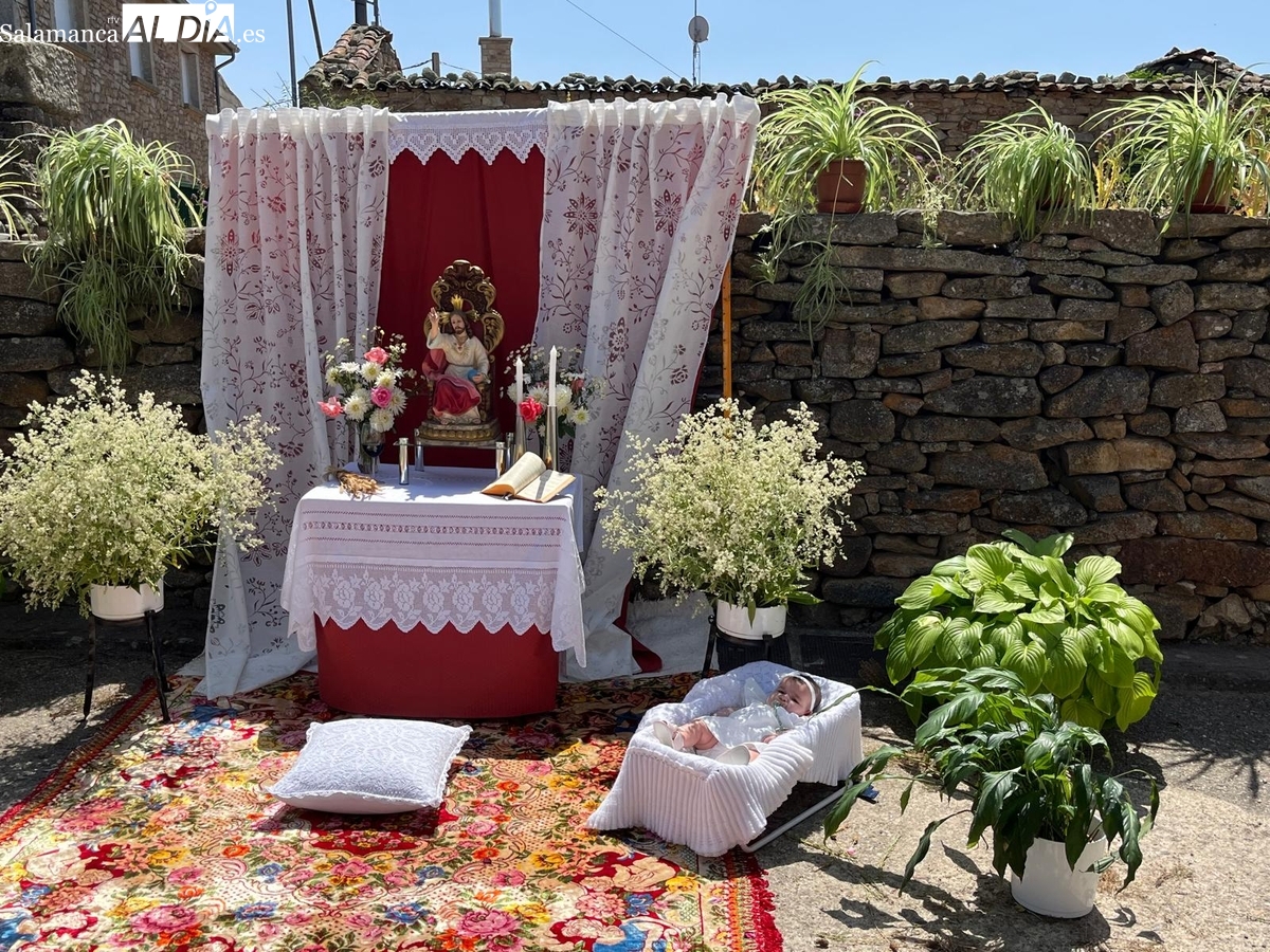 Un aspecto destacado de la procesión en Yecla de Yeltes fue la instalación de hasta dos altares a lo largo del itinerario. En cada uno de estos puntos de especial recogimiento, se vivió un momento de gran emotividad con la bendición de un niño, una tradición que se mantiene viva y que simboliza la presentación de los más pequeños ante el Santísimo.