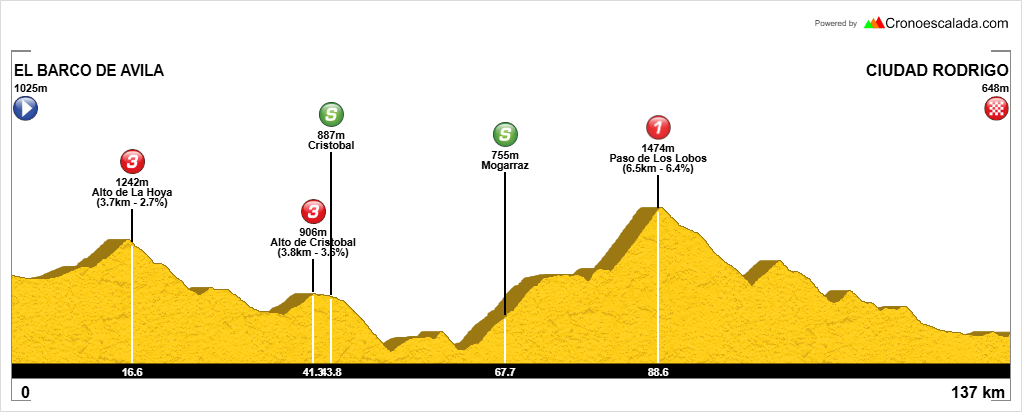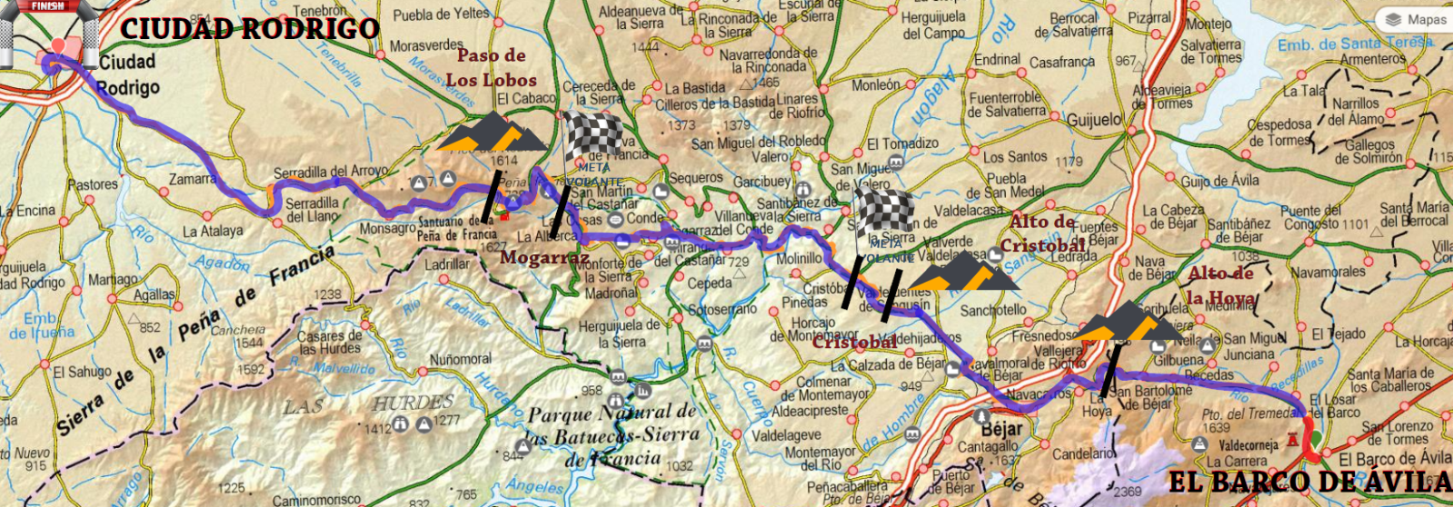 En el recorrido, el pelotón afrontará tres altos puntuables: en el kilómetro 16, el Alto de la Hoya, de 3ª categoría; en el kilómetro 41,3 (tras pasar por Béjar), el Alto de Cristóbal, también de 3ª categoría; y en el kilómetro 88,6, el Paso de Los Lobos, de 1ª categoría. Entre medias de estos dos últimos puertos habrá dos sprints intermedios, en Cristóbal (en el kilómetro 43,8) y en Mogarraz (en el 67,7).