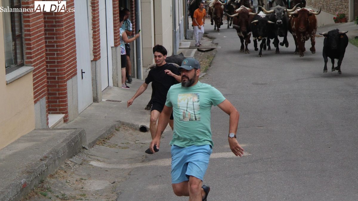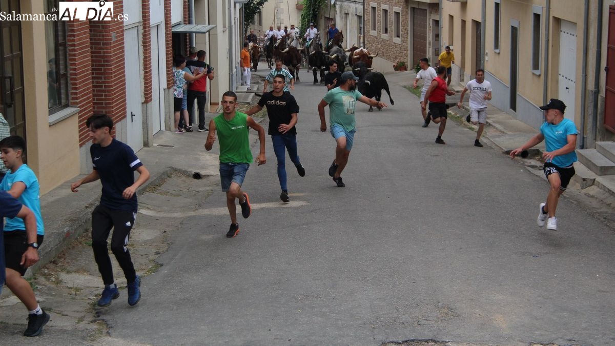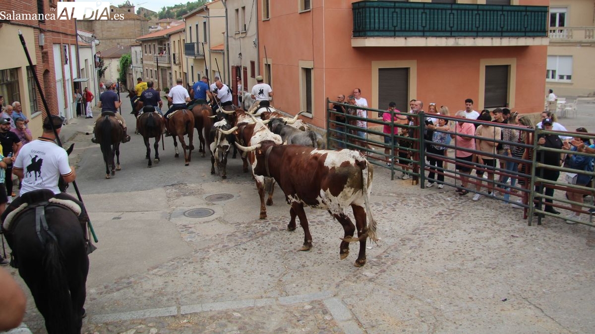 Hinojosa de Duero ha celebrado esta mañana el primer espectacúlo taurino de las Fiestas de San Juan Bautista, un vistoso encierro a caballo. Los tres erales de la ganadería de Miranda de Pericalvo y seis cabestros, conducidos por una decena de caballistas, hicieron un bonito y rápido recorrido desde la finca de los Charcos hasta el coso taurino instalado en la plaza Juego de Pelota. El encierro discurrió sin incidentes gracias al buen trabajo de los caballistas, en su mayoría hinojoseros, aunque no faltó la emoción cuando, en el úlltimo tramo del recorrido, uno de los novillos despuntaba de la manada para poner en apuros a algunos corredores. Una vez recogidos los erales en los chiqueros del coso, se procedió al desenjaule de los mansos.