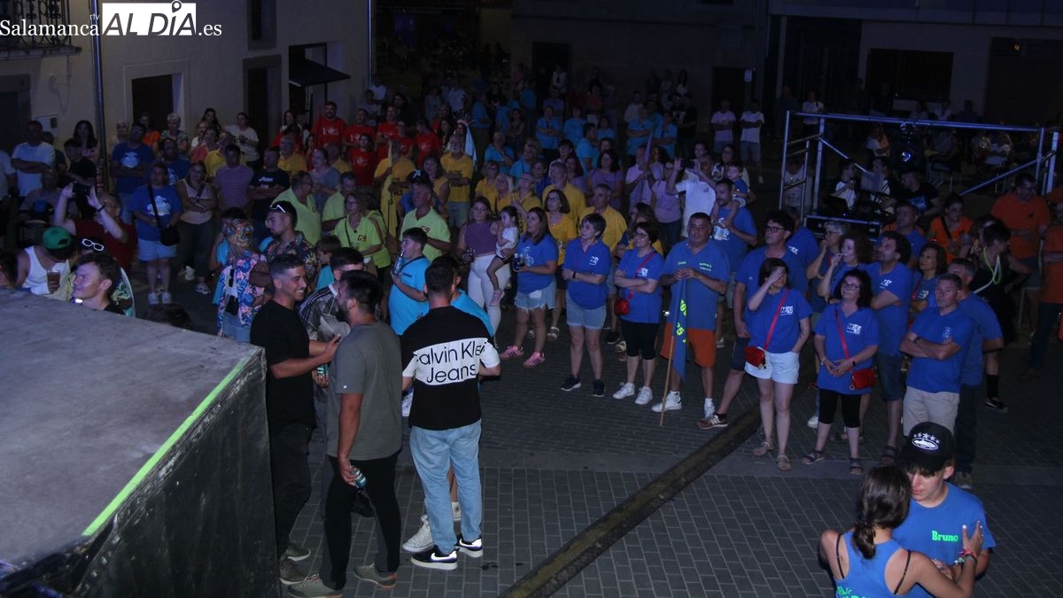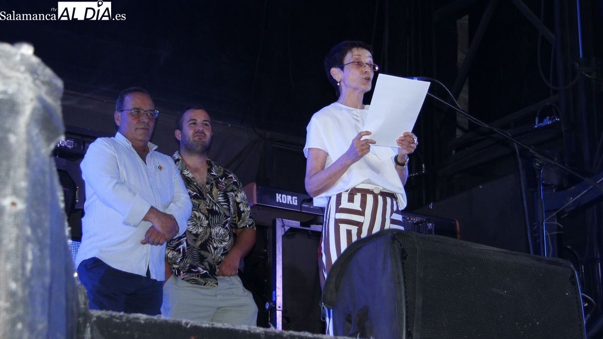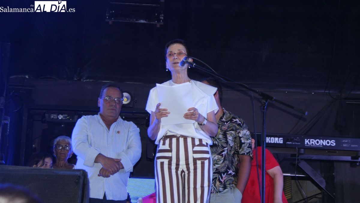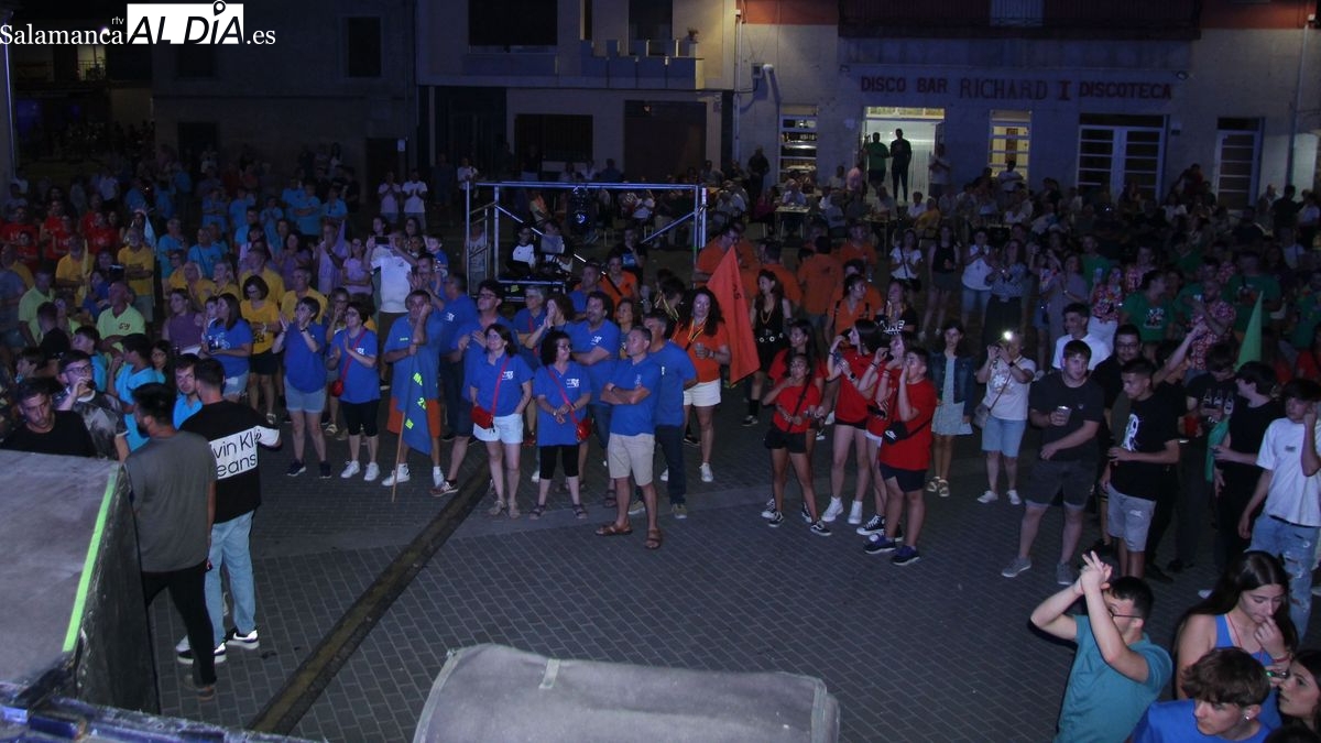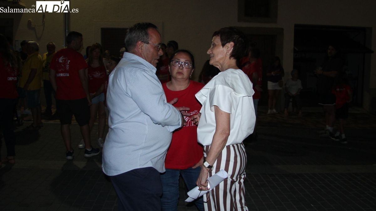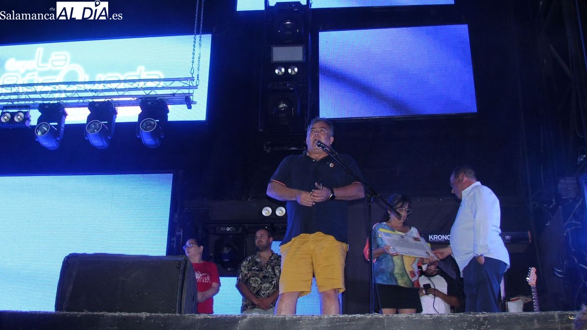 Ya con los peñistas en la plaza, el alcalde, Jesús Pata, saludó a los asistentes desde el escenario y dio las "gracias a las personas que han colaborado en la organización de estas fiestas". A continuación, el alcalde presentó a la encargada de pronunciar el Pregón de fiestas de 2025, "una persona que ha dedicado su vida durante 40 años a Hinojosa de Duero, la farmaceútica María Victoria Melgar Velasco".