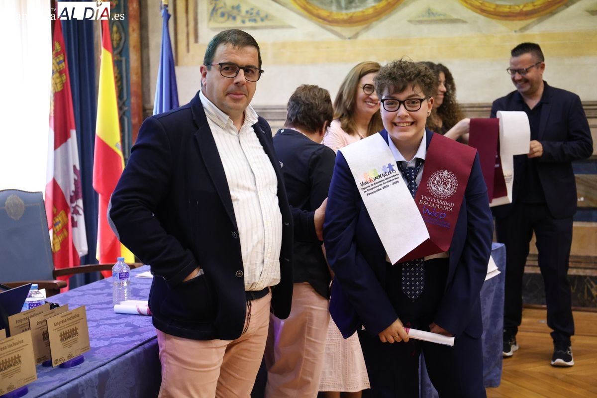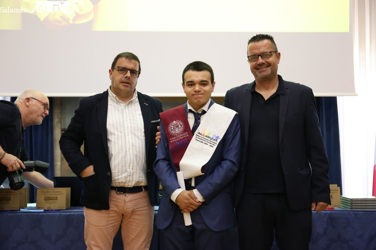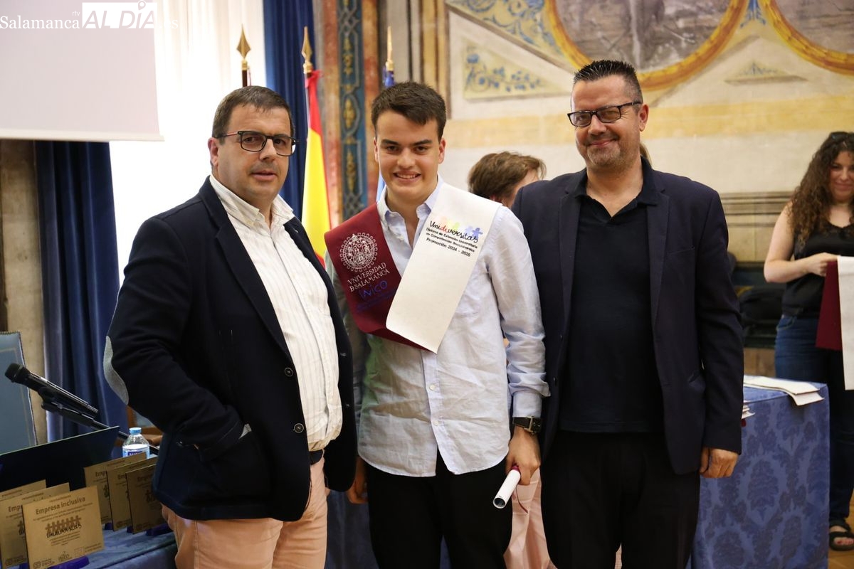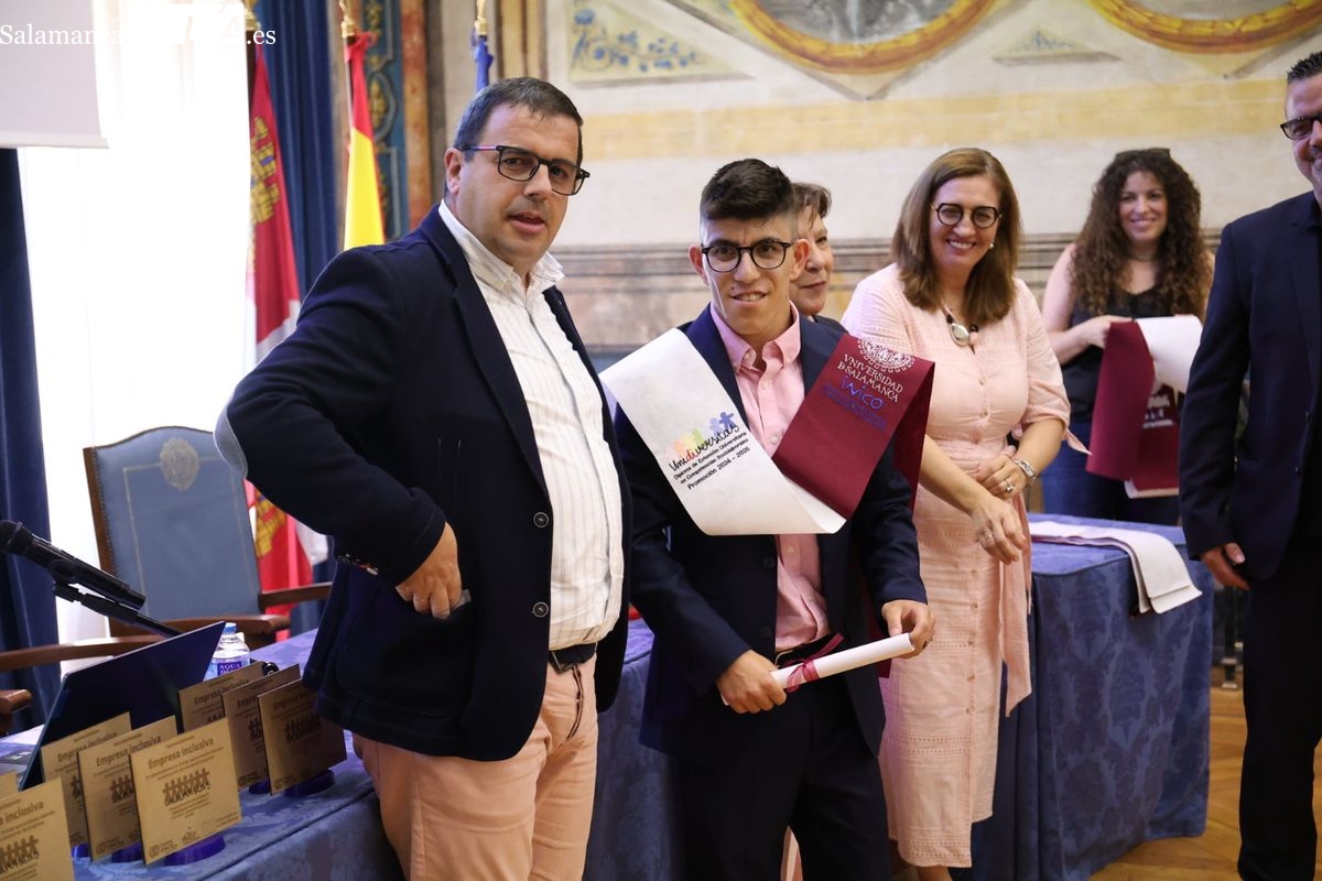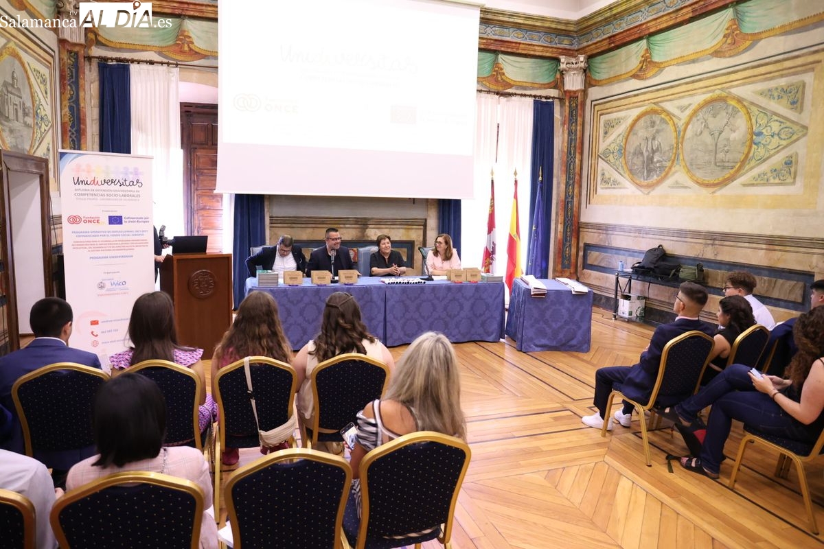 El evento ha contado con la presencia de Emiliano Díez, director del Instituto Universitario de Integración en la Comunidad (INICO) y también director del título propio UNIdiVERSITAS. Junto a él, Isabel Martínez Lozano, directora de programas con universidades y promoción del Talento Joven de Fundación ONCE, entidad financiadora, así como José Manuel García Mateos, director de Operaciones del Grupo Limcasa, mostrando el apoyo del tejido empresarial.