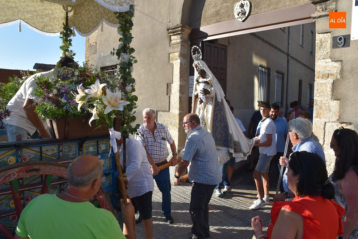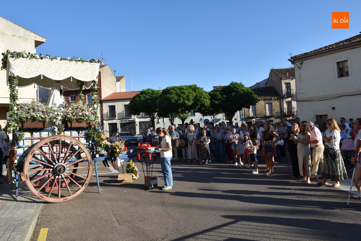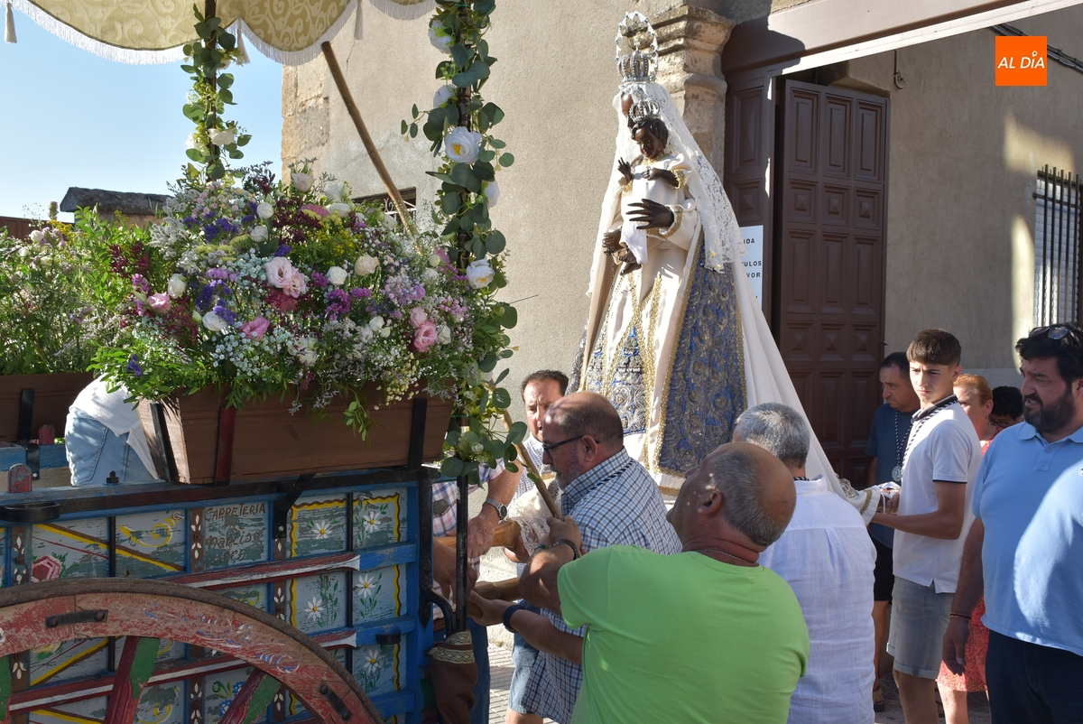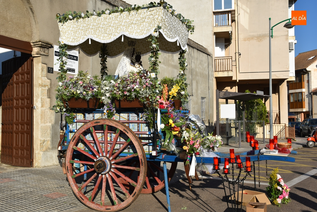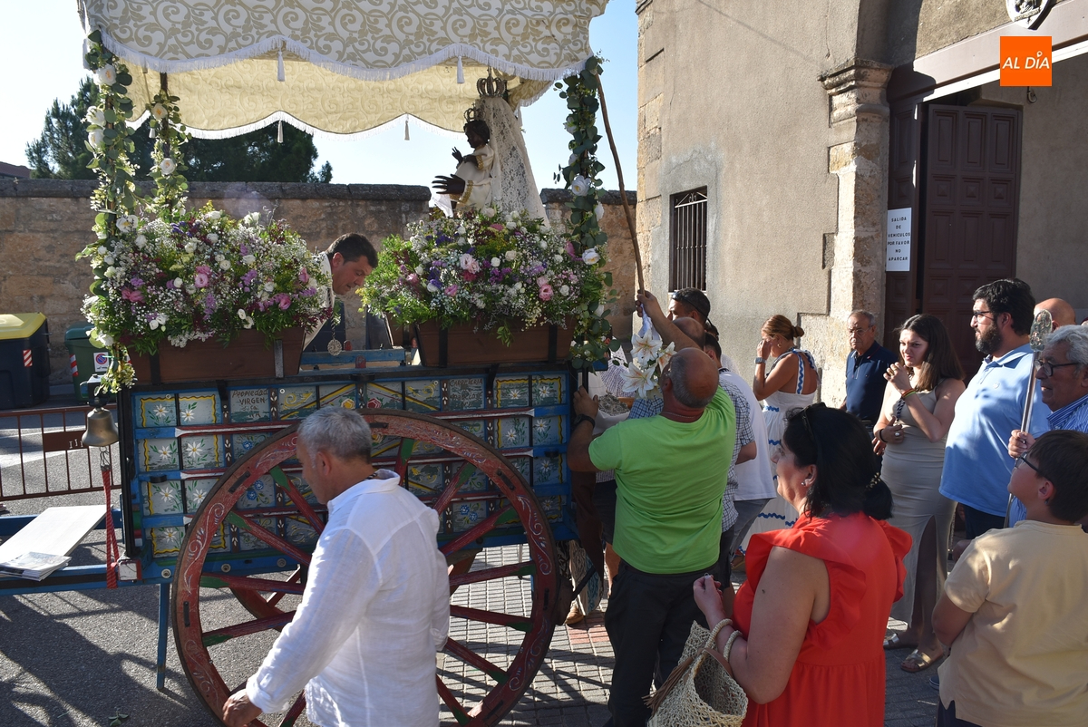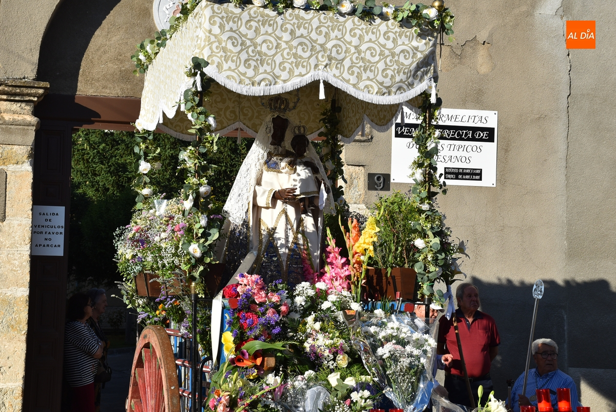 Varias mujeres fueron las encargadas de portar la imagen en el interior del Convento, tomando el relevo varios hombres para proceder a sacarla a la calle y meterla en la misma carreta en la que irá en Romería (que lucía en su parte trasera un capote que ha sido donado por Verónica María Sastre). A partir de ese momento, todos aquellos que quisieron pudieron depositar en torno a la misma las flores que habían llevado (además se pudieron encender velas y recoger las revistas de la Romería de este año).