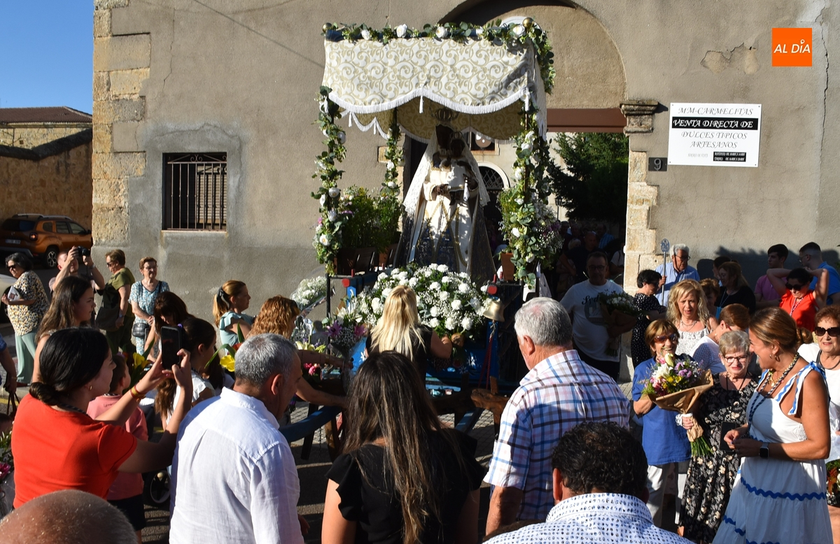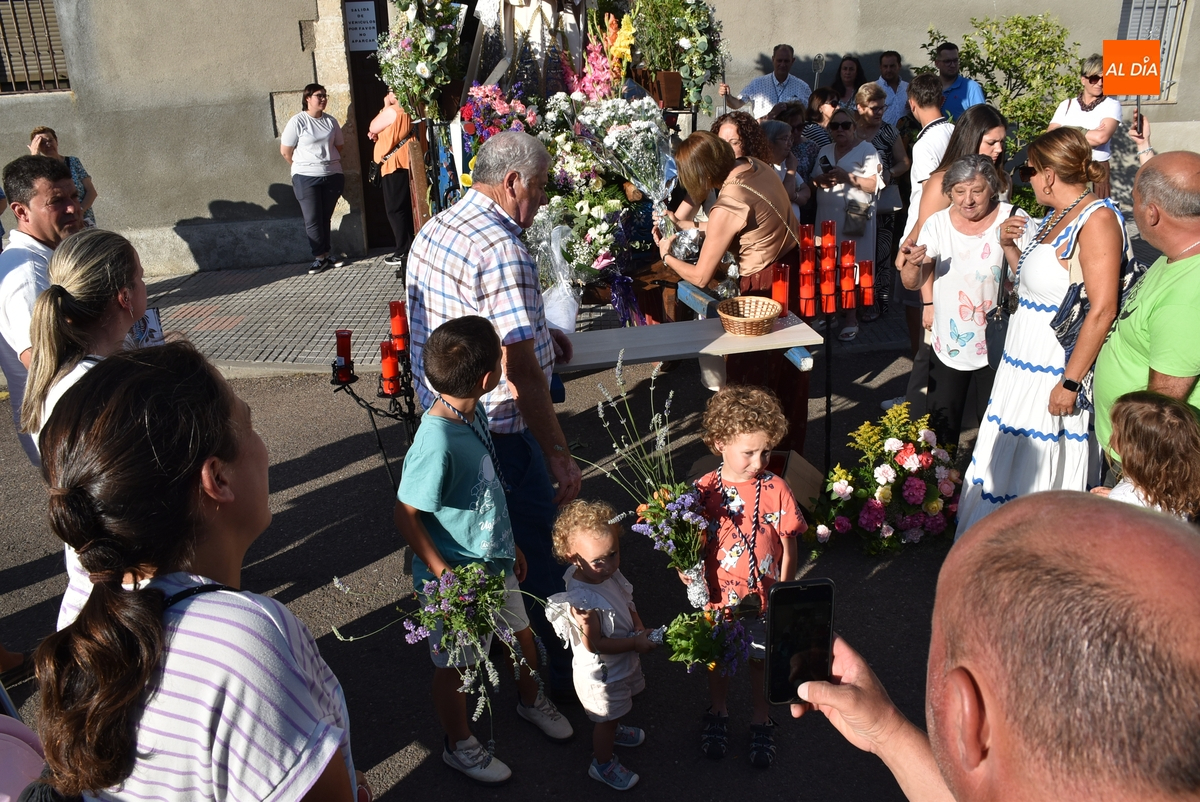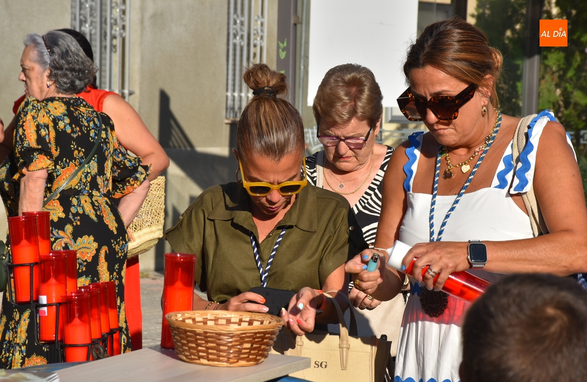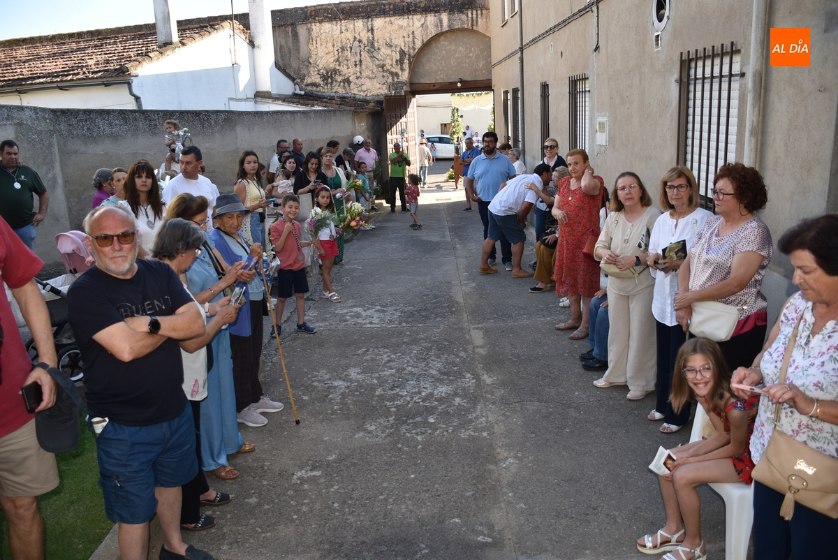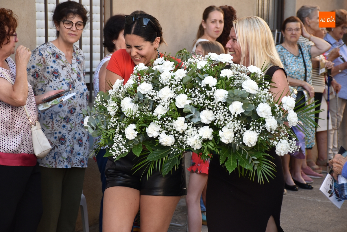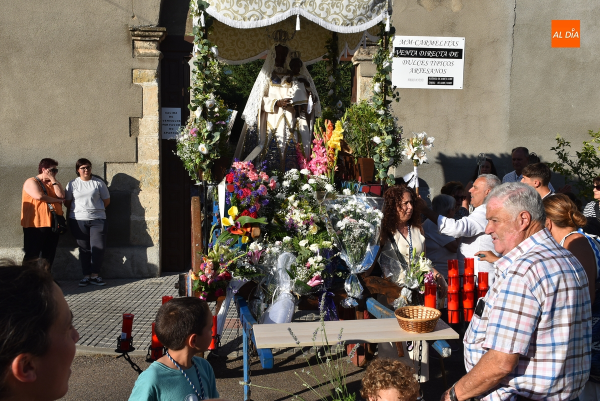 Varias mujeres fueron las encargadas de portar la imagen en el interior del Convento, tomando el relevo varios hombres para proceder a sacarla a la calle y meterla en la misma carreta en la que irá en Romería (que lucía en su parte trasera un capote que ha sido donado por Verónica María Sastre). A partir de ese momento, todos aquellos que quisieron pudieron depositar en torno a la misma las flores que habían llevado (además se pudieron encender velas y recoger las revistas de la Romería de este año).