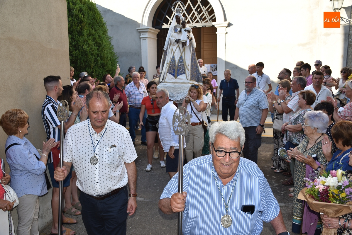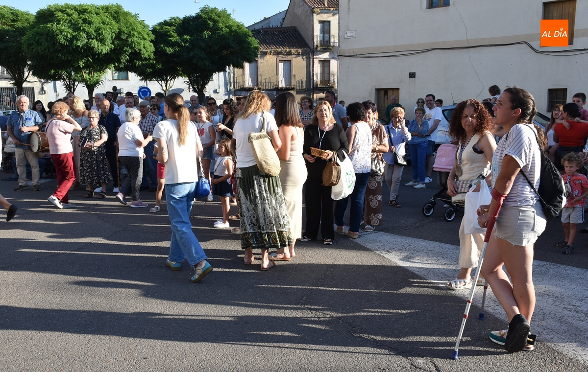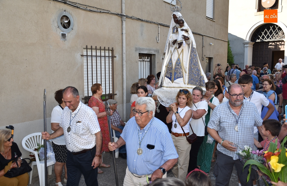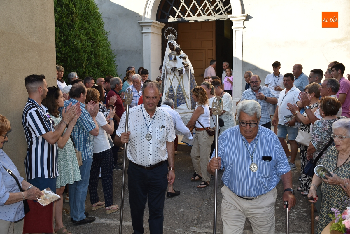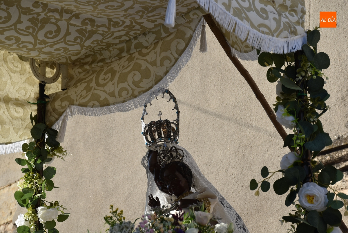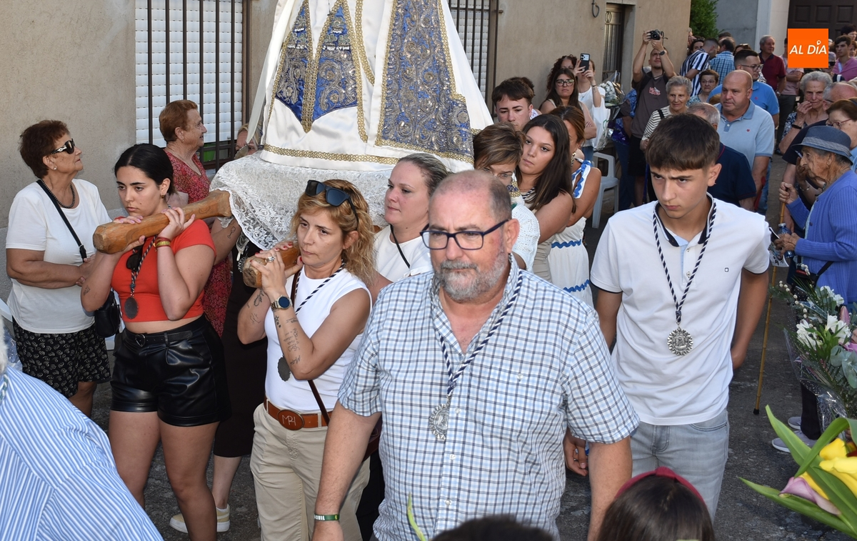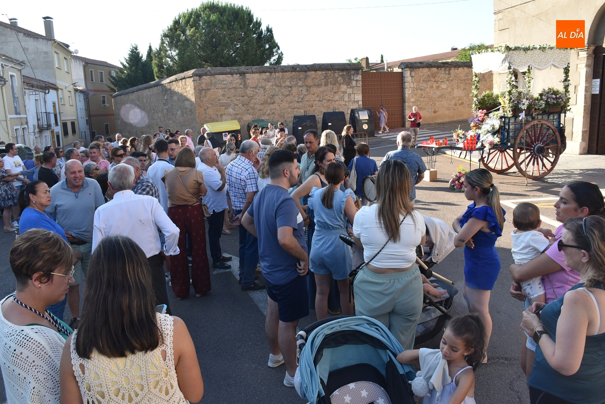 Varias mujeres fueron las encargadas de portar la imagen en el interior del Convento, tomando el relevo varios hombres para proceder a sacarla a la calle y meterla en la misma carreta en la que irá en Romería (que lucía en su parte trasera un capote que ha sido donado por Verónica María Sastre). A partir de ese momento, todos aquellos que quisieron pudieron depositar en torno a la misma las flores que habían llevado (además se pudieron encender velas y recoger las revistas de la Romería de este año).