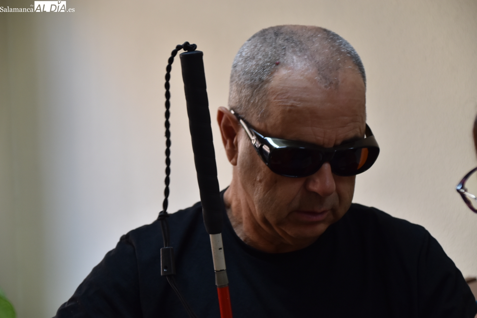 Cada lunes, Ángel viaja desde su pueblo hasta Salamanca, para acudir a la sede de la ONCE. “Voy hasta Vitigudino y desde allí vengo en autobús hasta Salamanca”, explica. Una vez en Salamanca, concretamente en la estación de autobuses, un voluntario le está esperando y le acompaña hasta la sede de la ONCE. Este acompañamiento es crucial ya que en la estación, “como hay un panel grande que tiene muchas salidas, él no las ve”.