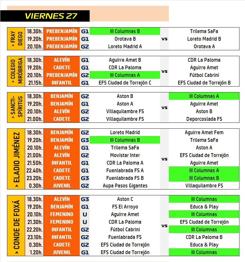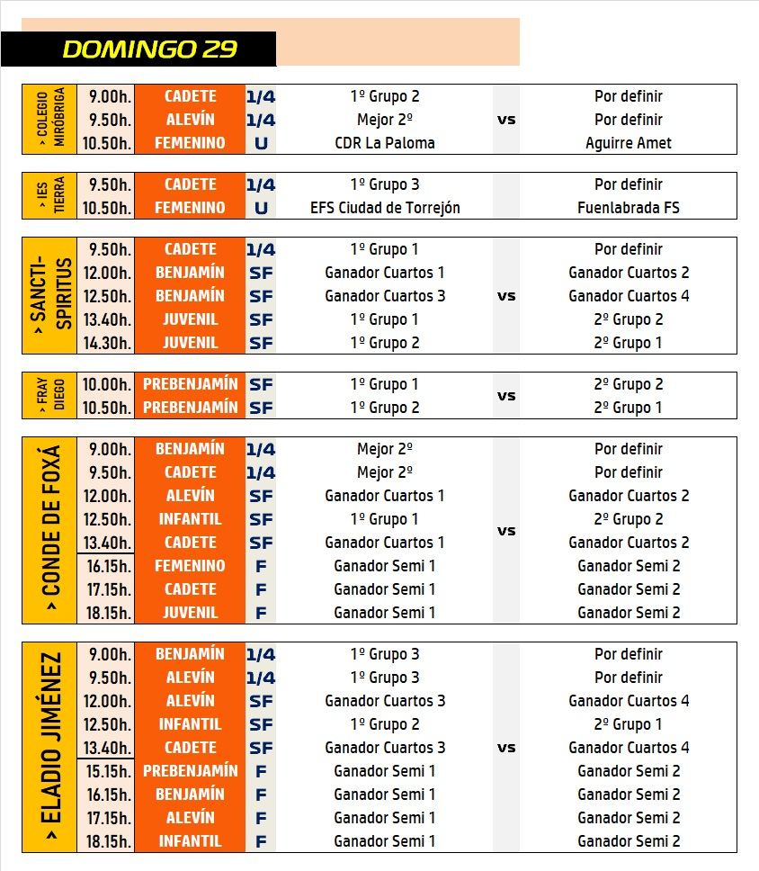 En total, está previsto que se disputen 128 partidos (incluido uno de exhibición), siendo la jornada central el sábado, para el que están programados 72 encuentros (18 de ellos en Conde de Foxá, desde las 9.00 horas hasta pasada las 2 de la madrugada, con apenas un parón de 15.00 a 17.00 horas); mientras que el domingo habrá 29 (casi todos de las fases finales) y este viernes 27 (en 5 sedes, hasta pasadas las 2 de la madrugada).